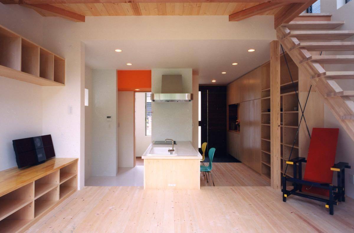 限られたスペースを有効に使うためリビングスペースは座の空間とし、アイランドキッチンを中心としたコミニュケーションの場として提案した。