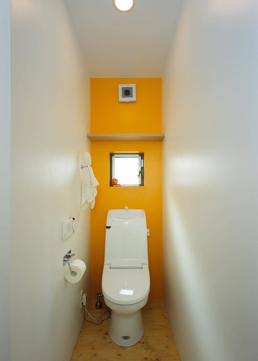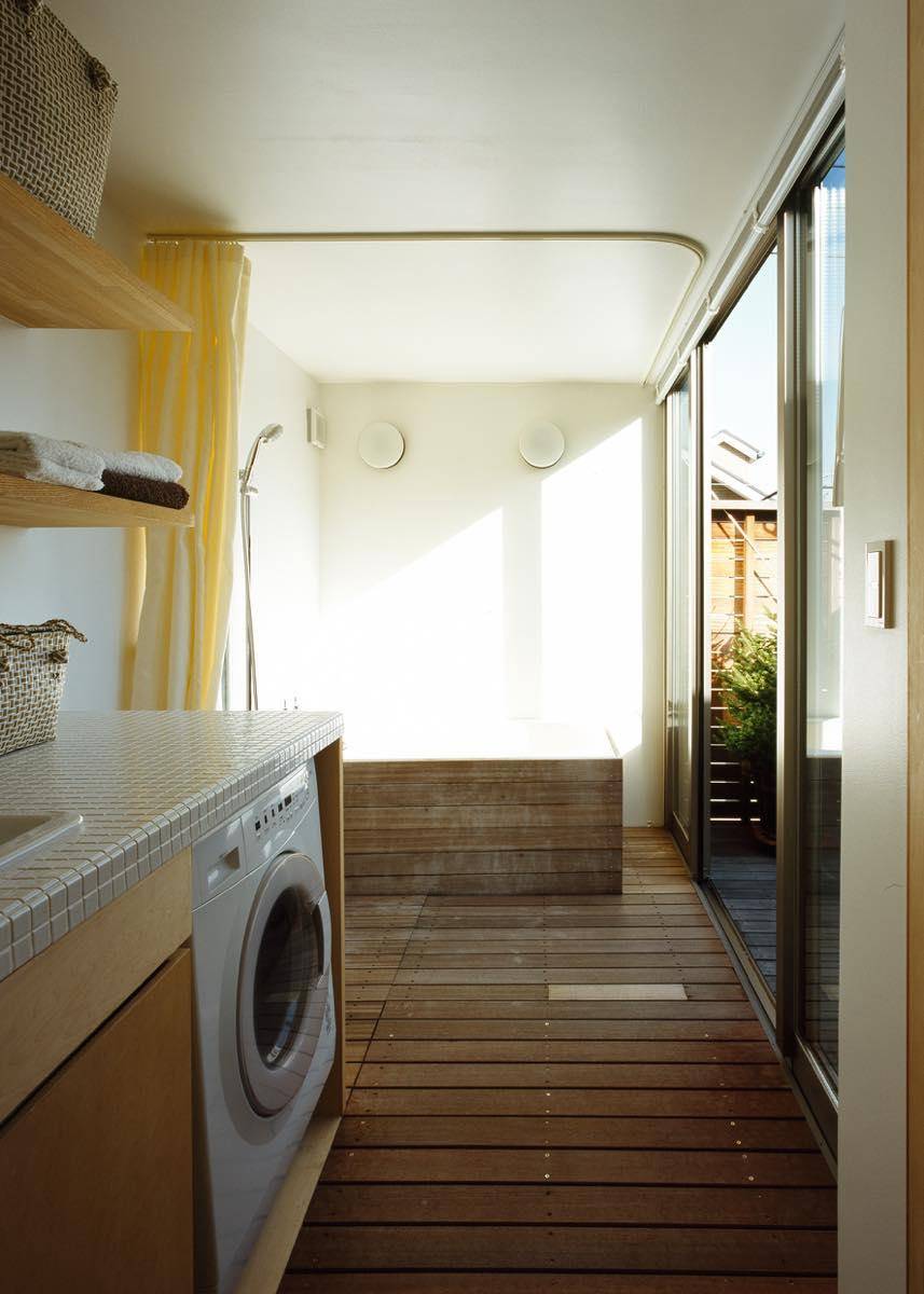 洗濯物が大好きな奥さんの要望で、この家の一番日当りが良い場所に道路側南東面に4帖大のバスコートを配置、そこに面したお風呂にもサンサンと陽が注ぐ。日当りの良いお風呂は実に気持ちが良く、ひと続きの水廻りは狭さを感じさせない。下部は玄関前のピロティとなっていて、ゆとりを感じさせるスペースになっている。