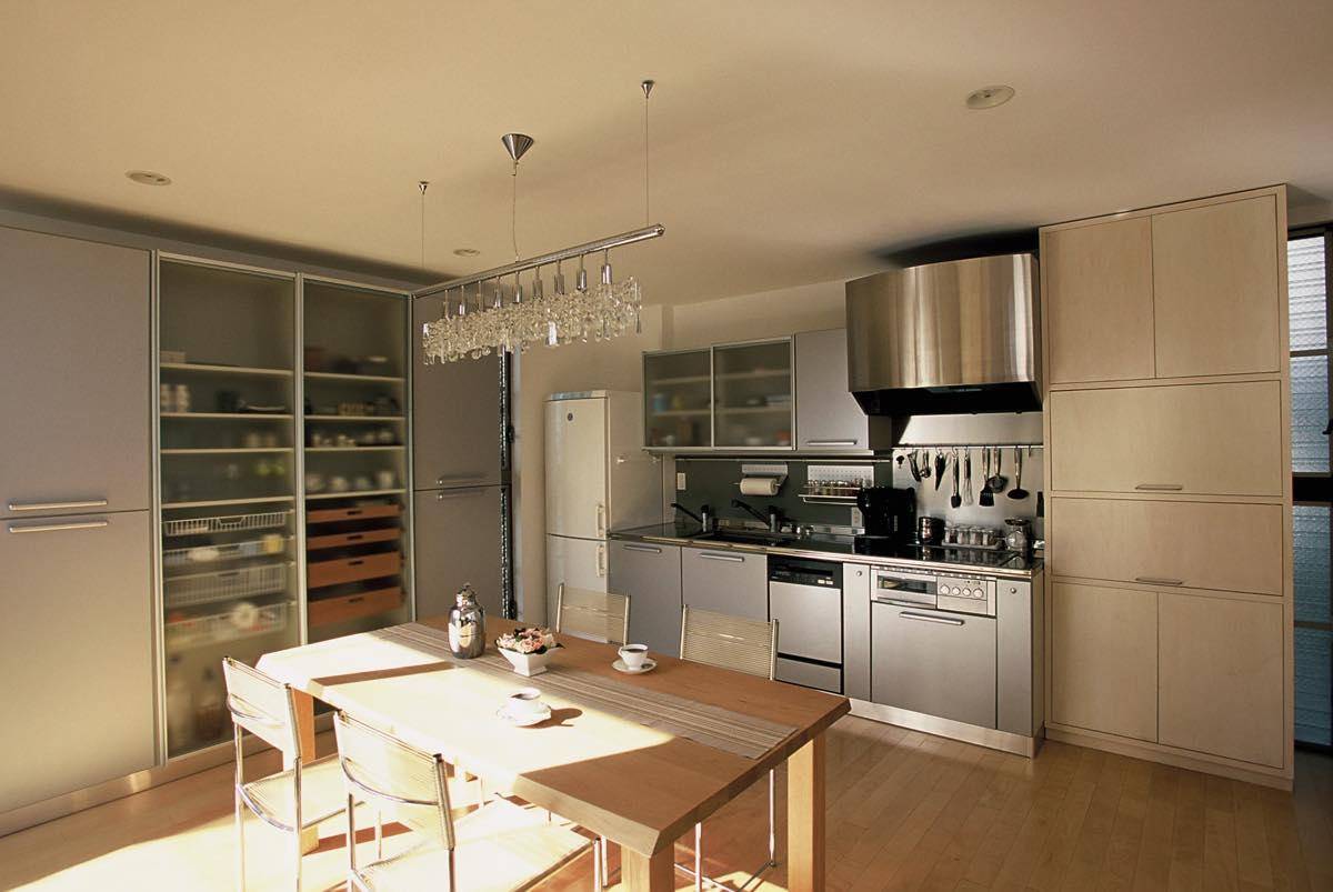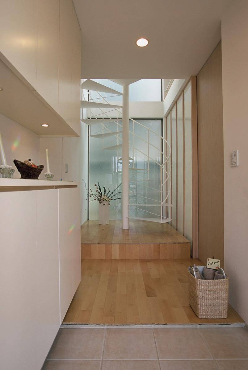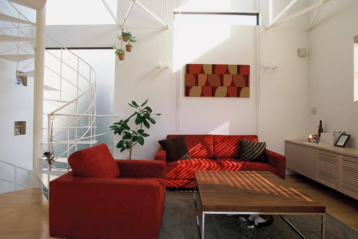 アロマ教室併用、木と鉄骨を組み合わせた構造の3階建て住宅です。3階の床を屋根から吊って支えることで2階リビング内にでてくる柱を無くし、スッキリ空間を実現!限られた敷地面積を克服する工夫がさりげなくちりばめられた家です。