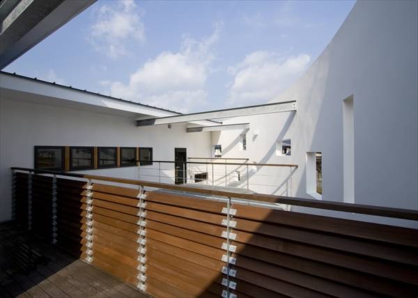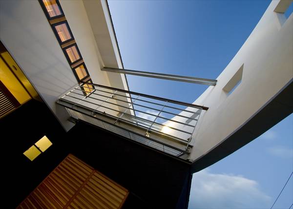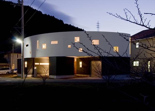 角地に向け曲線のファサードをもつ住宅。 曲面の壁は周辺に柔...