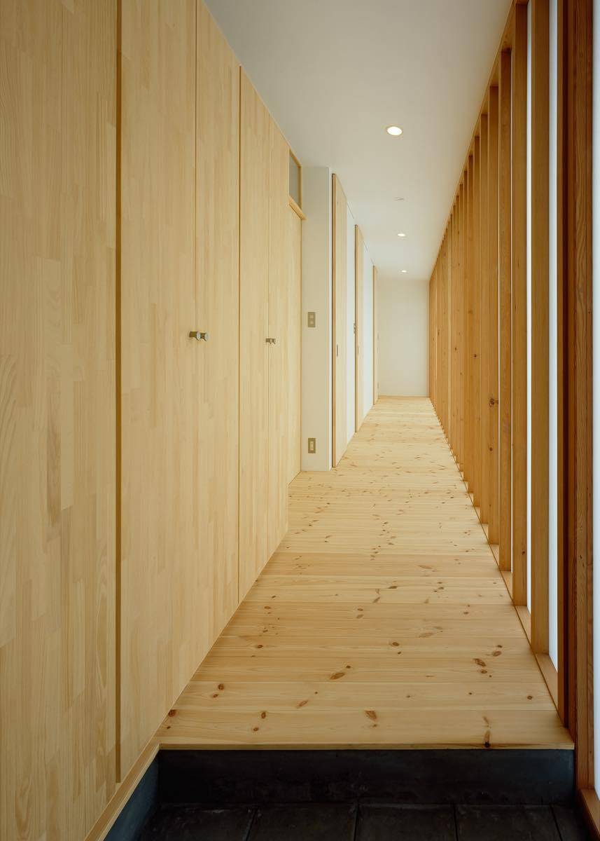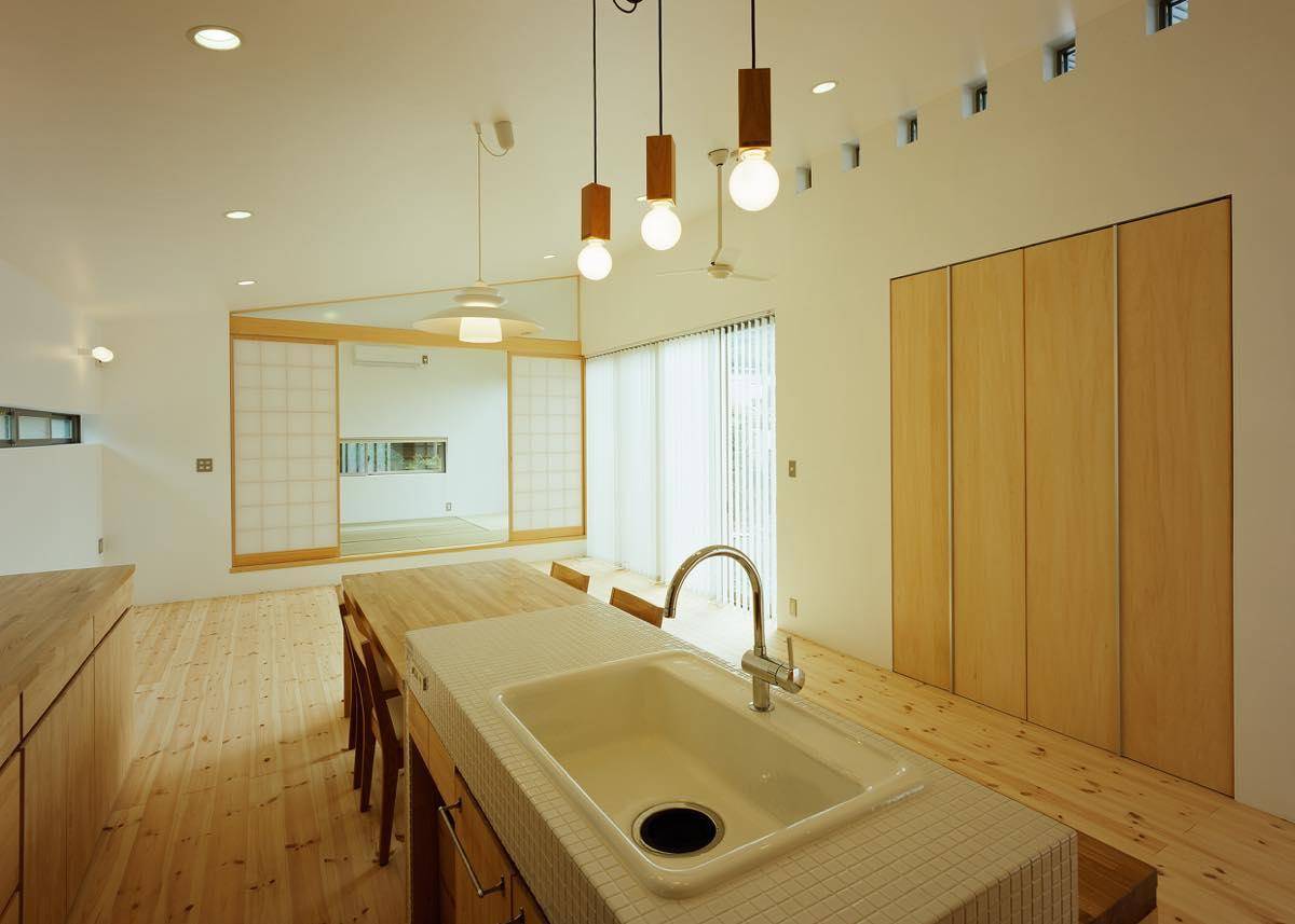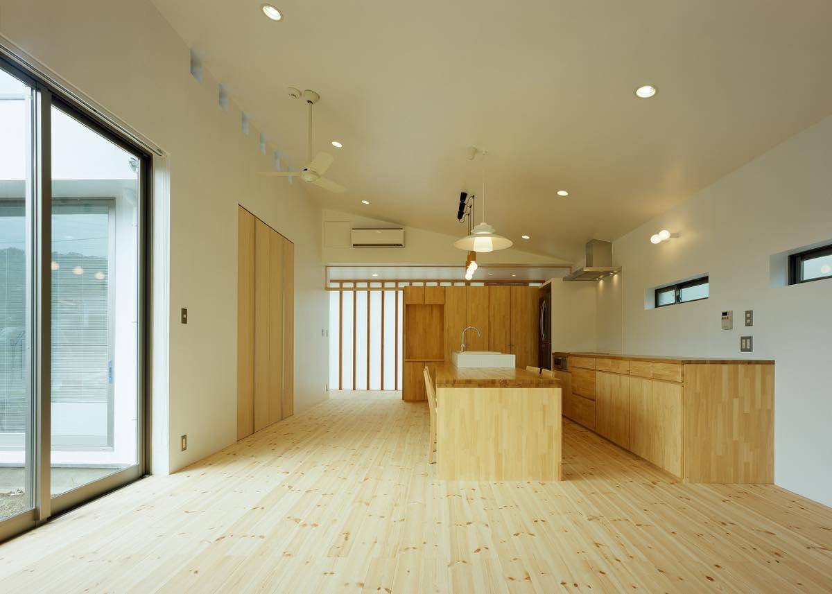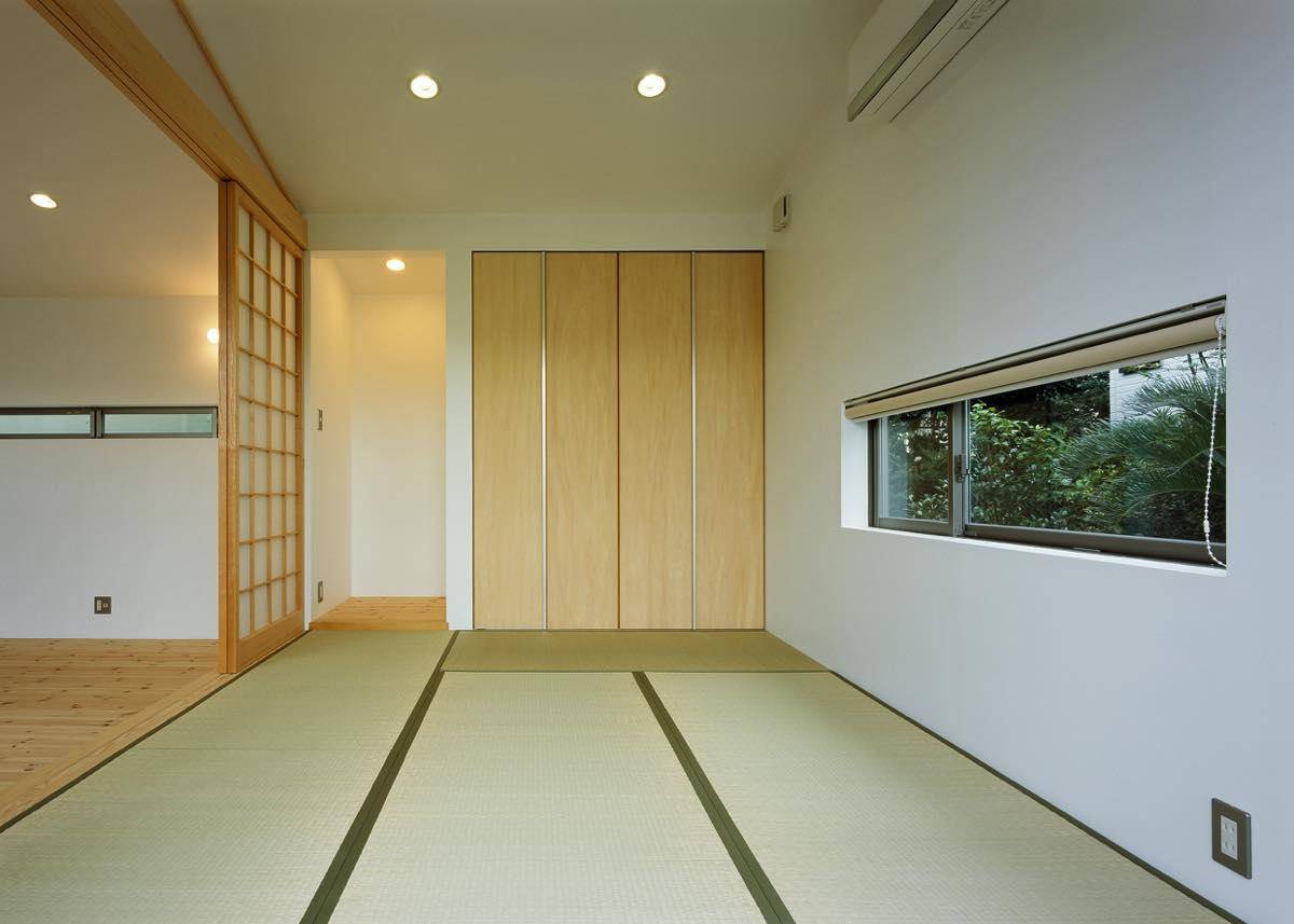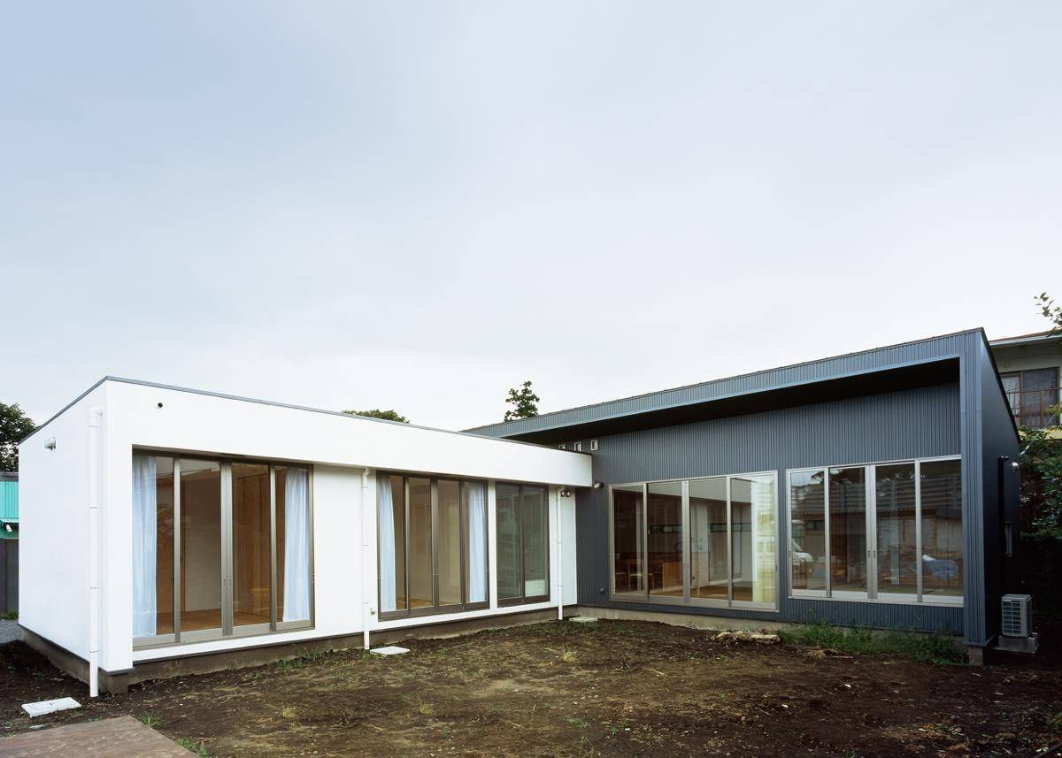 平屋の建物をL型に計画、それぞれのウィングでLDKと個室群にわかれる。中庭を介してLDKと個室はその雰囲気を共有し、家族は互いの存在を感じることができる。