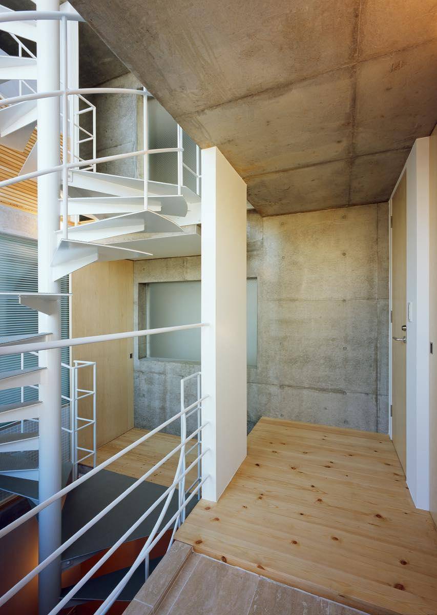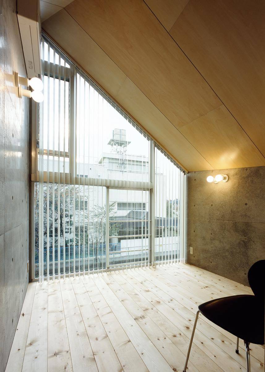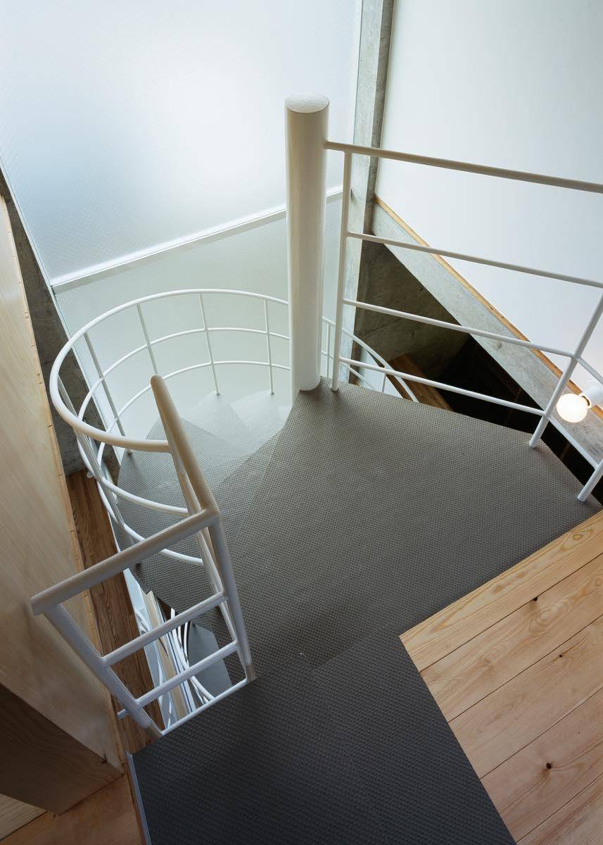 建物は1フロア5坪強で地下を含めた4層から成る延床21坪。一見単純なプランではあるが断面形状は複雑で、敷地の小ささ故の厳しい斜線制限を機能ごとに分節したスキップフロアとすることでクリア、フロアとフロアを階段が繋ぐことによって構成される。レベル差と螺旋階段が空間に豊かな視覚的変化を与え、最上階では独特の屋根形状が天に通ずるかのような印象をもたらす。