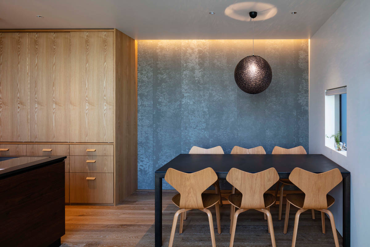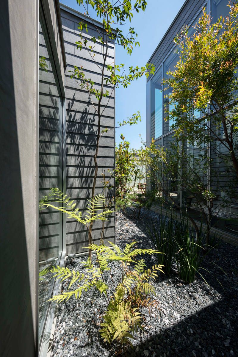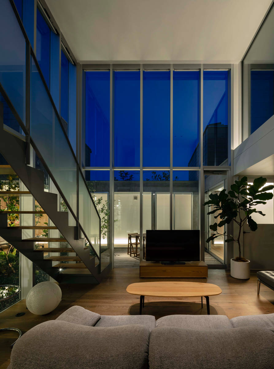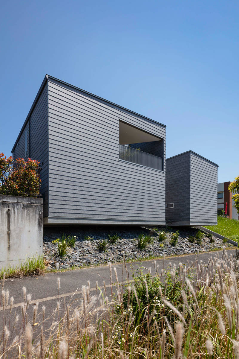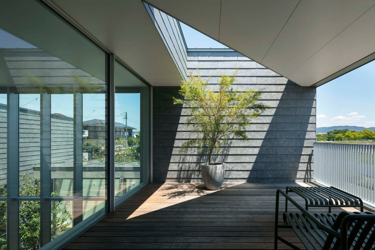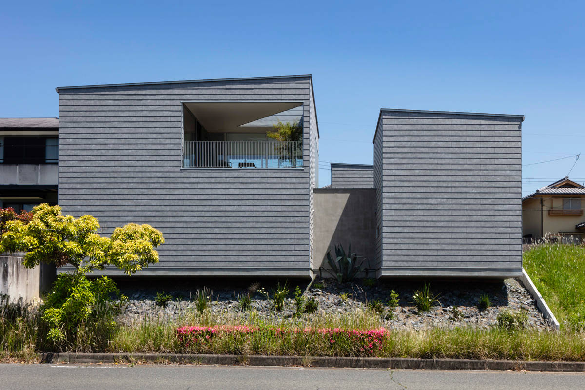 京都府木津川市、近鉄高の原駅周辺に造成された住宅地の一角に位置する敷地は四隅がすべて直角の完全な整形地。南北2面接道であるが南側は約2mの高低差の法面となっている。敷地から手がかりとなる要素がほぼ無いと言う条件の下、施主からの「プライバシー重視」という要望を意識した中庭型の計画とした。住まい手は3世代同居。各世代のプライバシーをそれぞれ正方形の平面を持つ3つの棟に分けることでかたちにし、それらをつなぐ正方形の回廊が自由なつながりをつくり出す。それらに囲われてできた中庭が適度な距離感を生み出している。ウッドデッキと緑豊かな樹木を配した中庭は大きなガラス開口を介して部屋の一部のようにつながり、外部の視線を遮りながら時間や季節の移り変わりを感じられる空間として中心的な役割を果たしている。また、中庭型にすることで広がった敷地内での建築配置は南側の法面部分にもかかっている。ここはあえて平らに造成せずに法面のまま生かし、浮かんでいるように見せることで建築を特徴づけ、コストの削減にもつなげている