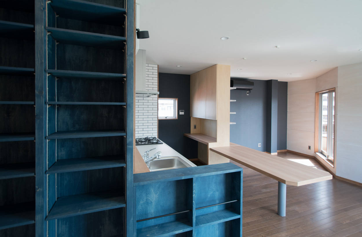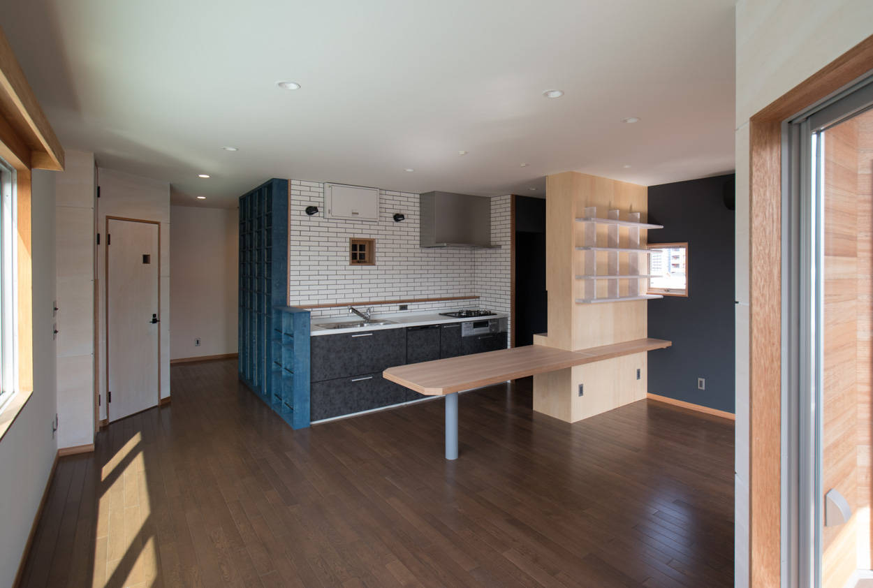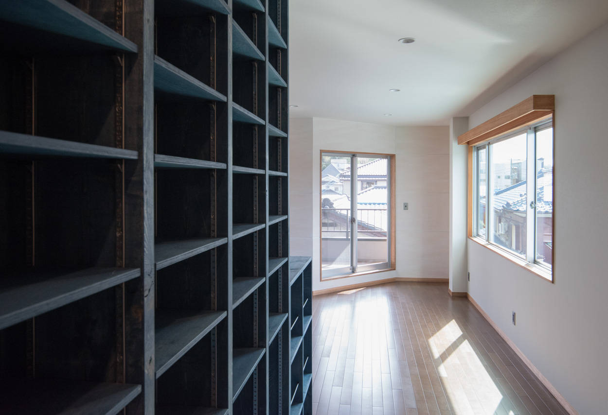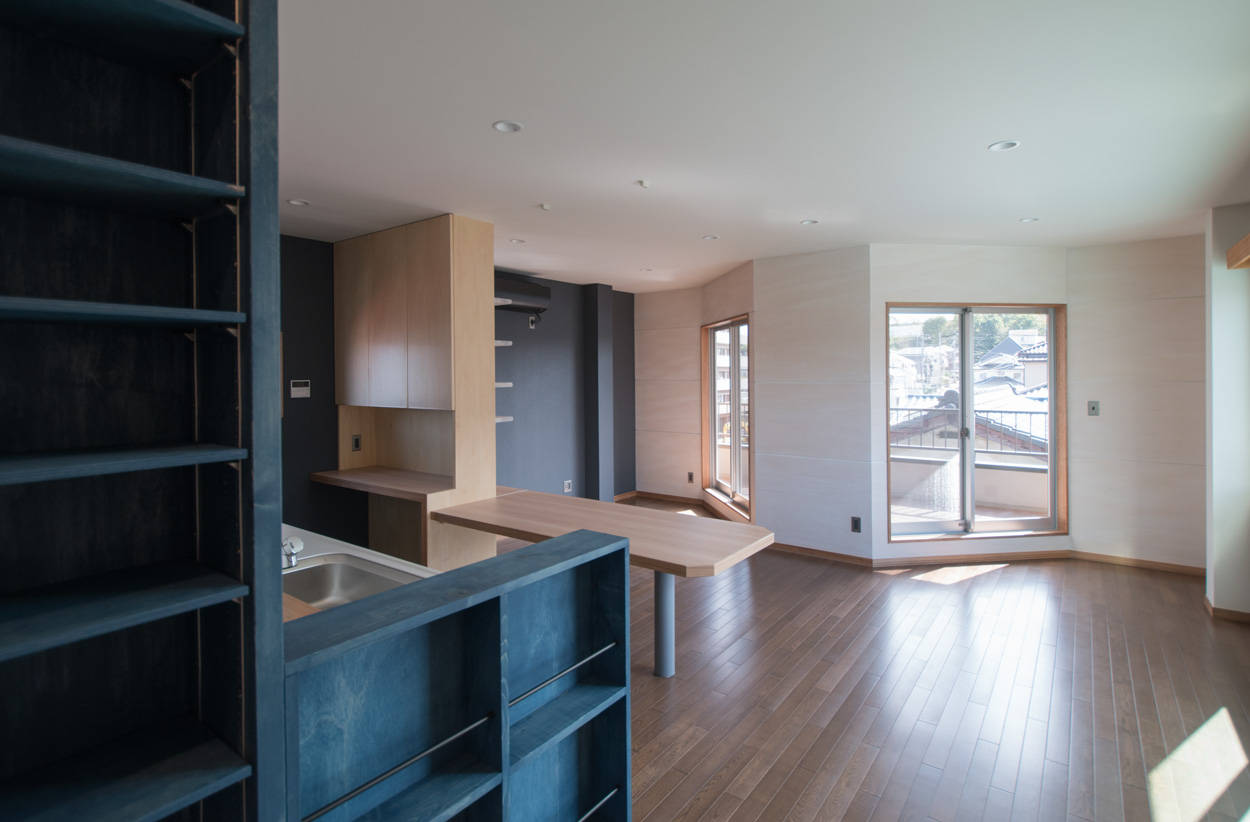 今回、オフィスを住居にリノベーションするにあたって、まず最初に検討したのが、リビングの位置。ちょうど南東側に、大きな開口部と建物の間口全体に伸びた奥行き900mmのバルコニーがあったので、この位置に決定しました。3階の居住空間は外部の空間が限られているため、家の快適性や利便性を向上させる上で、バルコニーの形状はとても重要になってきます。奥行き900mmのバルコニーだと、とても使い勝手が悪く、テーブルや椅子も置けない「ただあるだけのバルコニー」になってしまいます。また、バルコニーを単に広げるだけでは、リビング空間が狭くなってしまいます。バルコニーに居住スペース+収納ゾーンを確保することを考えながら、リビングとの境界線を探っていきました。