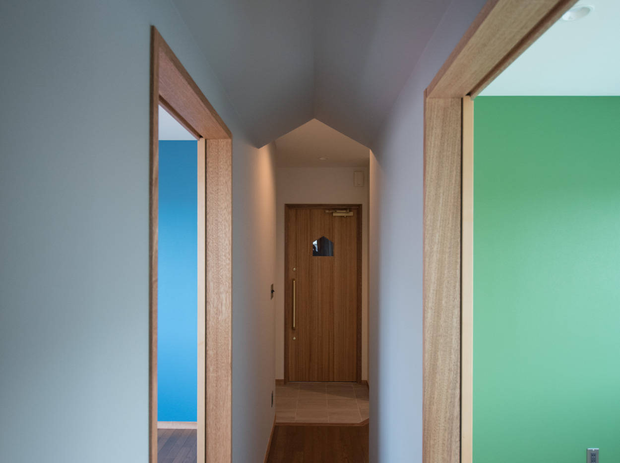 解決法としては、中央部分に45°の入り江をつくることで、リビングと絡み合う形状を計画。壁面を45°角度をつけることによって、必然的に壁の長さがは、1.414倍(√2ですね・・・)になりますから、引き違いのアルミサッシを2箇所挿入することができるのも利点です。