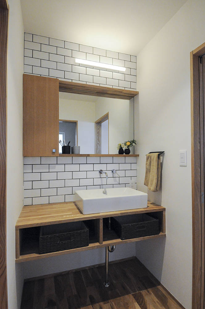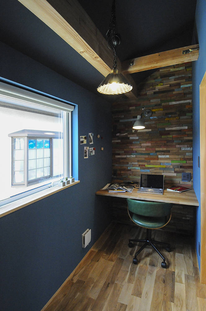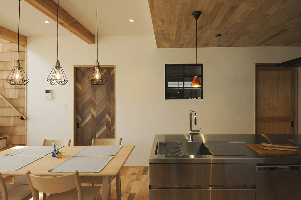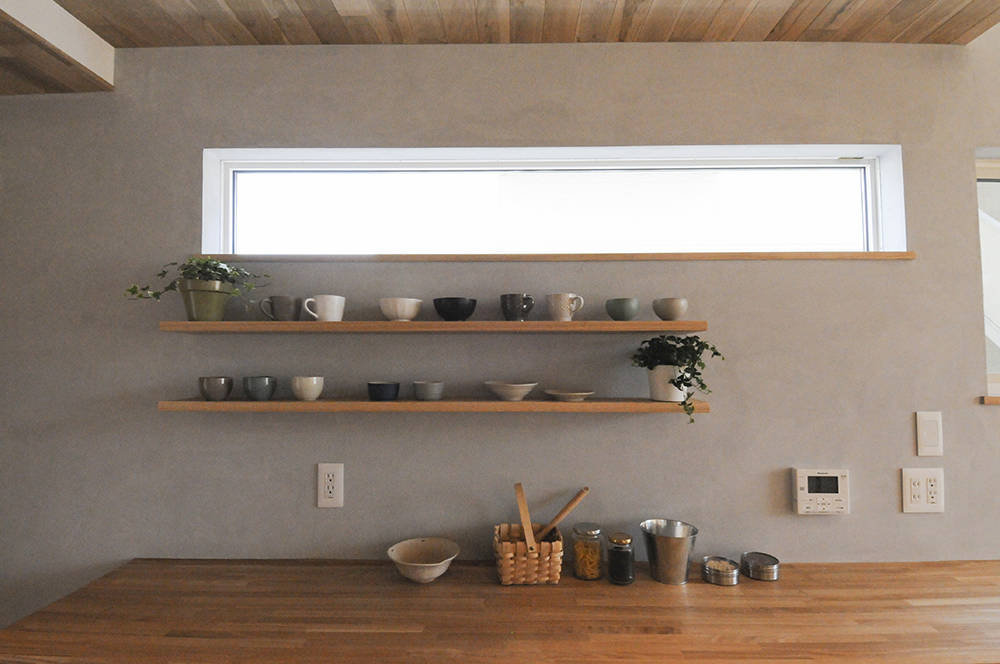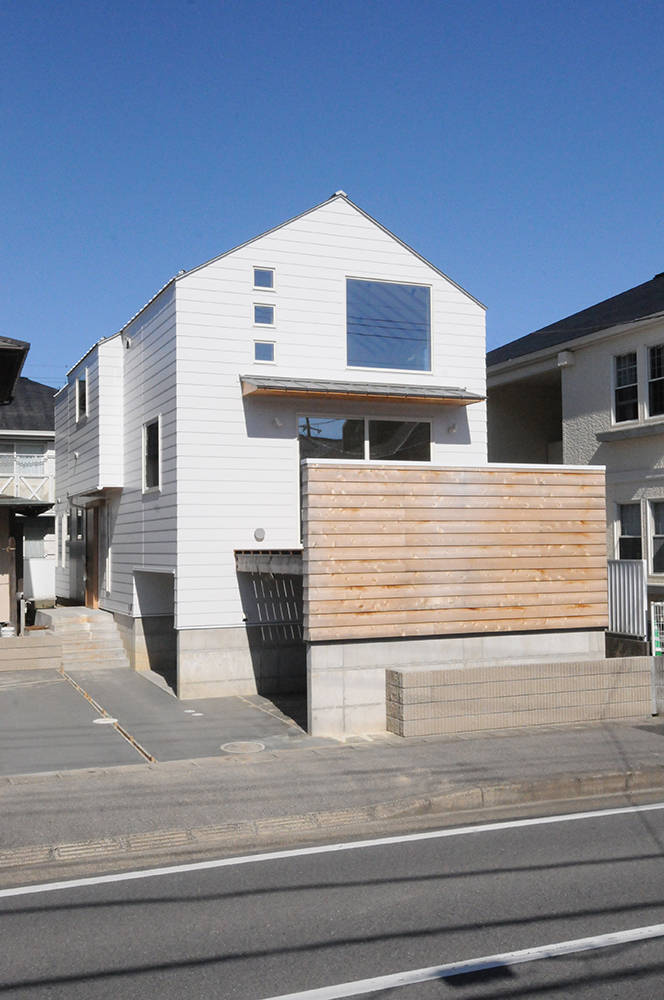 漆喰と無垢材でつくられたお住まいです。通りに面しており駐車用スペースを確保するためスキップフロアーを採用しました。それにより通り沿いからの視線を気にせず開放的に過ごせるリビングも確保できました。米杉の入口の階段を上った先には、お子様のおうちになるよう、屋根を設けています。旦那様の書斎はインダストリアルなデザインを施してあったり、お子様の名前からイメージした月と星の照明計画等、こだわりの詰まったお住まいです。