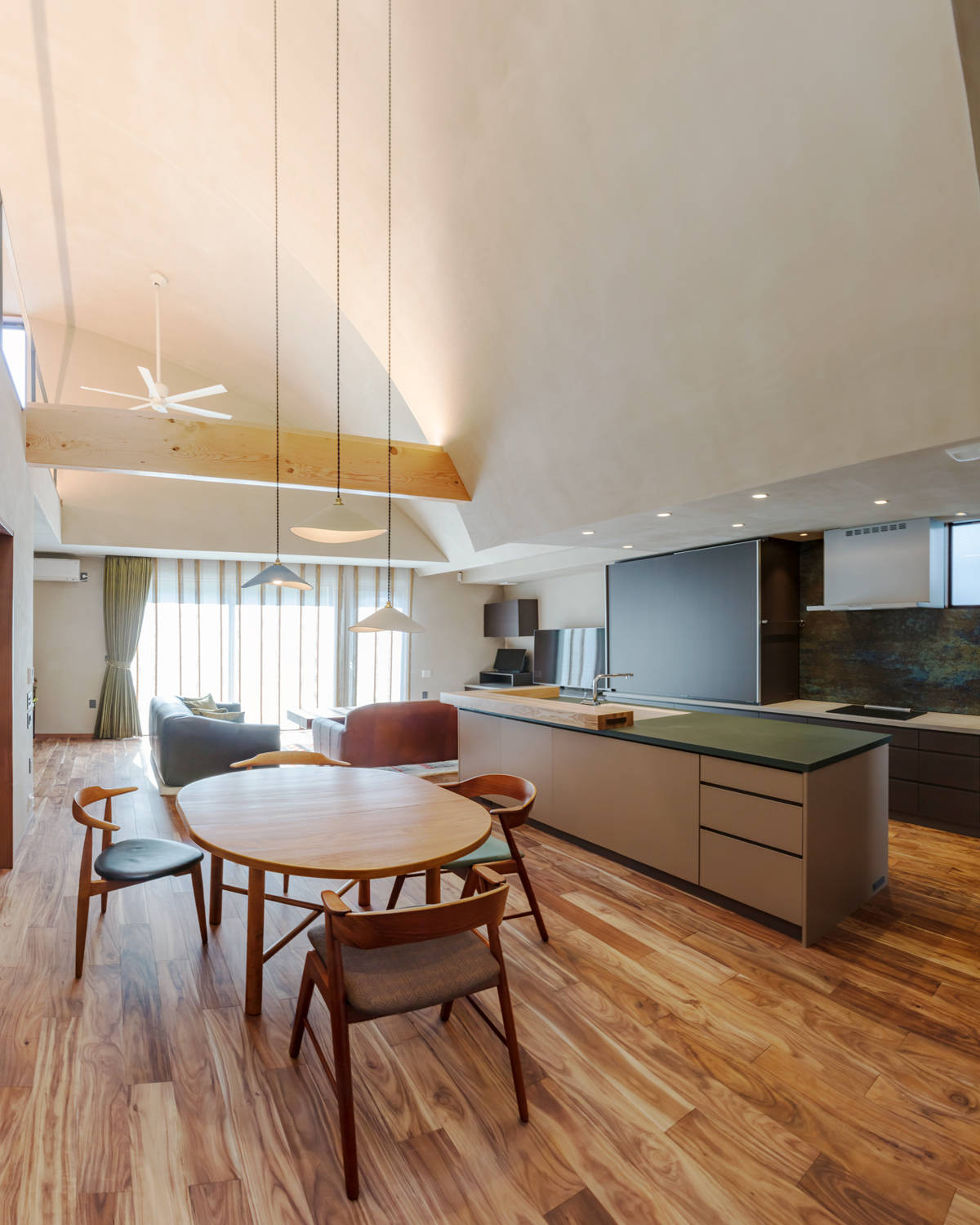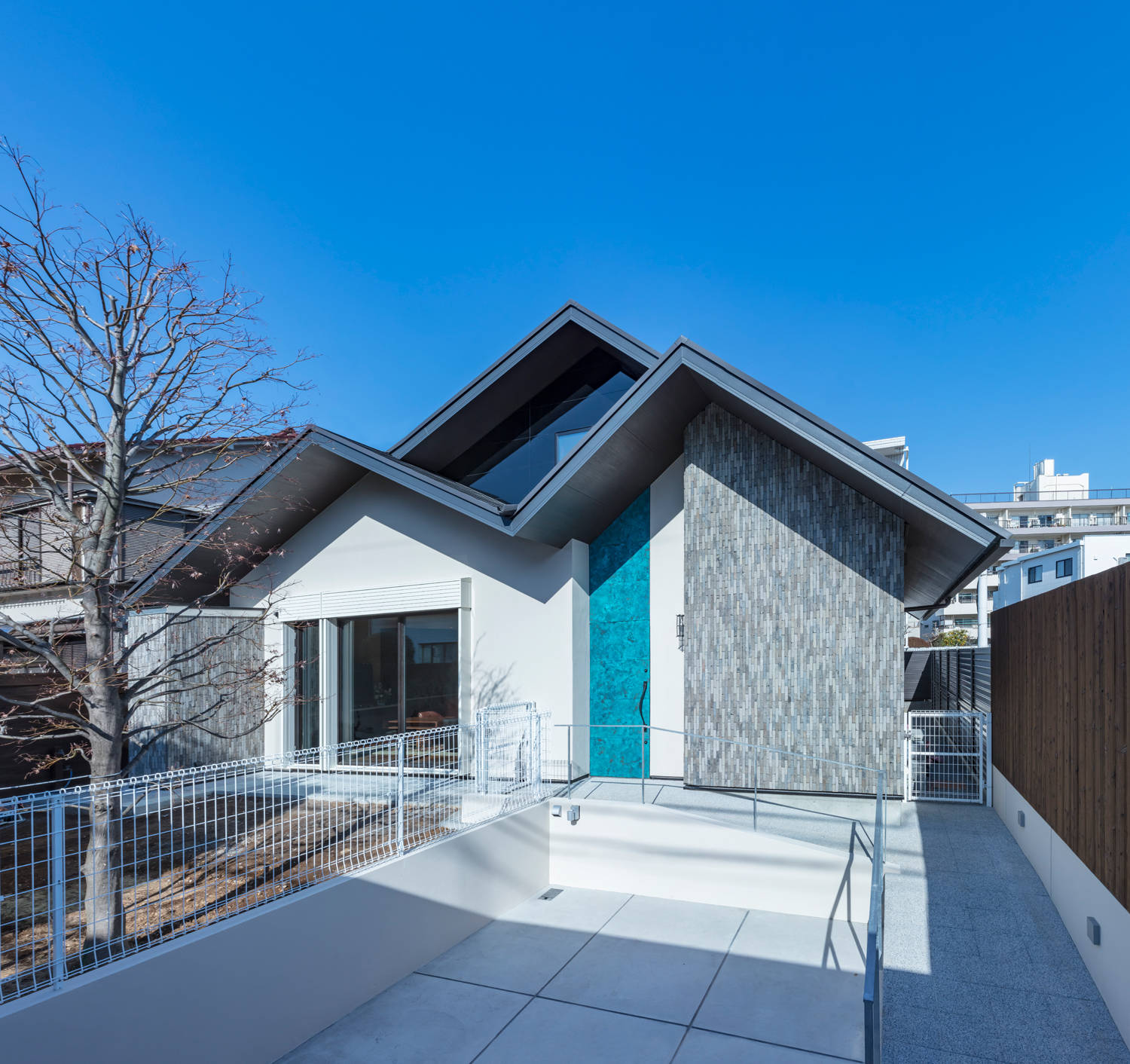 建主が生まれ育ち、長年大切に住まわれていたご自宅の建て替え。 「森の中にいるような場所にしてほしい!」という希望を実現するため時間をかけて話を伺い、イメージを共有。 豊かな空間・木漏れ日・新緑・朝霞などを表現することで、ゆったりと時間が流れる空間となった。 道路との段差は将来のためにスロープを設けガレージから屋根の下を通りながら建物へ入れるようにするなど、住みやすい家にする工夫をいくつも盛り込んでいる。