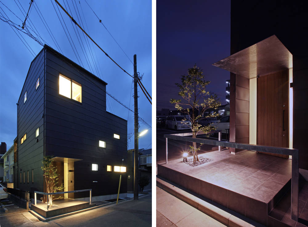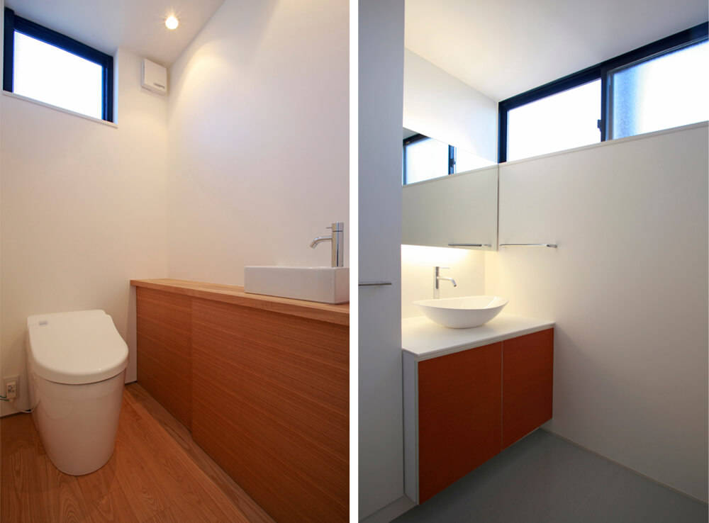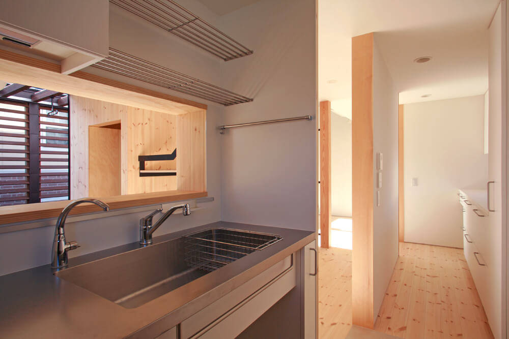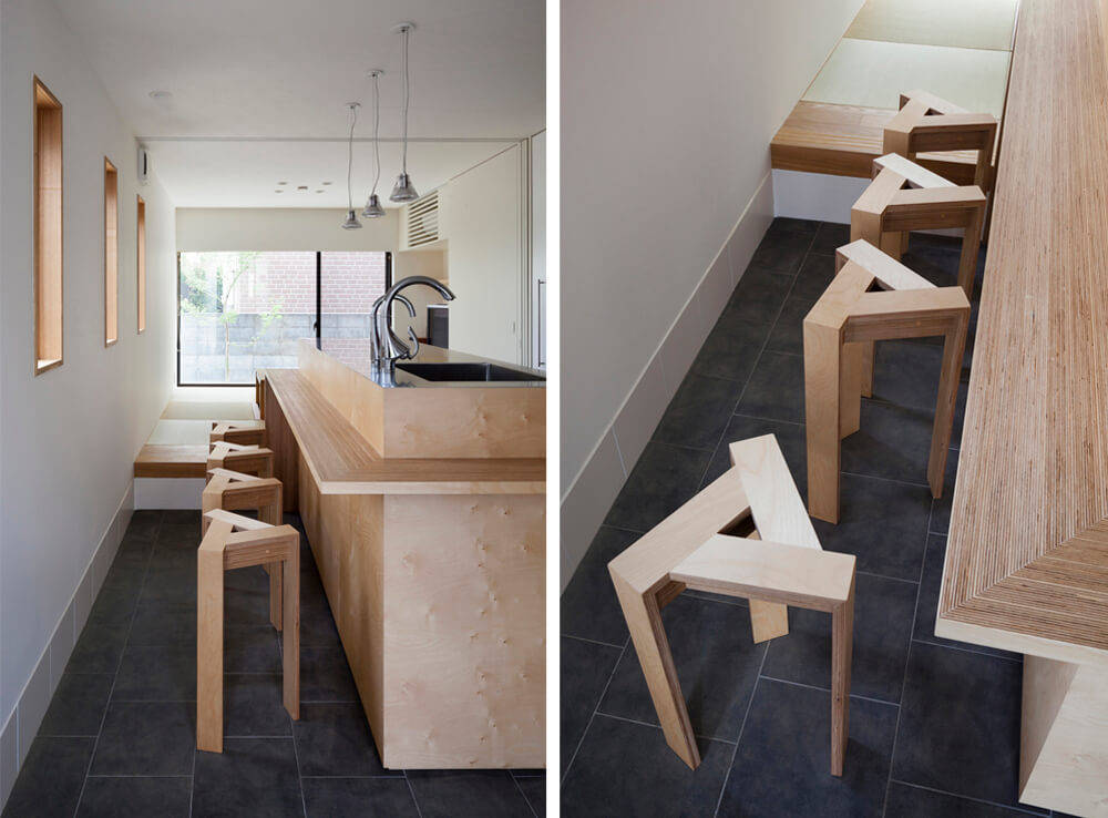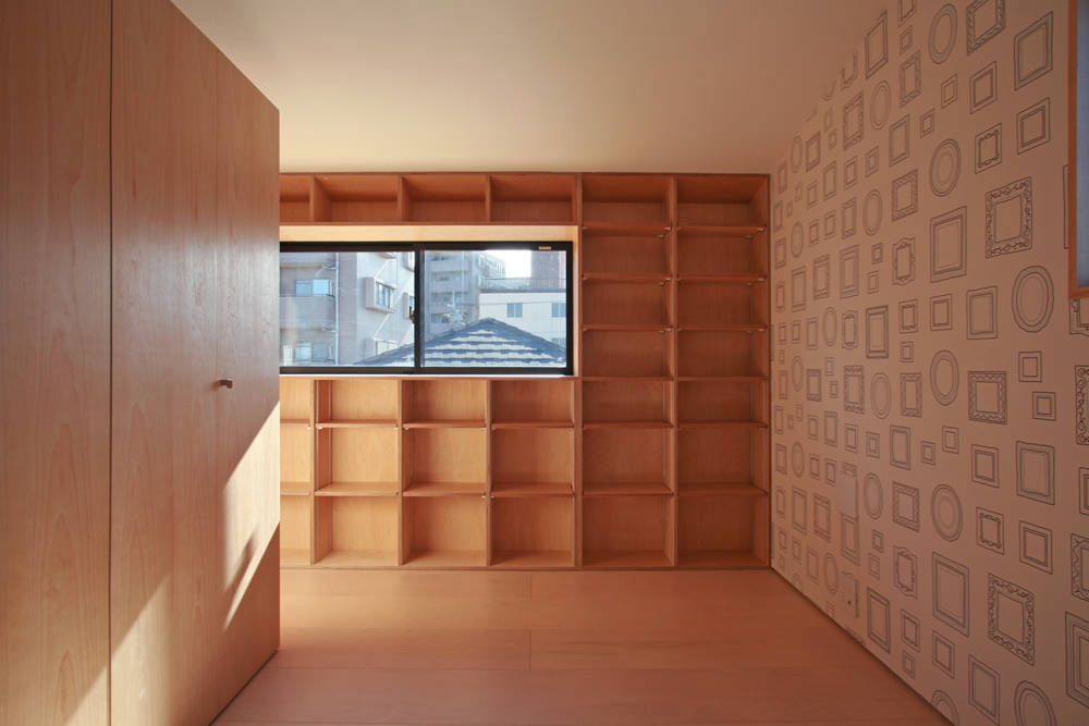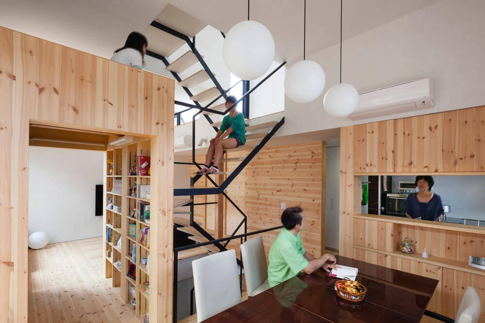 お菓子づくりがご趣味のご主人と片付け上手な奥様は、30坪弱の敷地に二人のお嬢さんと暮らすシンプル&機能的&遊び心いっぱいの住まいを求められました。1階は玄関を兼ねた趣味を生かしたカフェ風の土間空間と和室のパブリックゾーン、寝室と水廻りのプライベートゾーンに分かれた空間で、将来的に1階だけでも最小限の暮らしが出来るようになっています。南側の天井を高くした2階は、中央の階段と収納BOXによりLとDを緩やかに分ける一方で、それぞれが半屋外のデッキテラスと繋がった内外が溶け合った空間が特徴です。スキップフロアとした3階には、ハンモックの吊れる書斎や花火の見えるバルコニー、本棚を造り付けた子供室を廃止、高さ制限を目一杯利用して様々なシーンが生まれる場所を用意しました。