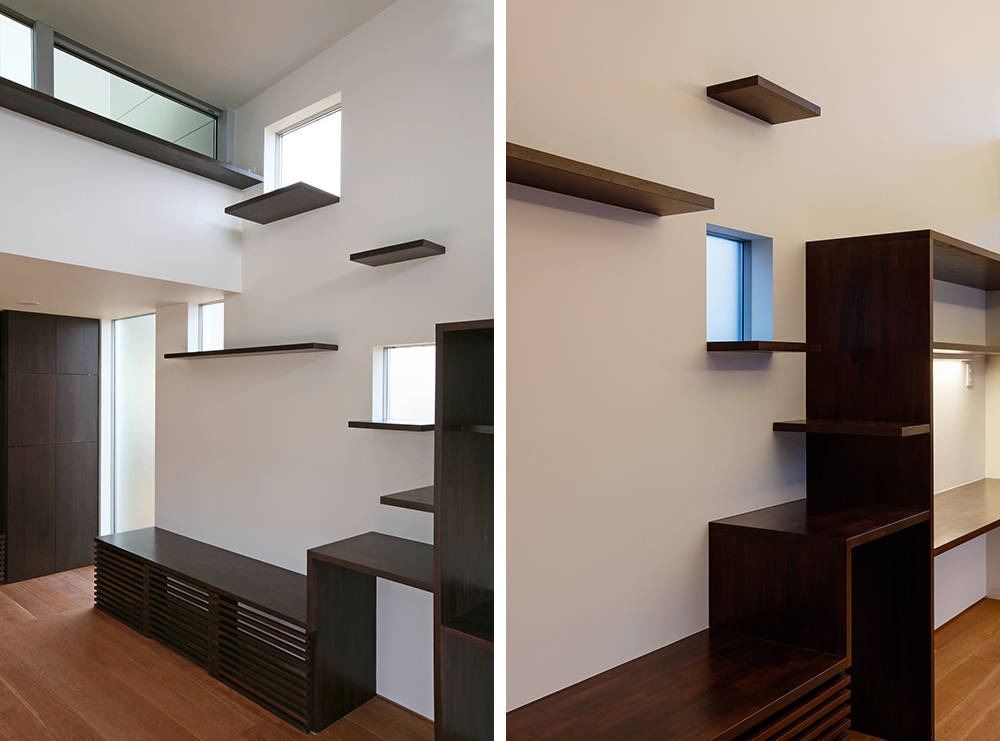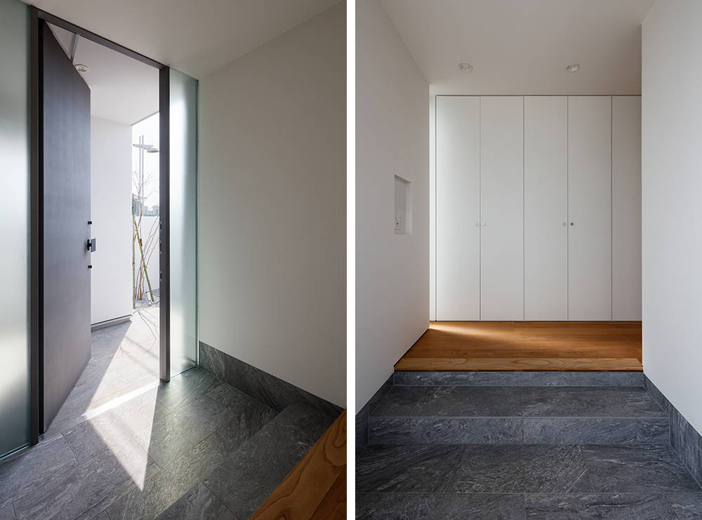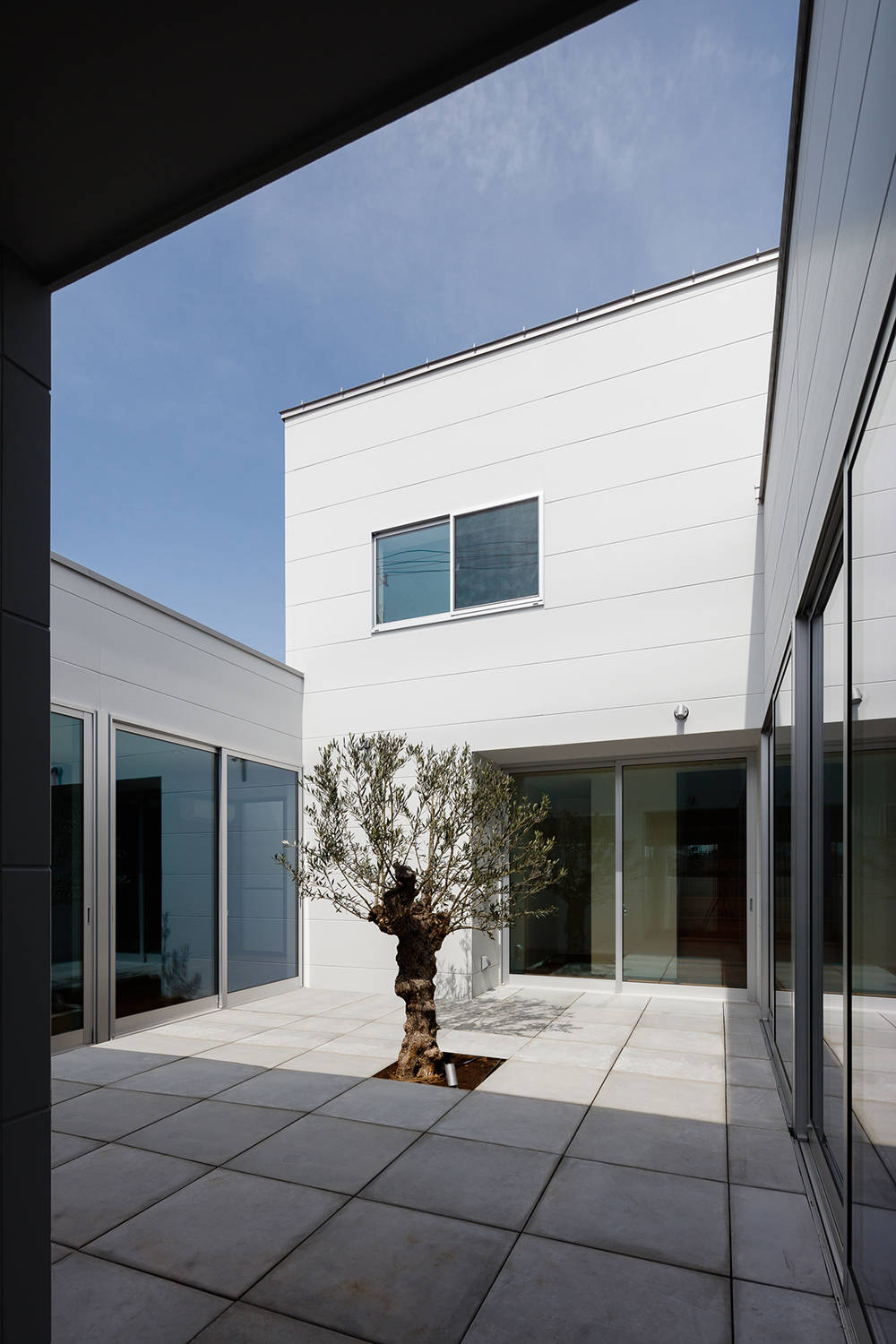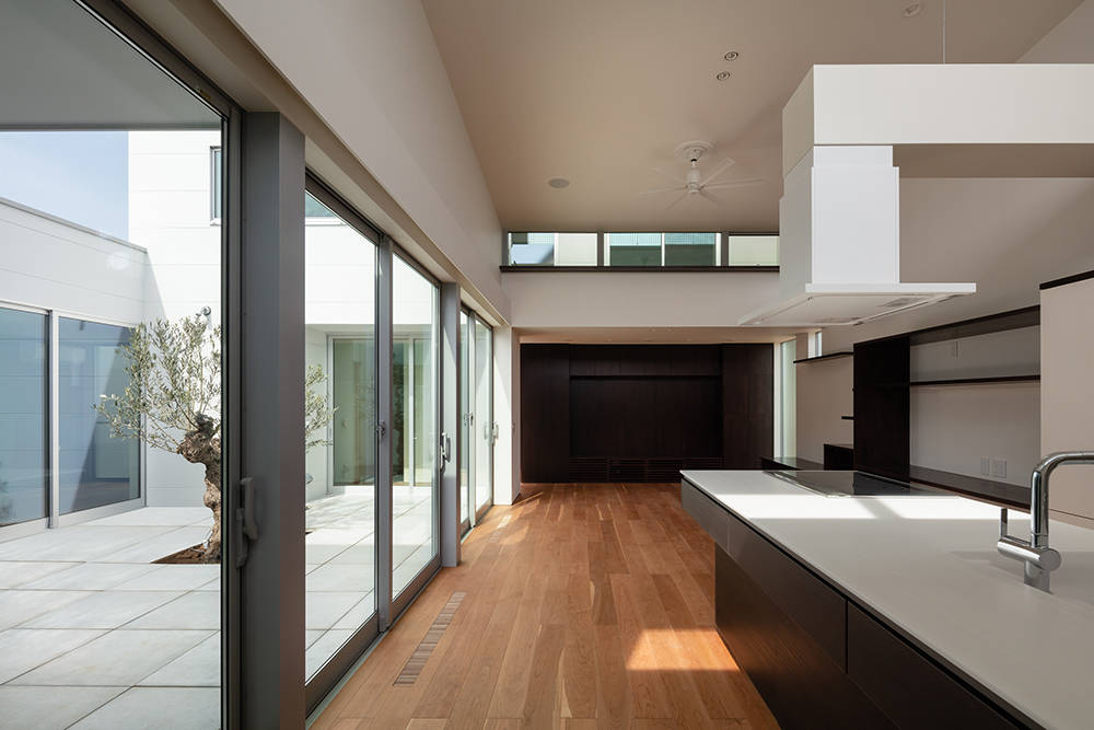 「機能・効率性が高く、収納に無駄がなく、家族それぞれの趣味や時間を大切にしながら、ペット(犬・猫)とともに暮らす居心地の良い住まい」を家づくりのテーマとした4人家族とペットの住宅。建物は中庭を設けたほぼ平屋のコートハウスとすることで、将来にわたって周辺環境の変化に左右されない、バリアフリーの安心安全な暮らしを続けていくことを可能にしています。