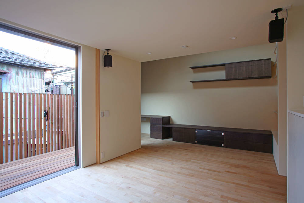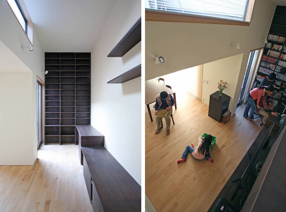 道路向かいのマンションの視線を気にすることなく生活できるように、リビングでは木格子で囲ったデッキテラスに面する窓のほかに、吹抜けの高窓からも採光。一日中明るく、プライバシーの守られた住まいを実現しています。
