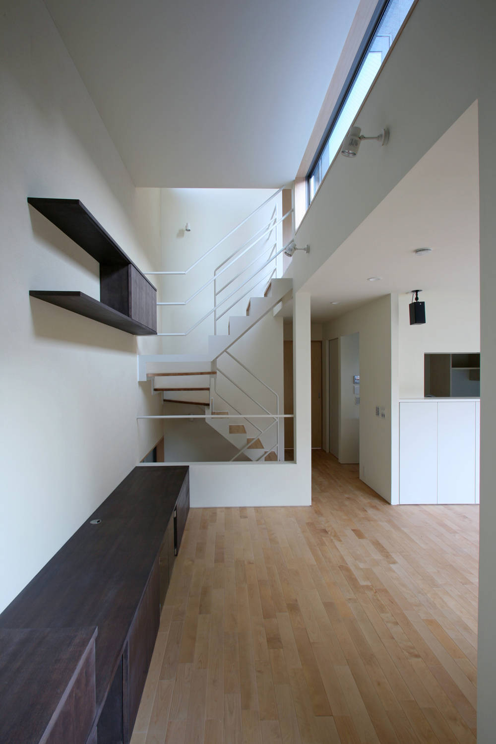 子供室のある3階に続く階段は、リビングの吹抜けに面してオープンな作りとしてリビングと一体化。子供達が自然にリビングに集まるように、世帯間の交流を育む計画にしています。