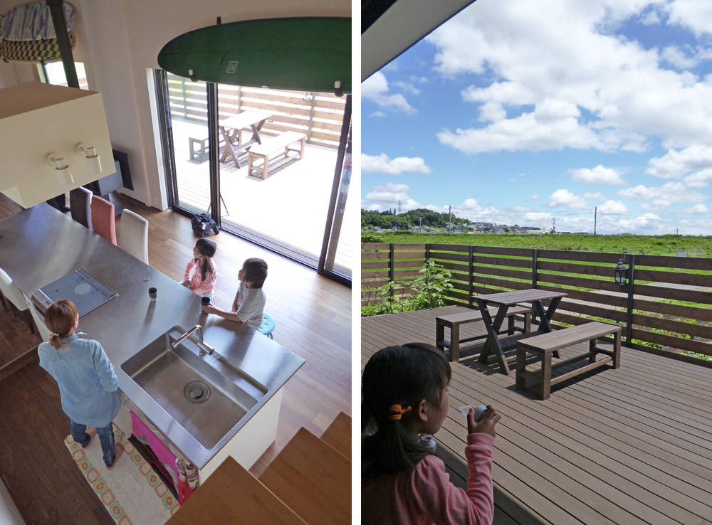 農地に向かって大きく張り出したデッキテラスは、外部空間と室内の結び付きを強め、内外の一体的な使い方を可能にしています。