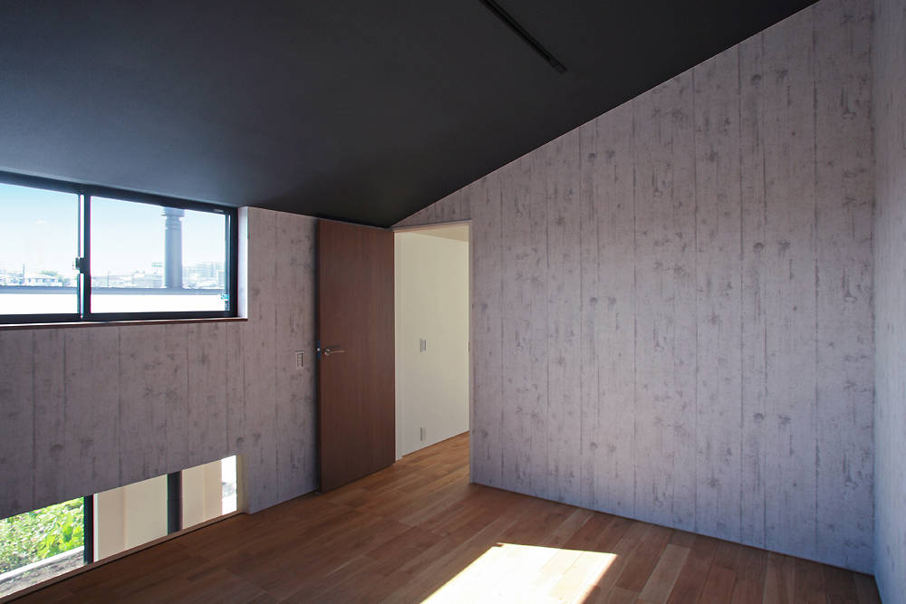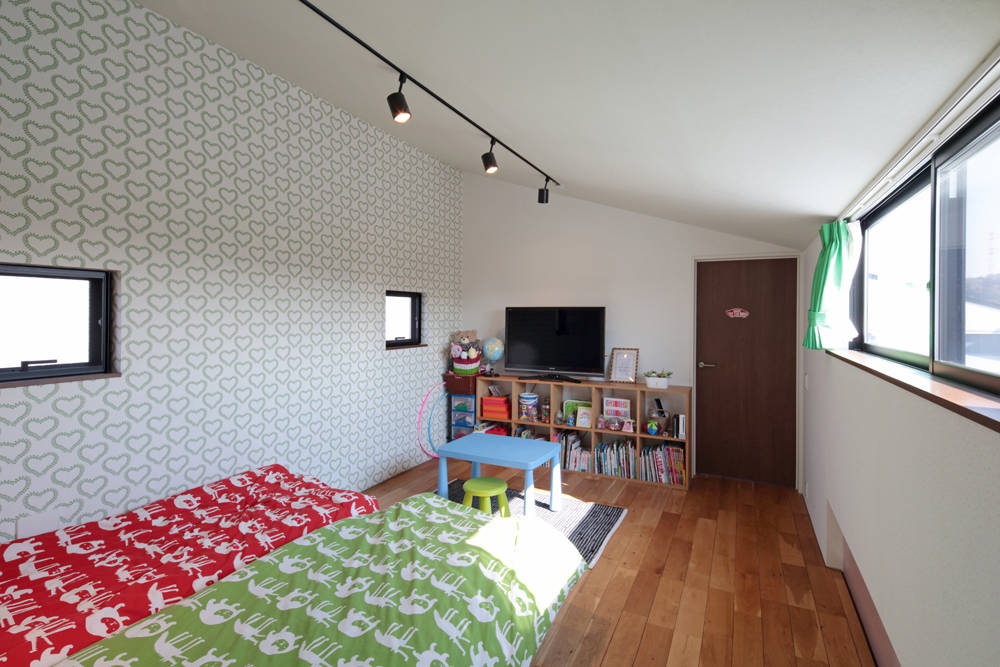 建物は南側に傾斜した屋根のシンプルな形態で、屋根の高い北側だけに2階を載せています。主要な全ての部屋に光と風と南側の経過案を取り入れ、太陽光パネルを効果的に載せるために生まれた形です。