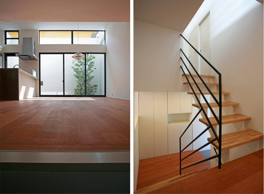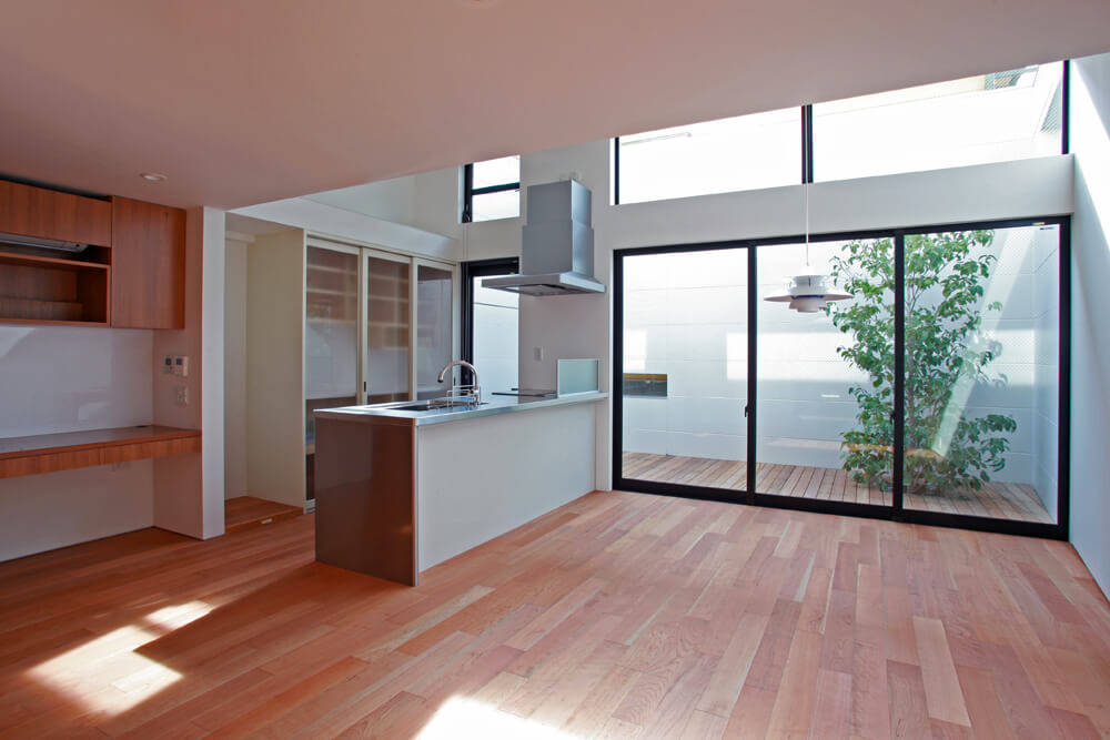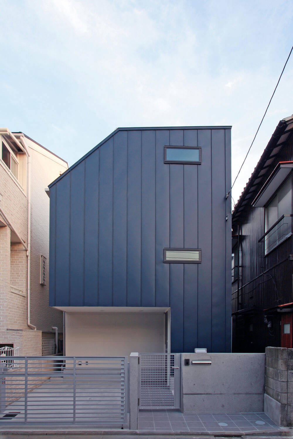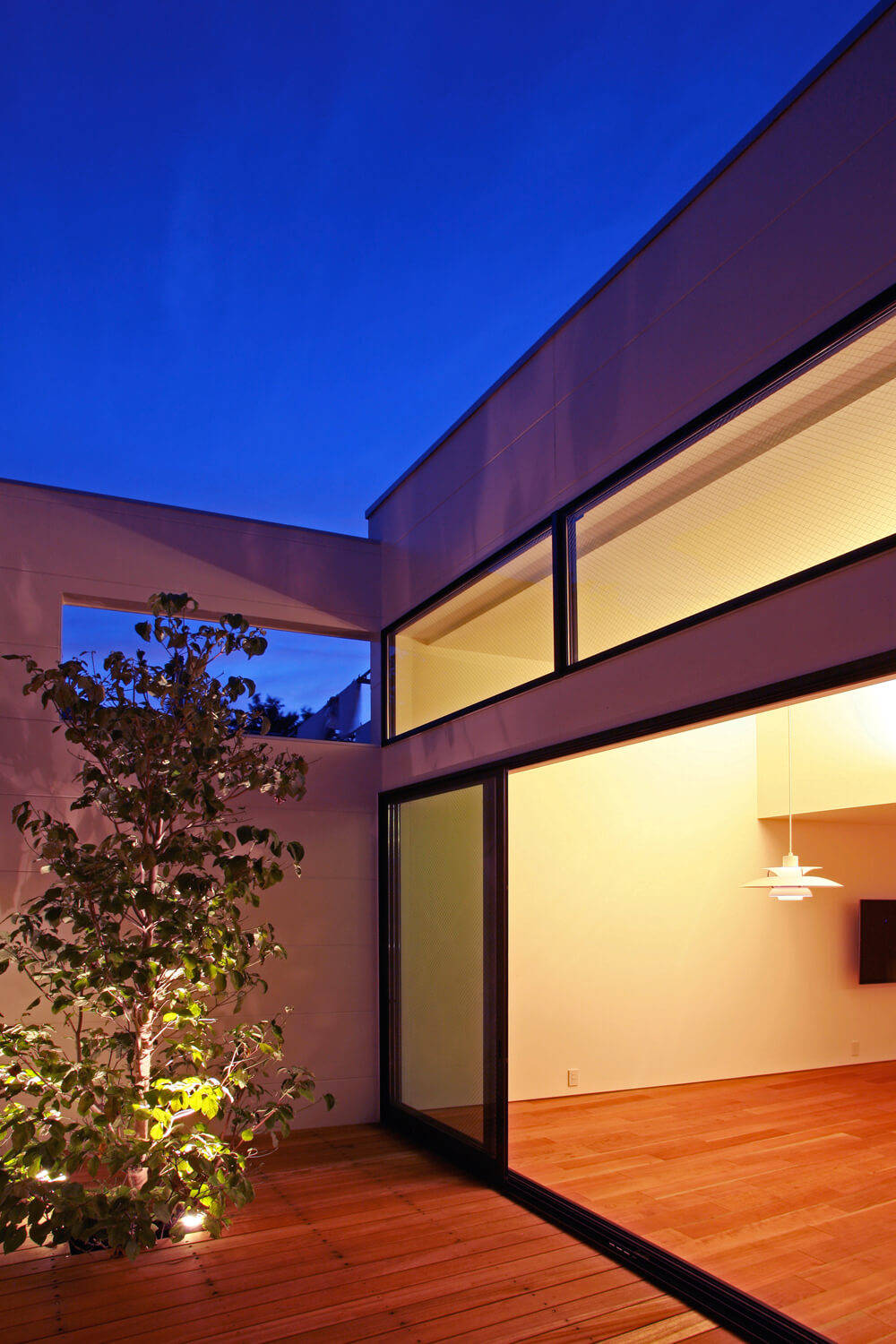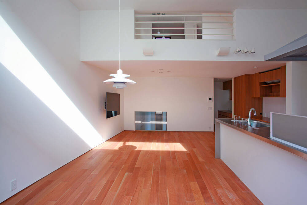 30代のご夫婦と子供のためのシンプルモダン&ナチュラルな住宅。北側道路の敷地は三方を建物に囲まれ、かつ、面積や高さ制限の厳しい場所です。必要な生活スペースを確保するために、一部を容積率緩和のある半地下(RC)とし、その上に2階分の(木造)を載せています。半地下からロフトまではスキップフロアの構成とし、室内の広がりと変化を与えるとともに、家事動線の効率化を計りました。南側には壁で囲われ、宙に浮いたデッキテラスがあります。LDKと一体的に使える外部空間で、室内に光と風、開放感と落ち着きをもたらします。同時に空へと開いたこの外部空間が、住宅密集地に建つの住宅と自然を強く結びつけ、日常の暮らしの中に四季折々の変化を届けてくれます。