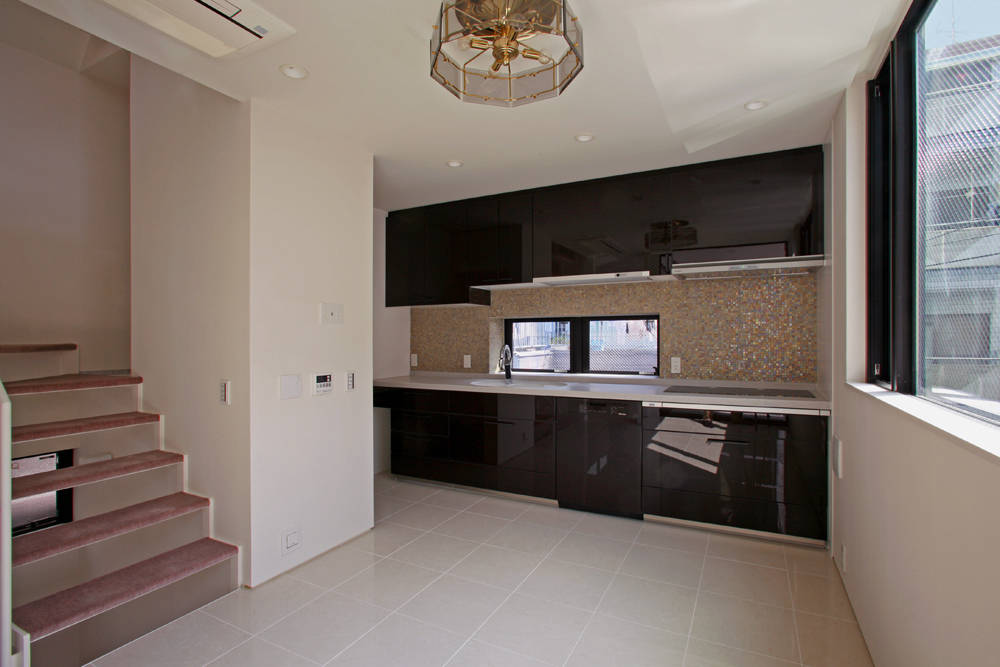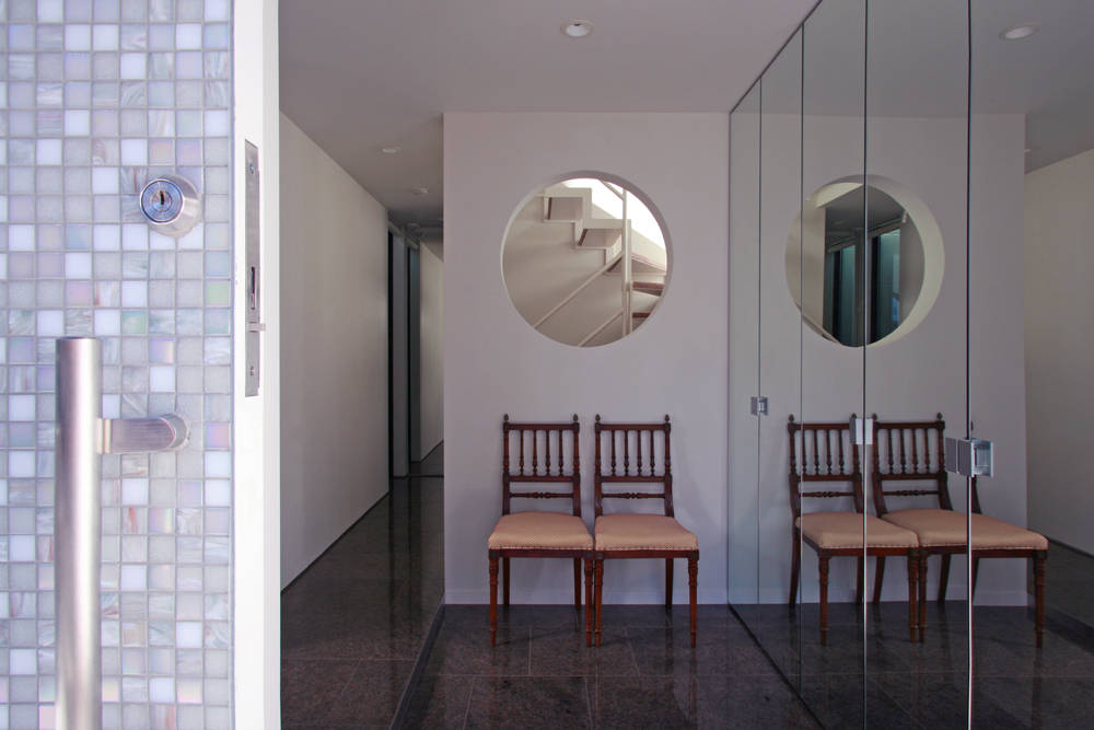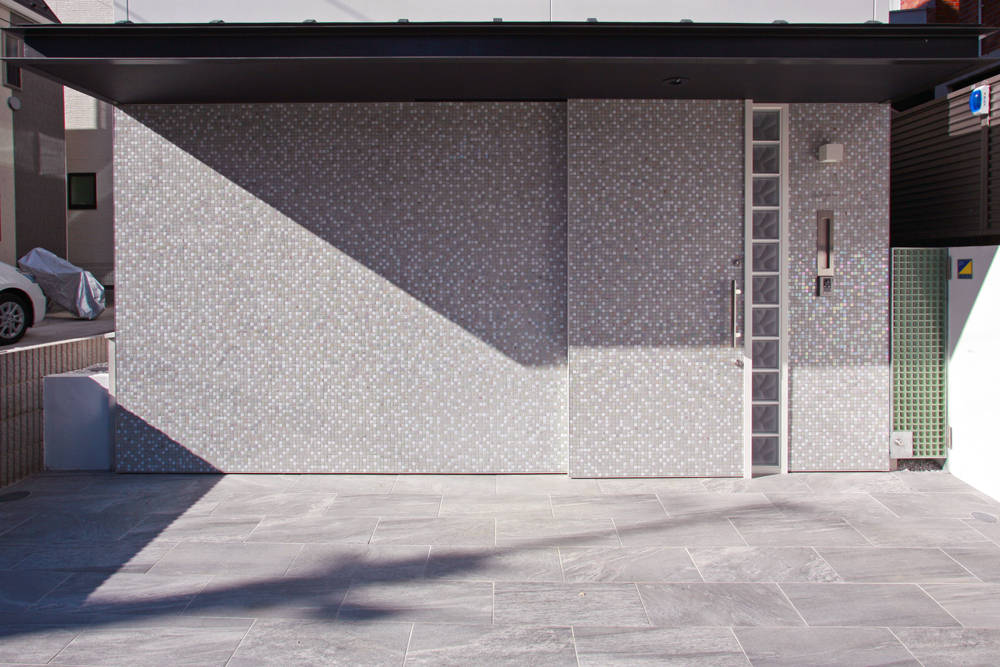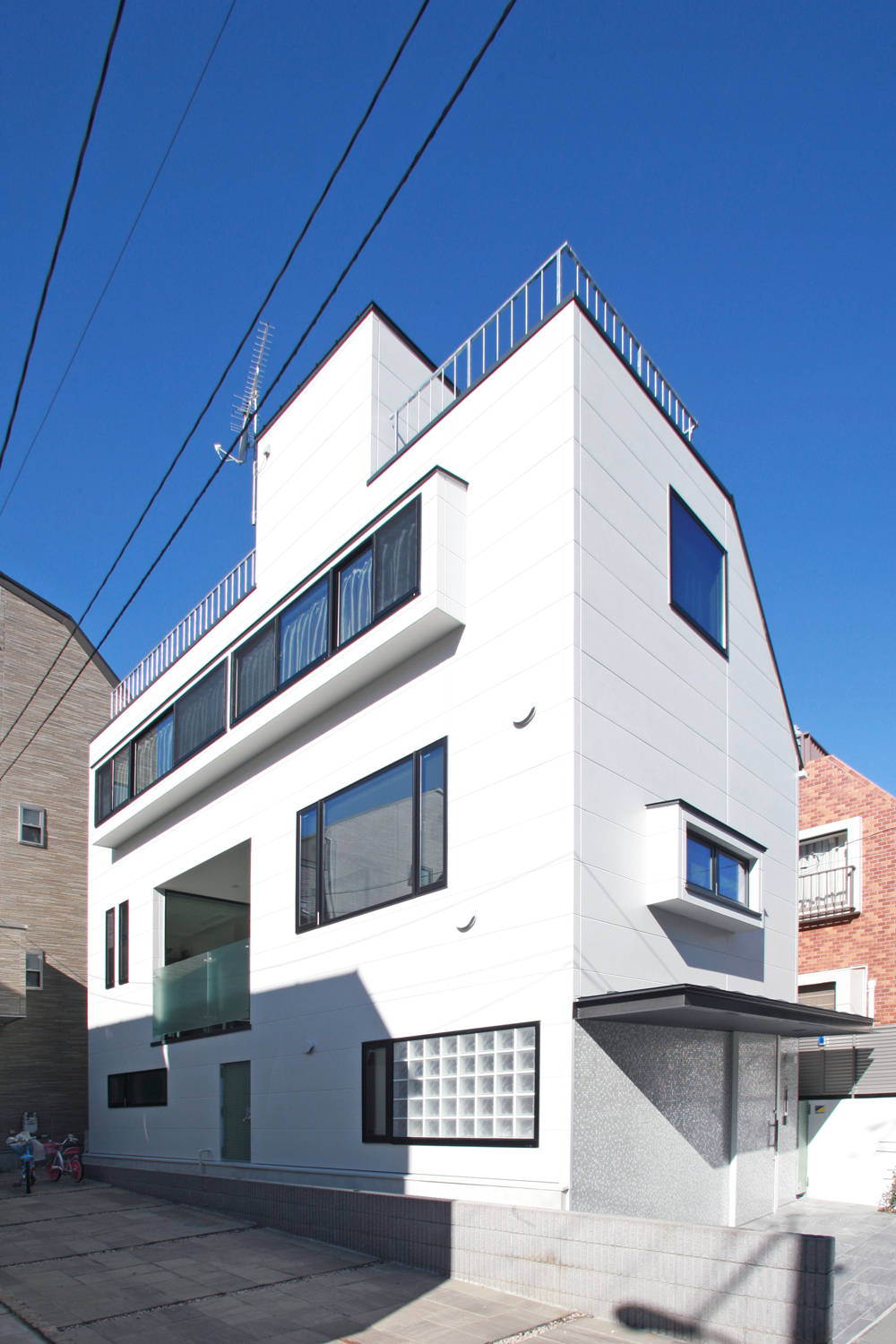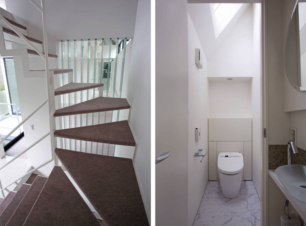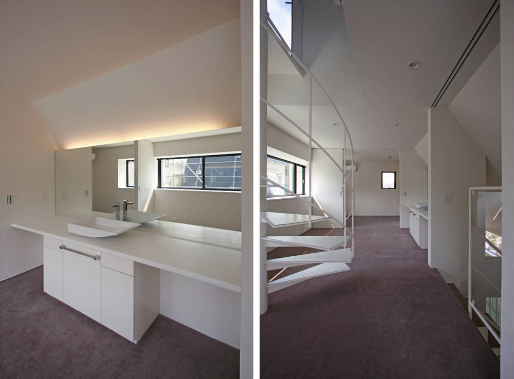建蔽率と容積率を最大限に生かしながら、外部空間(タイルテラス)を建物に組み込む事で、室内に明るさと広がりを与えています。地下から屋上までを使い切り、階段の位置や吹抜、水平に連続する出窓、仕上げや鏡の効果によって、単純な形状のワンルームの空間とは違う、変化とメリハリ有る空間を計画。