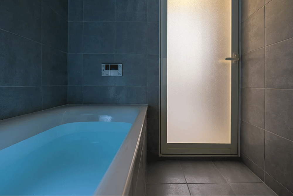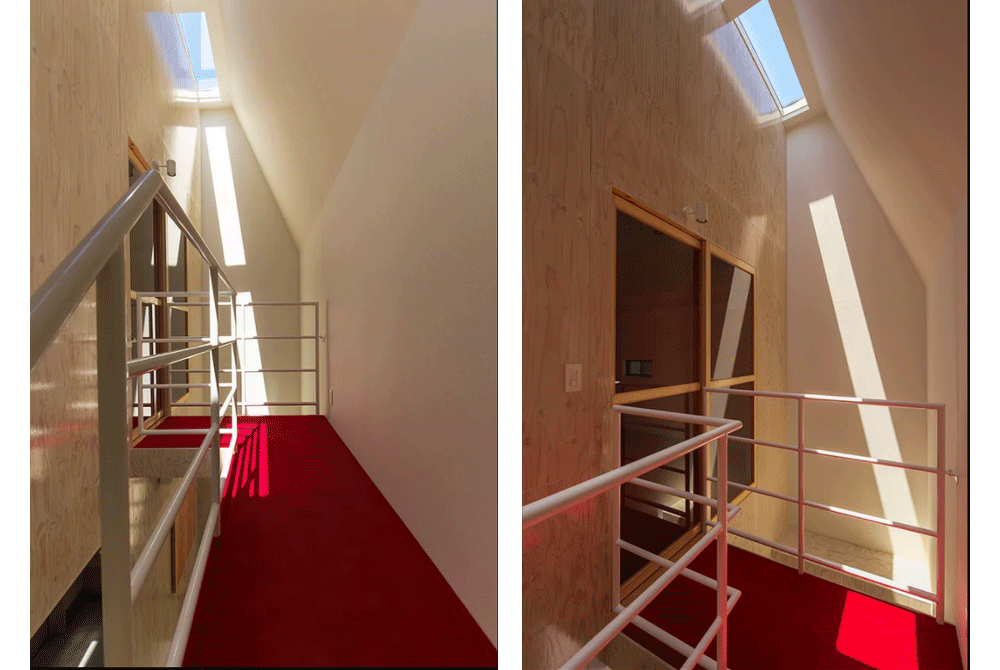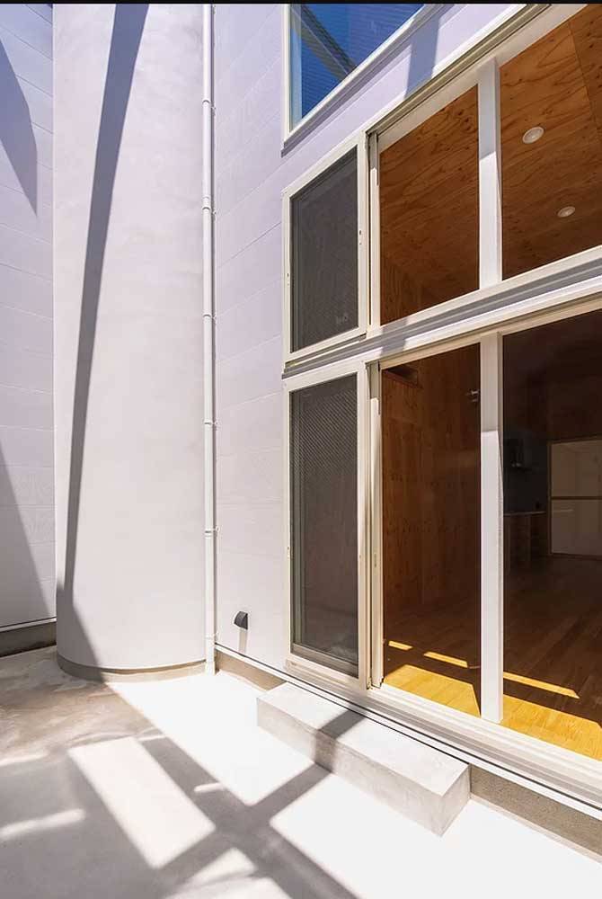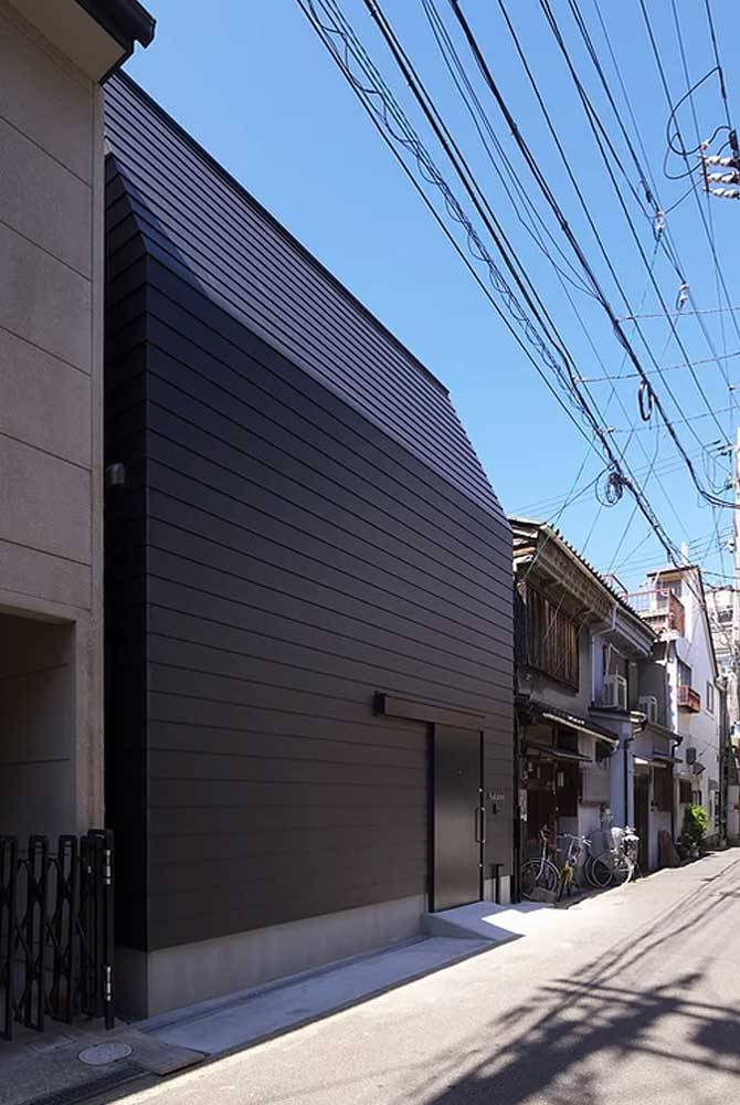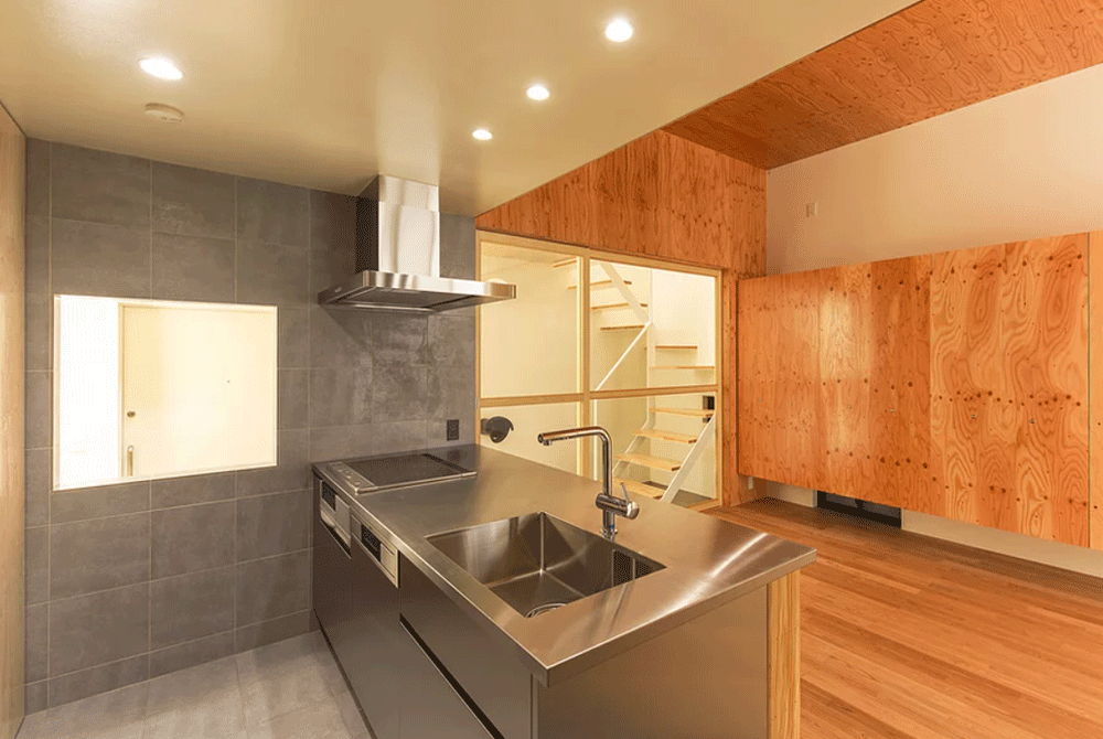 大阪市旭区の昔ながらの住宅地に建てられています。敷地は、前面道路以外は、隣家に面しています。道路の向かいにも、住宅が並んでいることもあり、建物正面の開口部は、設けないことで、計画が進められました。外壁は、ガルバリウム鋼板とし、色は、お施主さまのご要望でもあるブラックとしています。外壁の葺き方は、お施主さまとも意見があい、長尺一文字葺きで仕上げています。外壁上部の傾斜部の納まりもよく、シンプルできれいな佇まいとなりました。スチールの玄関引き戸の向こうに見える、内部の仕上材が対照的です。ラーチ合板を中心にまとめられた空間は、自然光によりさまざまな表情を見せてくれます。時には強く、ある時には優しい表情を見せてくれます。年月が経つことにより、木には深みがあらわれます。これからどんな表情を見せてくれるのか、家族の成長とともに。