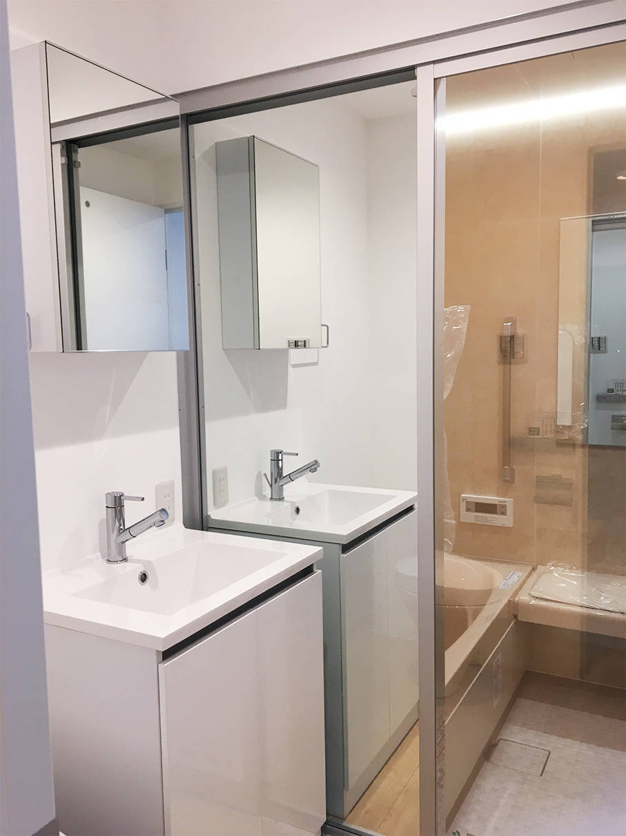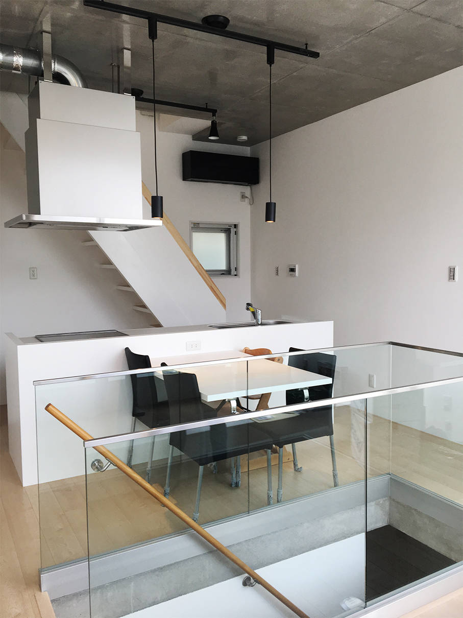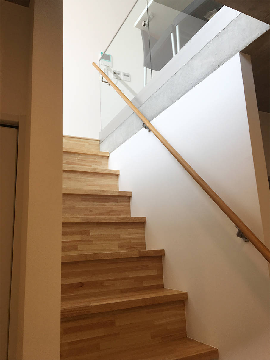 狭い敷地ですがガレージ付きです。1階はガレージをとった分1室と水回りと玄関です。やや薄暗いのですが、2階へあがる階段上から光を取り込み易いように2階階段落下防止腰手すりは強化ガラスを採用しています。強化ガラスにしたことで2階LDK空間はさらに広がりを感じます。