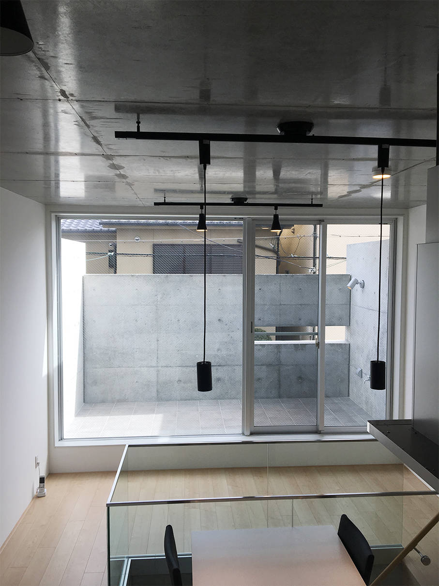 2階のテラスは奥行き2mとし手すりの高さも2.2m。密集する住宅地の中でも隣家からの視線を意識せずに天井高2.8mのLDKと一体となり広がりある空間を楽しめるようになっています。