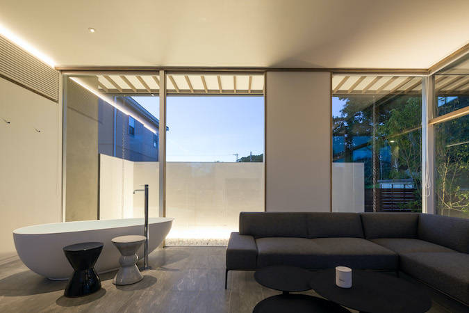 対話を重ねていくうちに、単にお風呂に入る場であるバスルームではなく、寛げる場としてのバスルームというコンセプトとなっていった。風呂に入りながらテレビを見たり、湯上がりにソファーでのんびり出来たり、リビングに浴槽が置かれたようなバスルームとなった。窓はガラスの限界サイズまで大きくすることで、屋外にいるような開放的なバスルームとした。