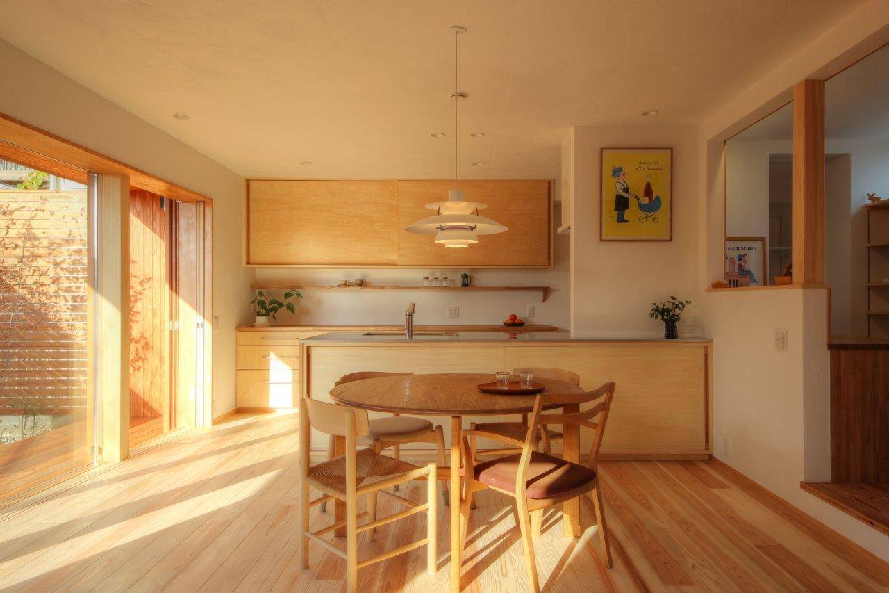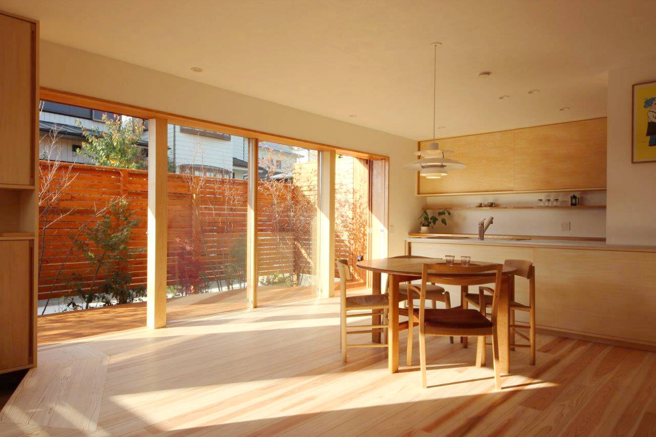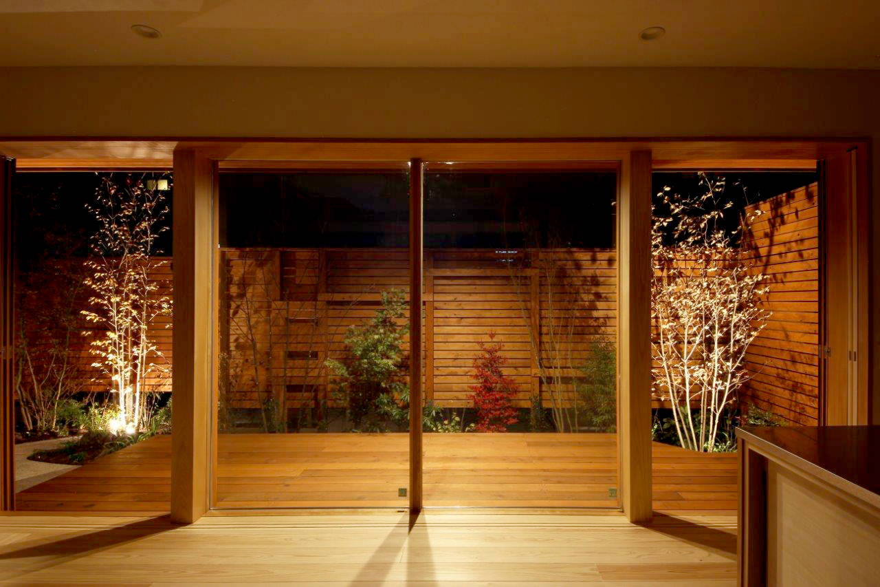 1階は居間・キッチン・スタディが配された広がりあるワンルーム(内部)と、板塀で囲われたプライベート感あるデッキテラス(外部)とが幅広の開口部でつながった内外一体の空間です。デッキテラスには緑潤う植栽を多種混植し、四季おりおり自然のうつろいを感じることができます。