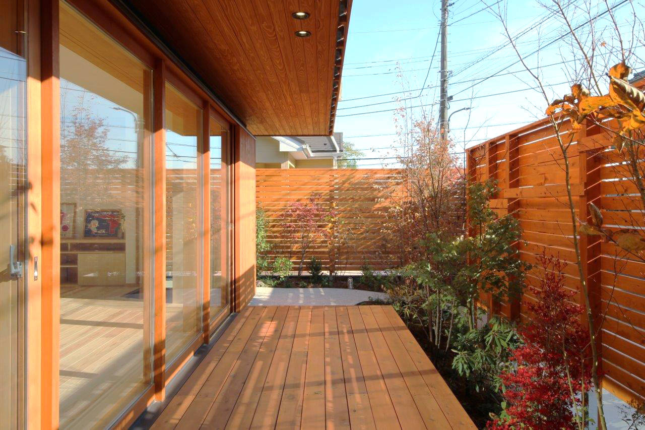道路からはアプローチ・デッキテラスを通ってそのまま居間へ。あたかも縁側のような雰囲気のデッキテラスから気軽に出入りでき、近所の友人・知人が楽しく集う家となりました。