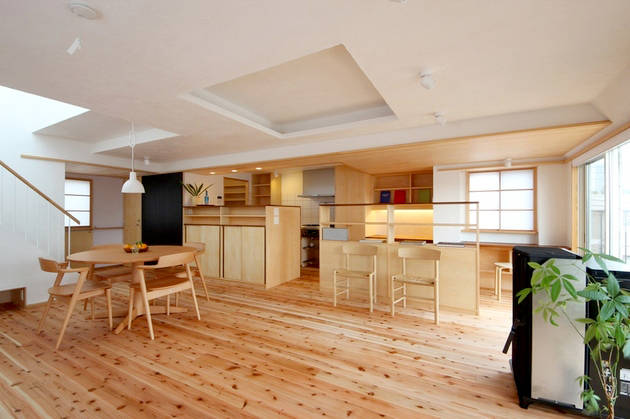 3階は子世帯の生活スペースで、南側からの陽光あふれるリビング、吹抜ごしに屋上からの光が降り注ぐダイニング、落ち着いたスタディスペースや、タタミ小上がりの籠り部屋など、ワンルームの中に様々な居場所が点在しています。家族が互いの気配を感じながらも、思い思いの過ごし方ができる空間です。