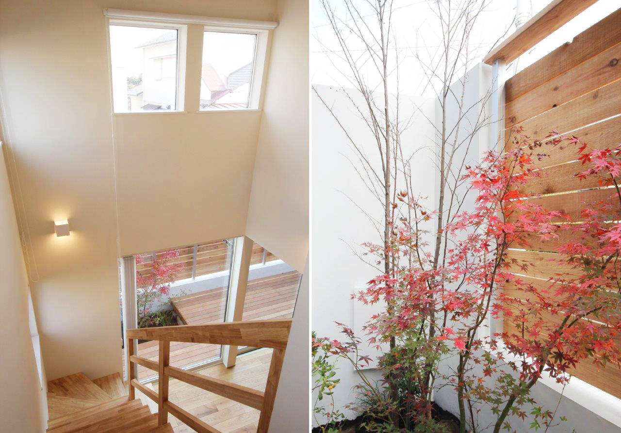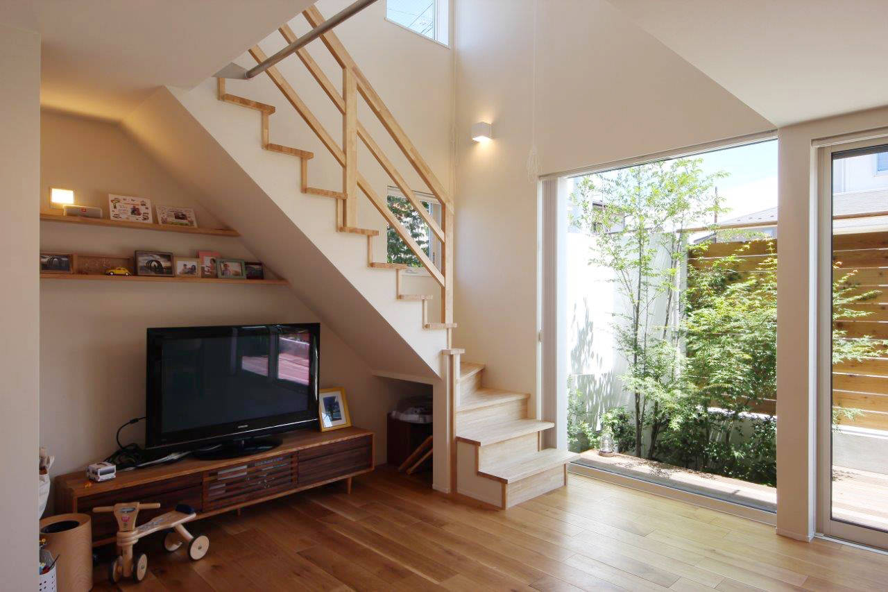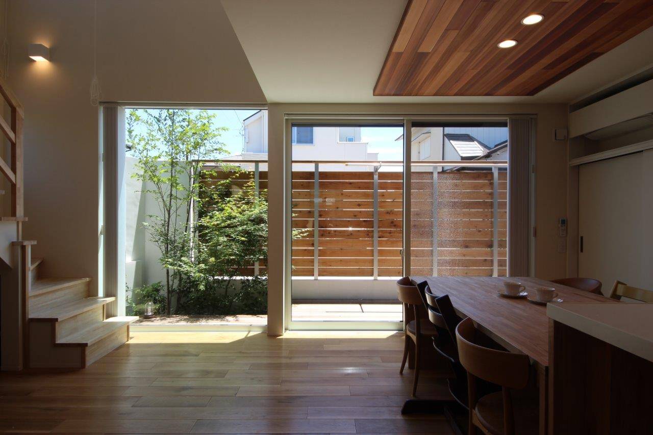 庭と一体感あるLDKを1階に配することが住まい手さんの希望。そこで、道路からのプライバシーに配慮して高さのある板塀と白壁で囲った中庭を南東側に設け、そこに対してLDKを開く構成としました。中庭はデッキテラスを主体としながら、一角に高木はエゴノキ、中木はヤマモミジ、低木はブルーベリー、その他下草等を混植した植栽を施し、これらが生け花のごとくLDK空間を彩っています。また、LDKの一部を吹抜とすることで奥のスペースまで光が行き届き、開放感ある雰囲気をもたらしています。