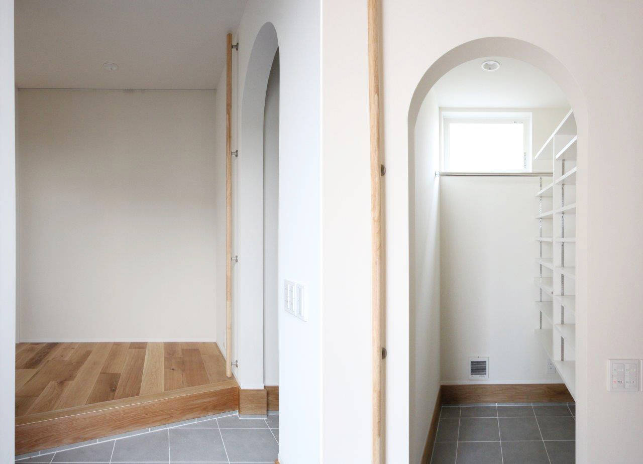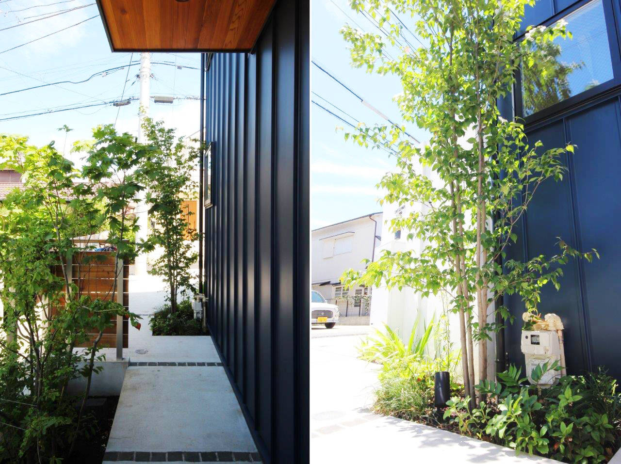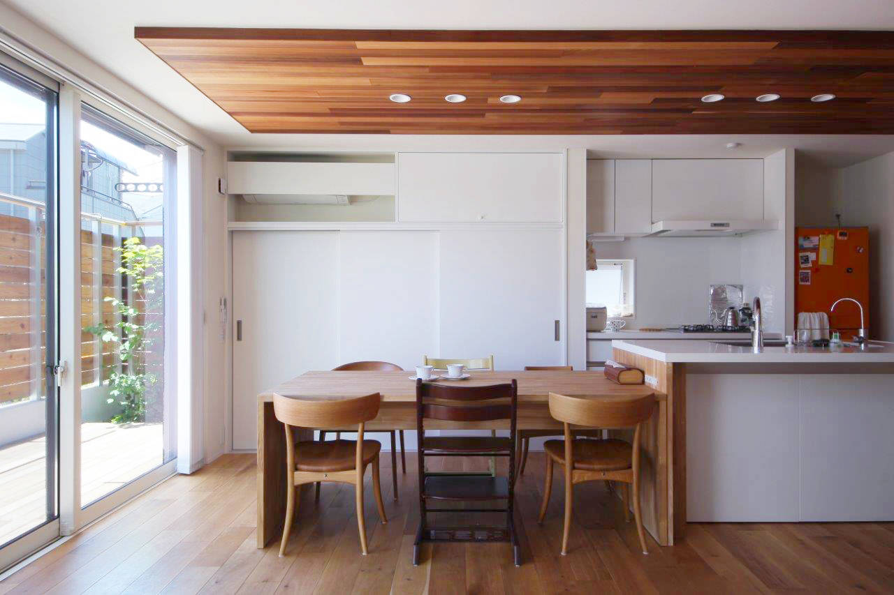 敷地は隣家の旗竿部(導入部)に面する北東側も開けて明るく、こちら側に玄関へのアプローチを設けました。奥行あるアプローチは木々の間を右へ左へと進む緑豊かな空間。進んだ先では庇と袖壁を一体にデザインしたL型の囲いが出迎えます。このデザインと呼応するイメージで、ダイニングでは壁・天井一体のL型板張り仕上げを設け、広がりある空間の中に落ち着きあるダイニングスペースをつくりだしています。