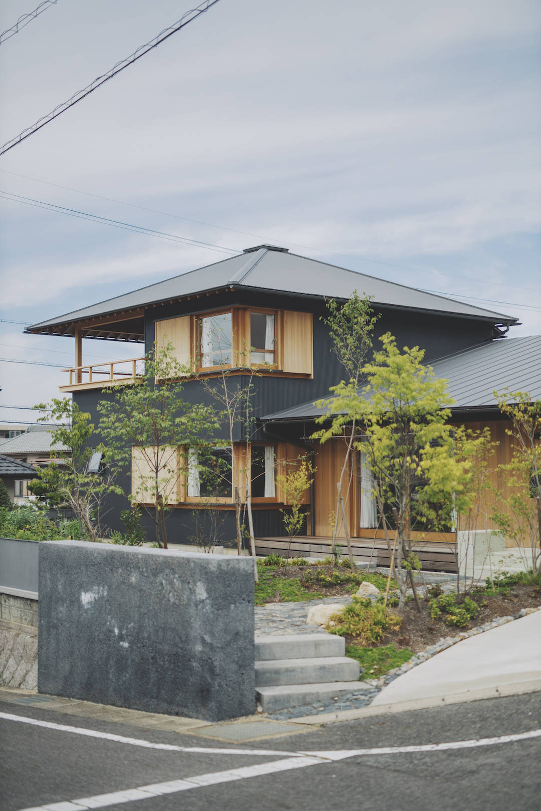 郊外の小高い丘に雛壇状に造成された敷地に建つ住宅。子育てがひと段落したタミングでの建て替え。40年以上前に造成された住宅街にあり、落ち着いた風情の街並みに馴染むよう落ち着きのある佇まいを心がけた。