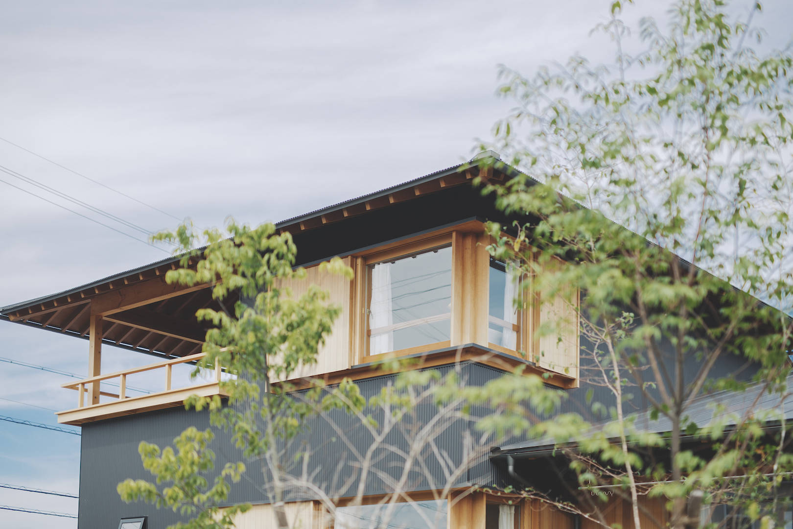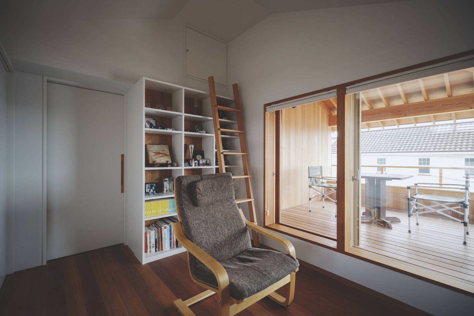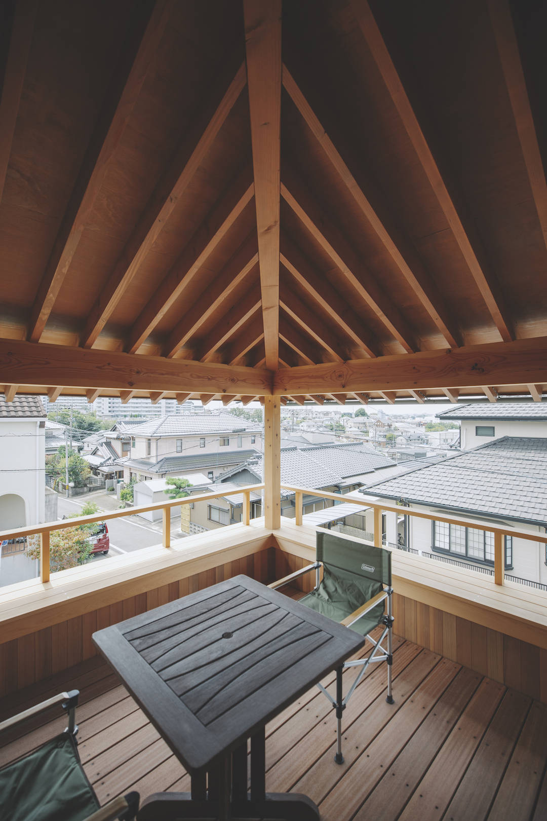 丘陵地にあり、2階の眺望がよかったのでインナーバルコニーを設けた。手すりが腰掛けにもなっている。