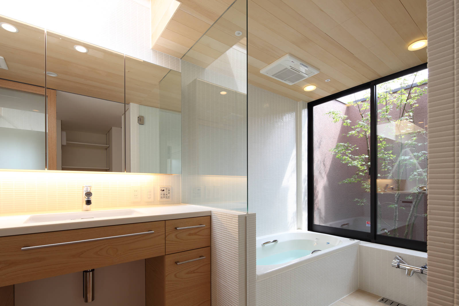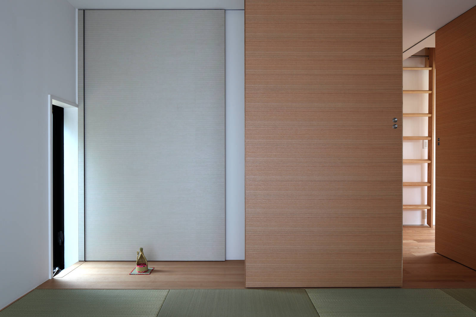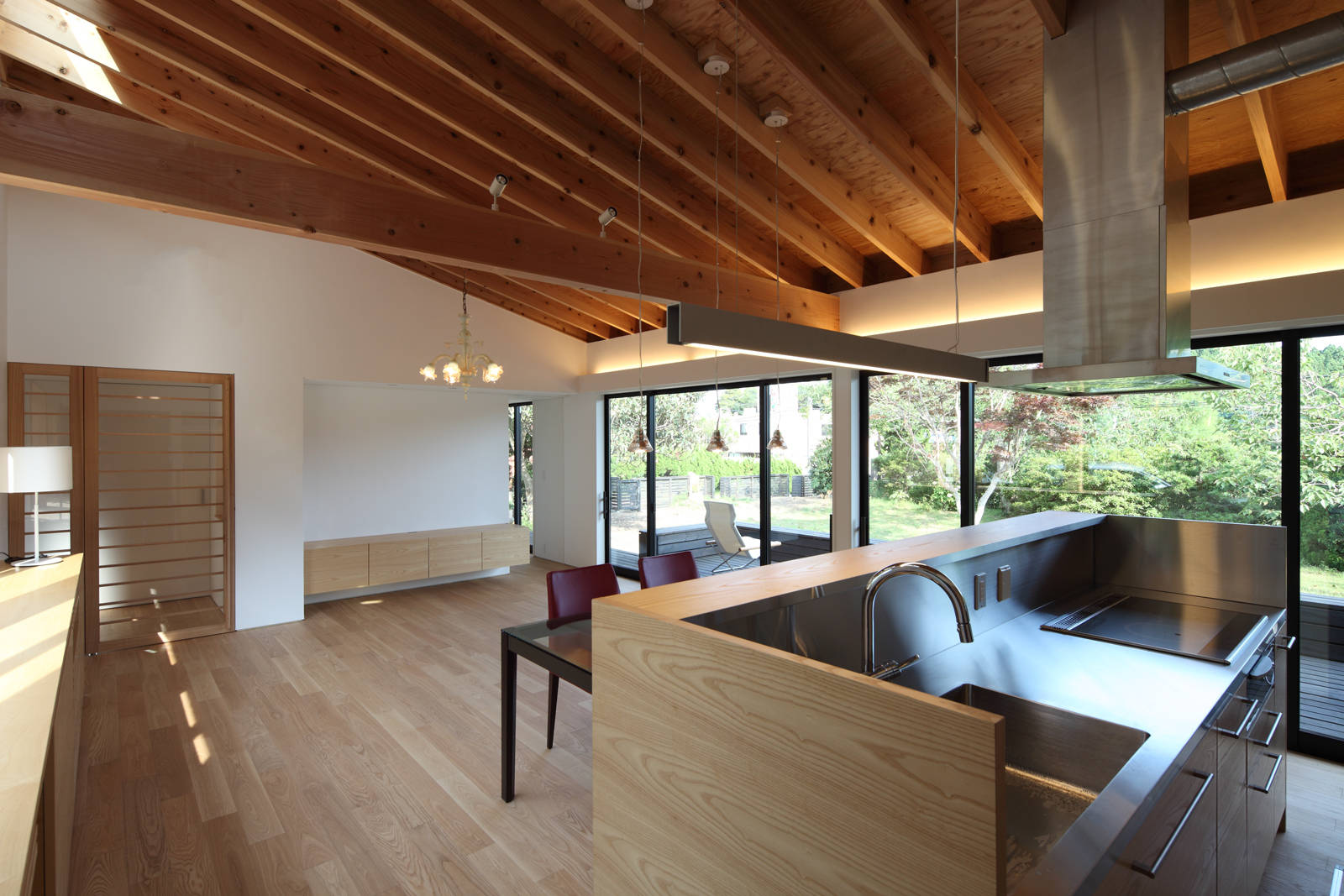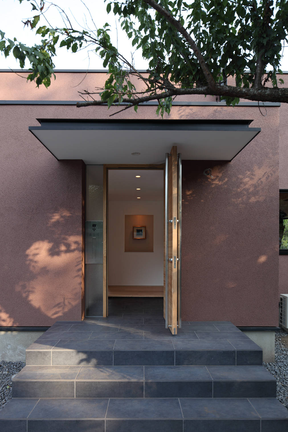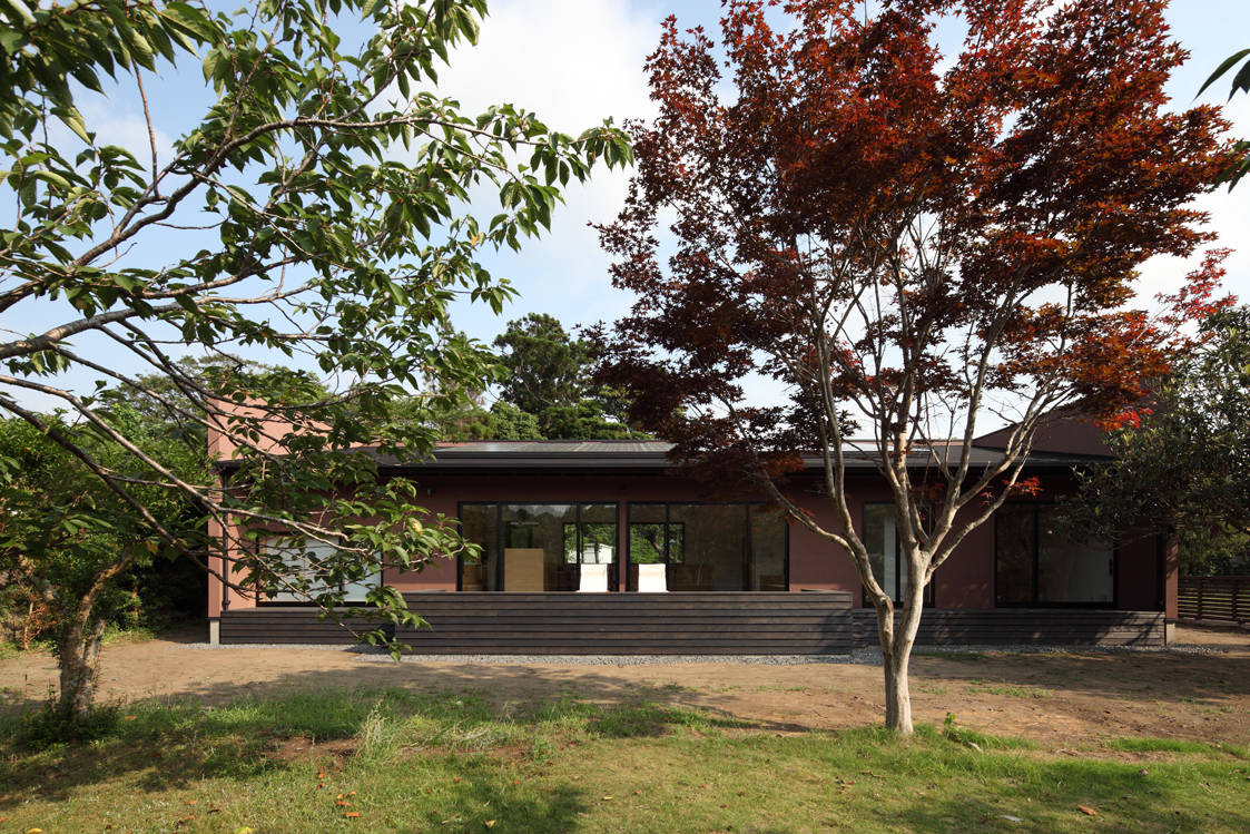 新たな生活をこの地域に違和感無く馴染ませることを希望されたことから、地域に見られる勾配屋根と土壁の左官色を採用した平屋として、内部は木質の開放的なリビングを中心に、左右に個室群を配置した明快な構成と構造的な安定を図っている。