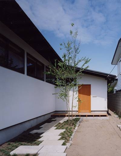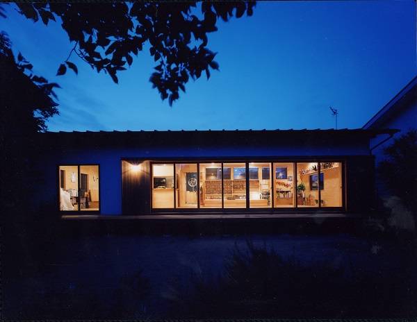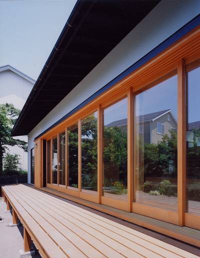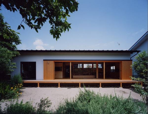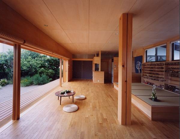湘南鵠沼の海から5分程の旗竿状の敷地。家族構成は夫婦2人と子供1人。設計当初は2階建てを希望されていましたが、緑豊かな庭と一体となり、快適に暮らせるような小さな平屋を提案しました。心地良い南風をリビングに取り入れるため、南側を大きな木製建具で全開できるようにしています。床はクリの無垢材で床暖房を取り入れています。