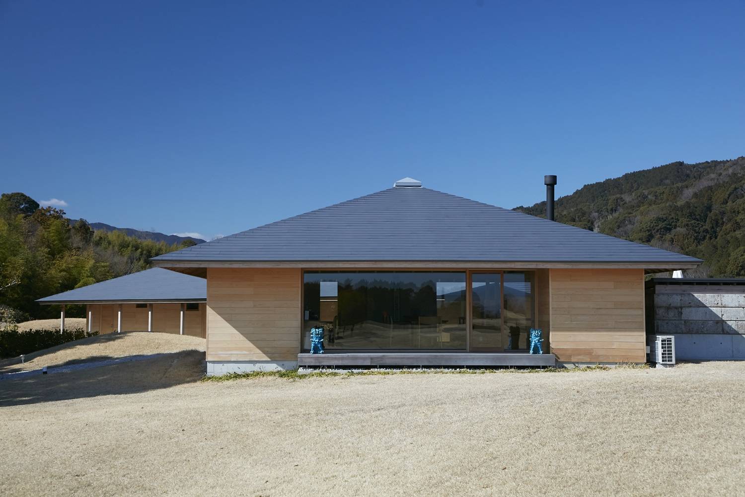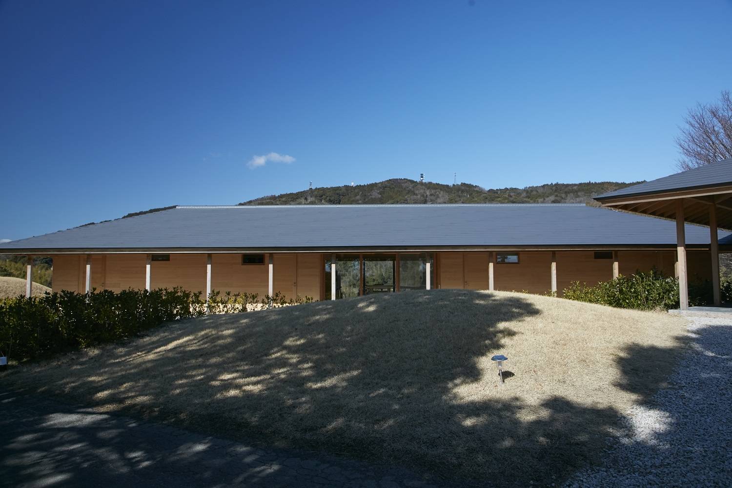 ロッジは陶芸家/川喜田半泥子のアトリエのある長谷山と対峙しているのが最大の特徴です。山の稜線と屋根勾配を合わせ、自然と人工物が共鳴しているかのような形態をとっています。