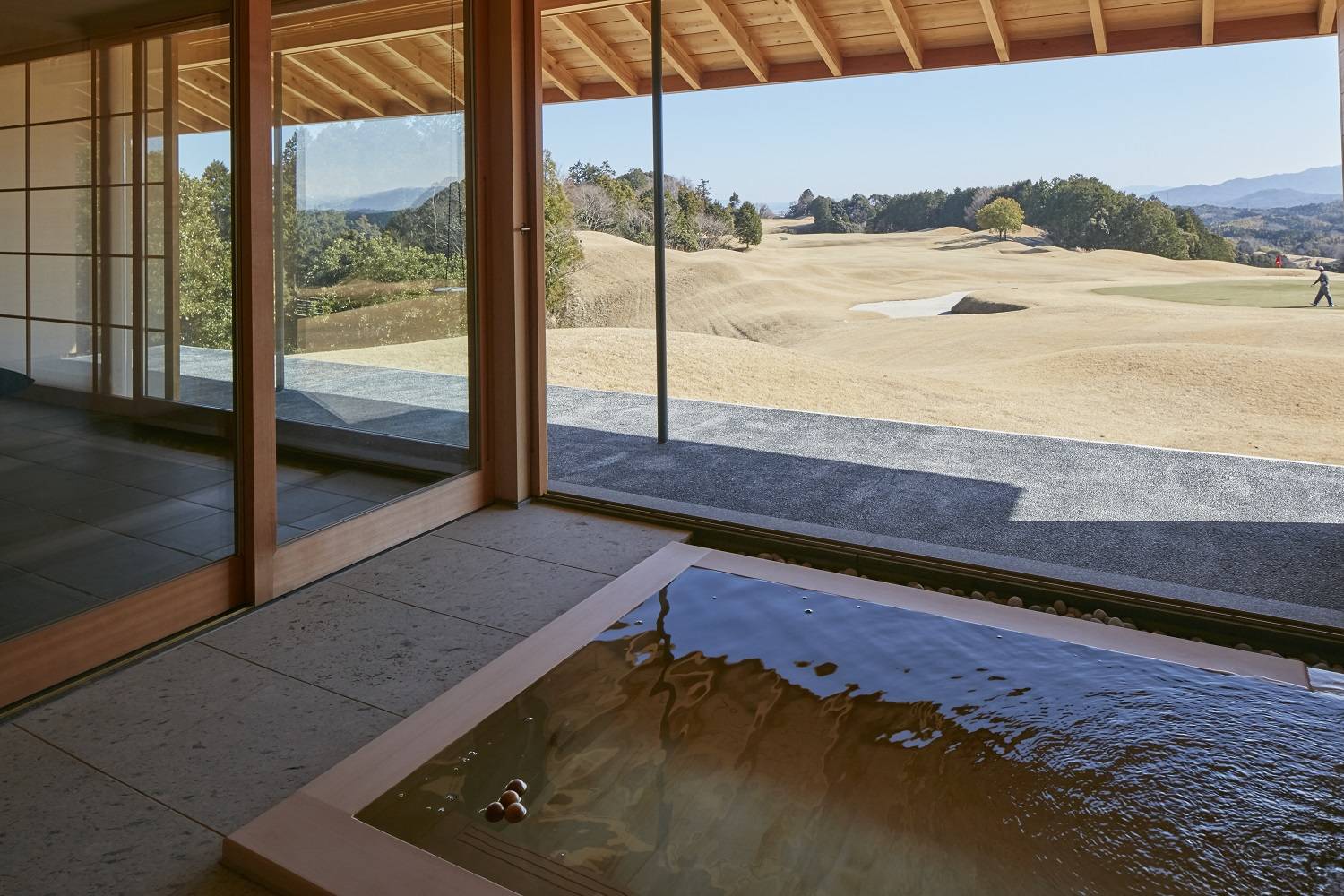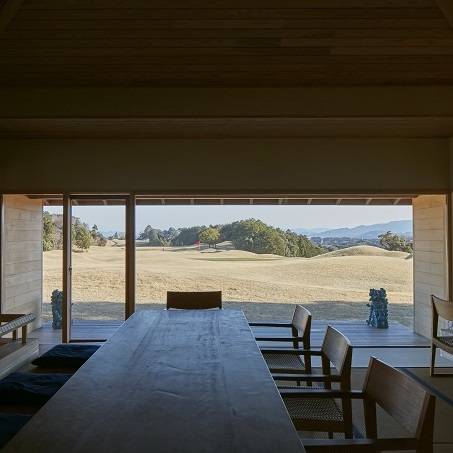 ヴィラは18番ホールを眼下とする丘に配置。浴室、居間、寝室を大きな木製建具で開放しました。浮遊感のある軒の深いテラスからは、目の前に18番ホールの雄大な景色が広がります。