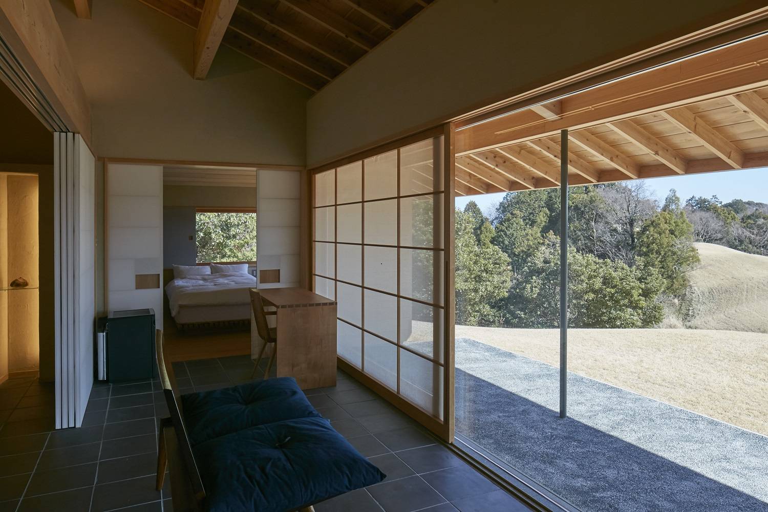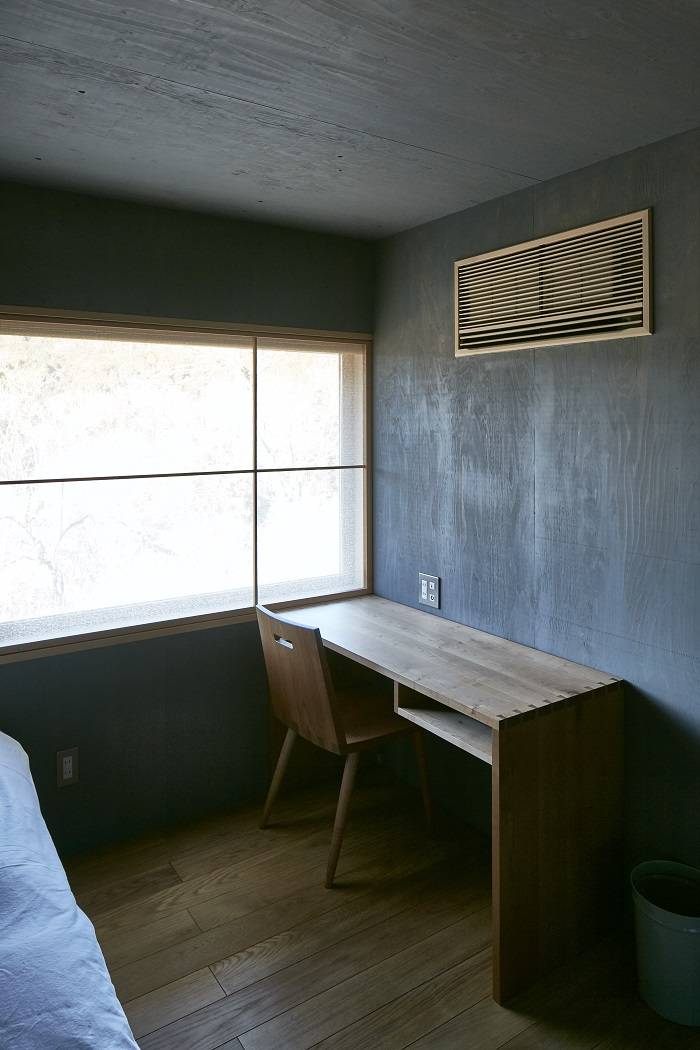 外壁は神宮備林のある岐阜県加子母村産のヒノキを使用。建具はすべて木製建具としています。ライティングデスクや椅子、ベッド架台などのすべての家具は地元の家具職人の作品を採用しました。また材料は木、紙、土、草などの自然素材を厳選。設計の段階からこだわったのは、現地まで足を運び、職人たちに会い、納得したものだけを選ぶことでした。