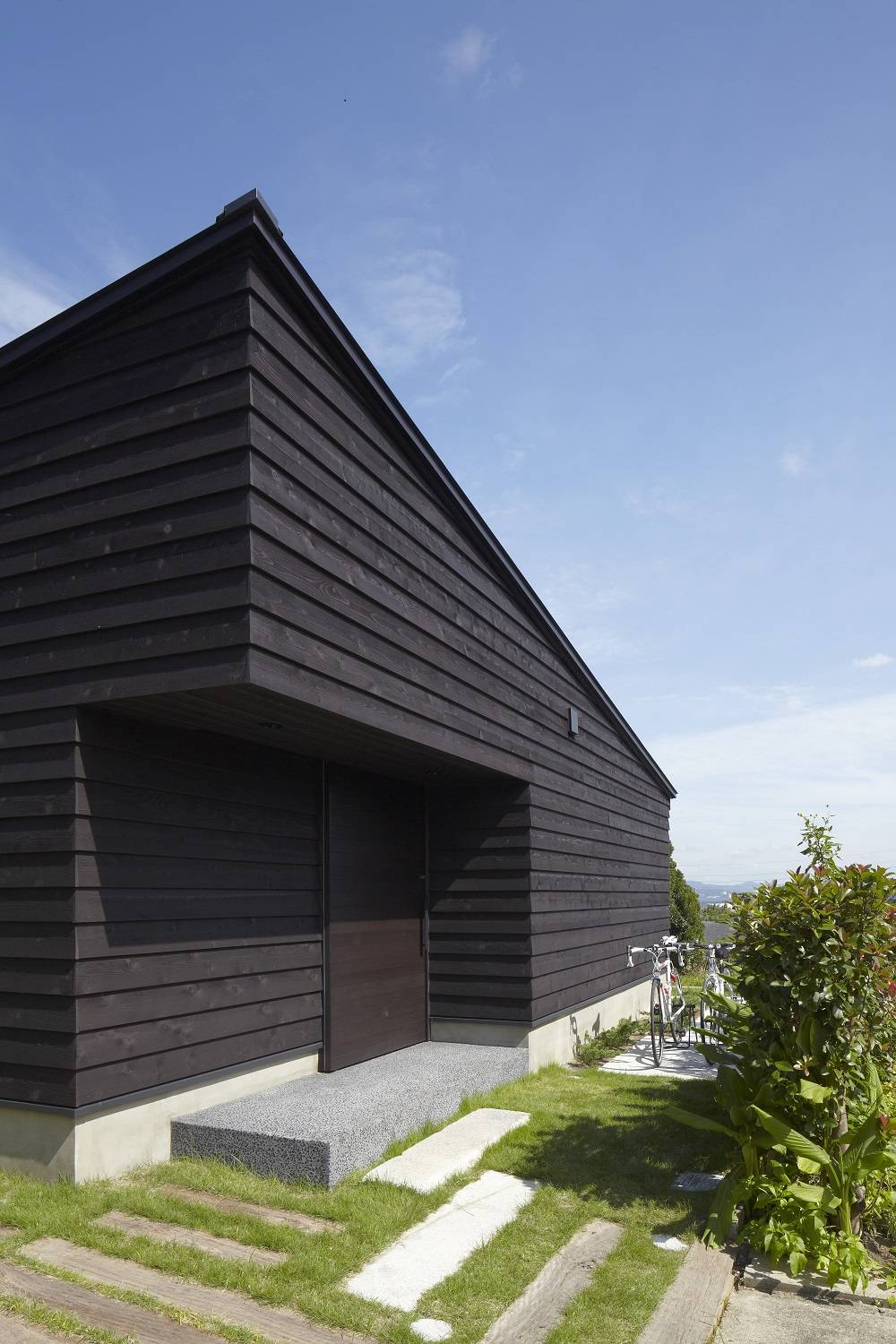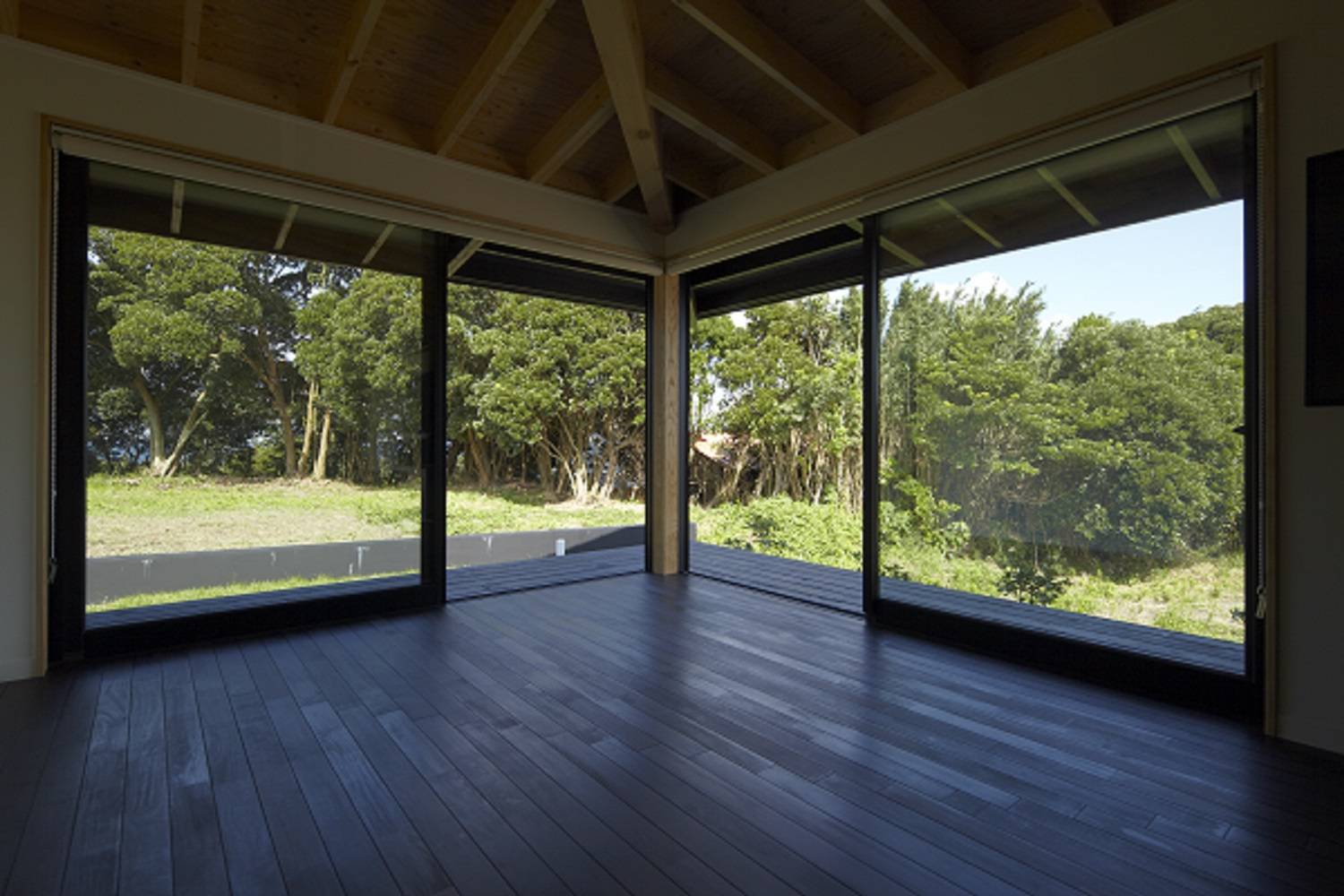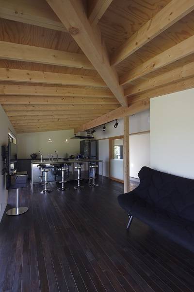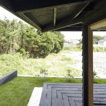 千葉県館山市の国定公園の中にある敷地。窓からは防風林の隙間から水平線が覗きます。空が高く海風が吹き抜けます。普段、多忙にしているクライアントが、海で楽しんだり、夫婦だけの時間や仲間と交流を深める場です。ここでは必要なものを厳選し無駄なものをひとつも置かない、また建物自体もミニマムを極めたデザインを目指しました。北東に海がひろがり、南西は隣家が迫っているため、北東に大きく開口をとり、南西は極力閉じた形態としています。玄関の土間は趣味の釣りのため広くとり、リビングには深い軒の濡れ縁を設けました。玄関とリビングは建具で操作し、目的に応じて可変できる豊かな居住空間を実現しています。屋根形状は南北を対角線とする棟木が南へ登る形となっており、そのユニークな架構は内部で表われ、リビングのデザインの大きなポイントとなっています。外壁は、強い防腐塗料を塗装した木貼りで塩害対策にも注意を払っています。