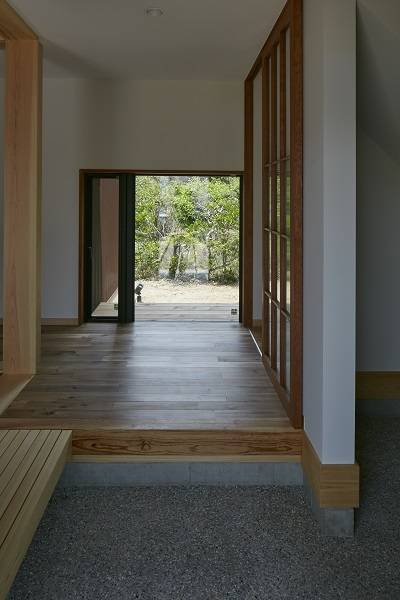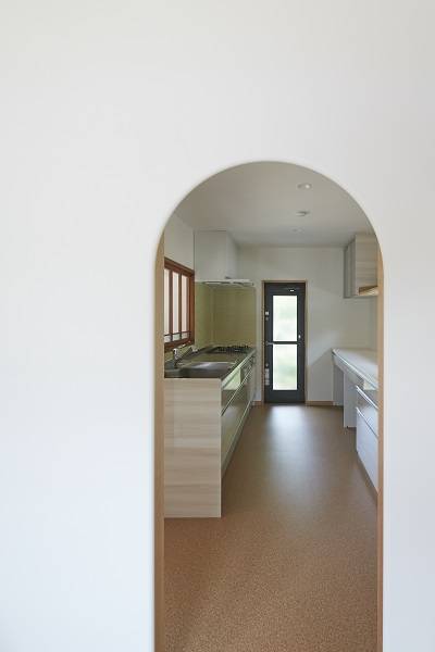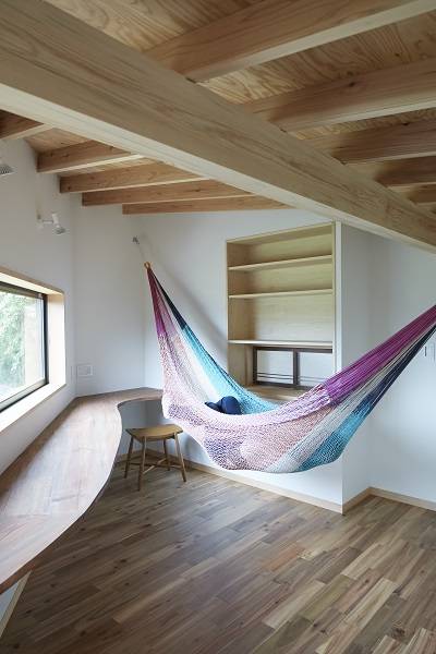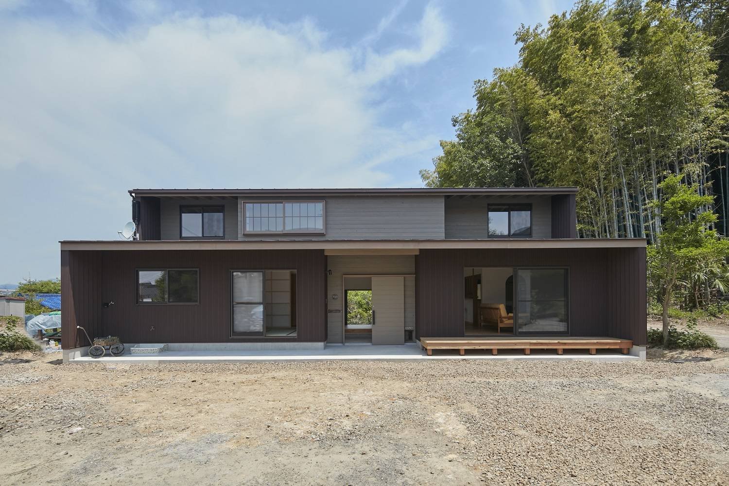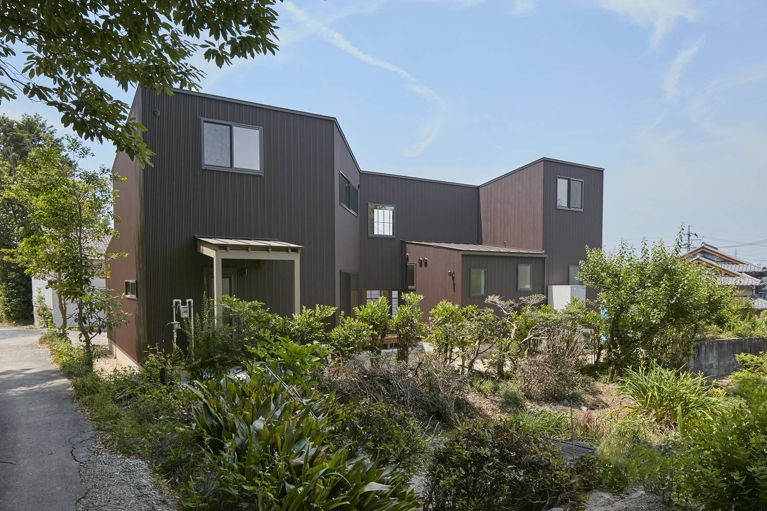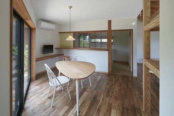 名古屋から車で20分程の愛知県小牧市。緑豊かな市街化調整区域。兼業農家であるクライアント夫妻と子供2人+猫が暮らす家。当初は減築を含めたリノベーションの予定でしたが、現地を調査した結果、既存住宅の土台などの痛みが激しい為、新築で進めることになりました。借景で緑に恵まれているが、家族だけの小さな坪庭を愉しみたい、との要望があったため、ダイニングと玄関に併設した中庭を設けました。近景と遠景で緑が続く美しい景色ができあがりました。また、できるだけ建物の高さを抑えた断面構成とし、周辺の景色に優しいデザインとしています。2階の母、娘の趣味のクラフトコーナーには既存母屋の梁材を再利用したカウンターを設置。構造材は飛騨高山産の木を使用しています。玄関横には猫用の玄関を設け、猫とも快適に過ごすことのできる住まいとなりました。
