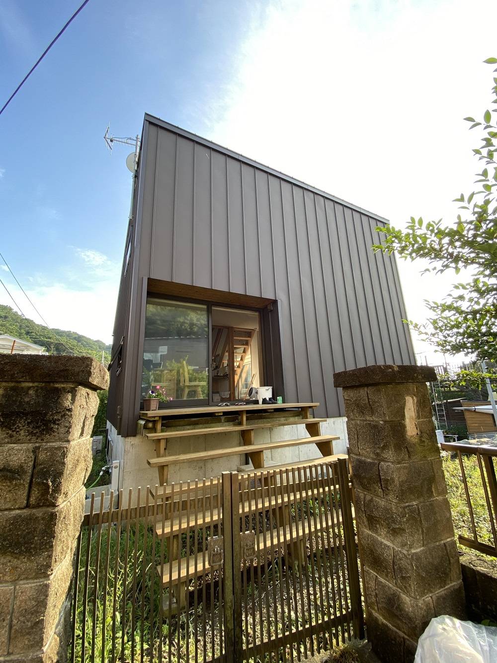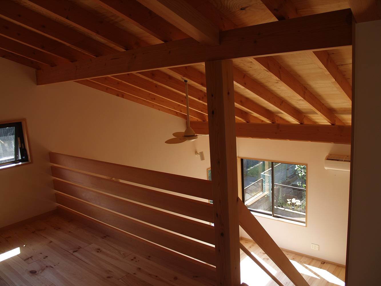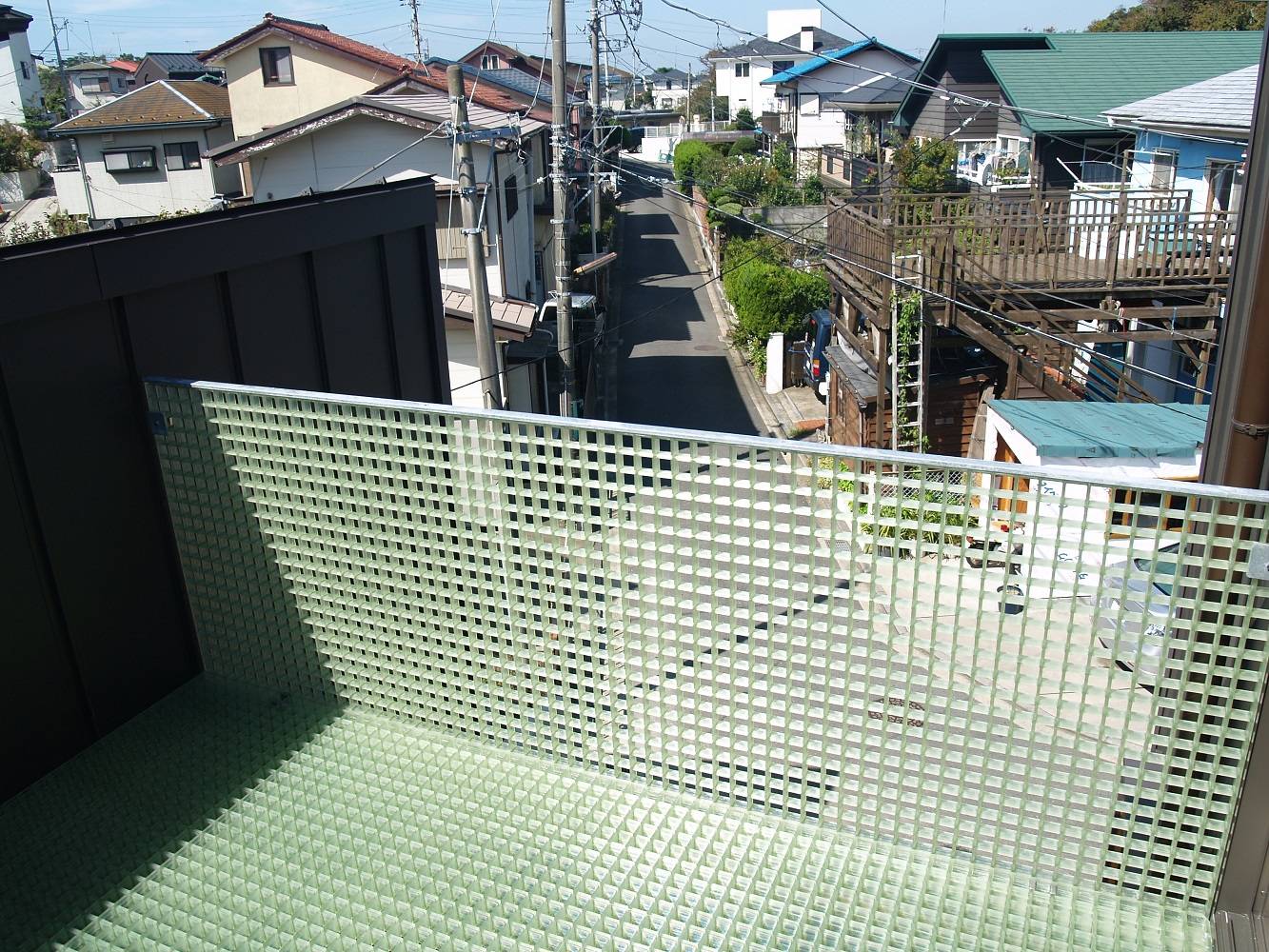 葉山海岸へ10分程の山あいの敷地。家族4人のための混構造の住まいです。敷地は道路より1.5m程高くなっているため、道路レベルからアプローチできる半地下の玄関として同レベルに音楽室と客間を設けました。その上は一部2階の木造としています。1階にはパティオ、2階には展望テラスがあり、十分な採光と通風を確保しました。1階は、天井の高いリビングを中心にダイニングキッチン、寝室、水回り、2階には子供部屋を配置しました。コンクリートで囲まれた防音性のある音楽室は、ご主人がギターを弾きながら作曲する趣味の部屋で、ご近所を気にすることなく思う存分楽しんでいます。