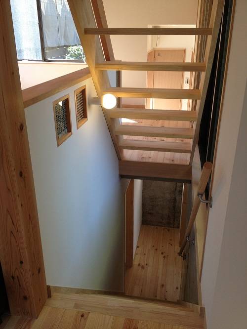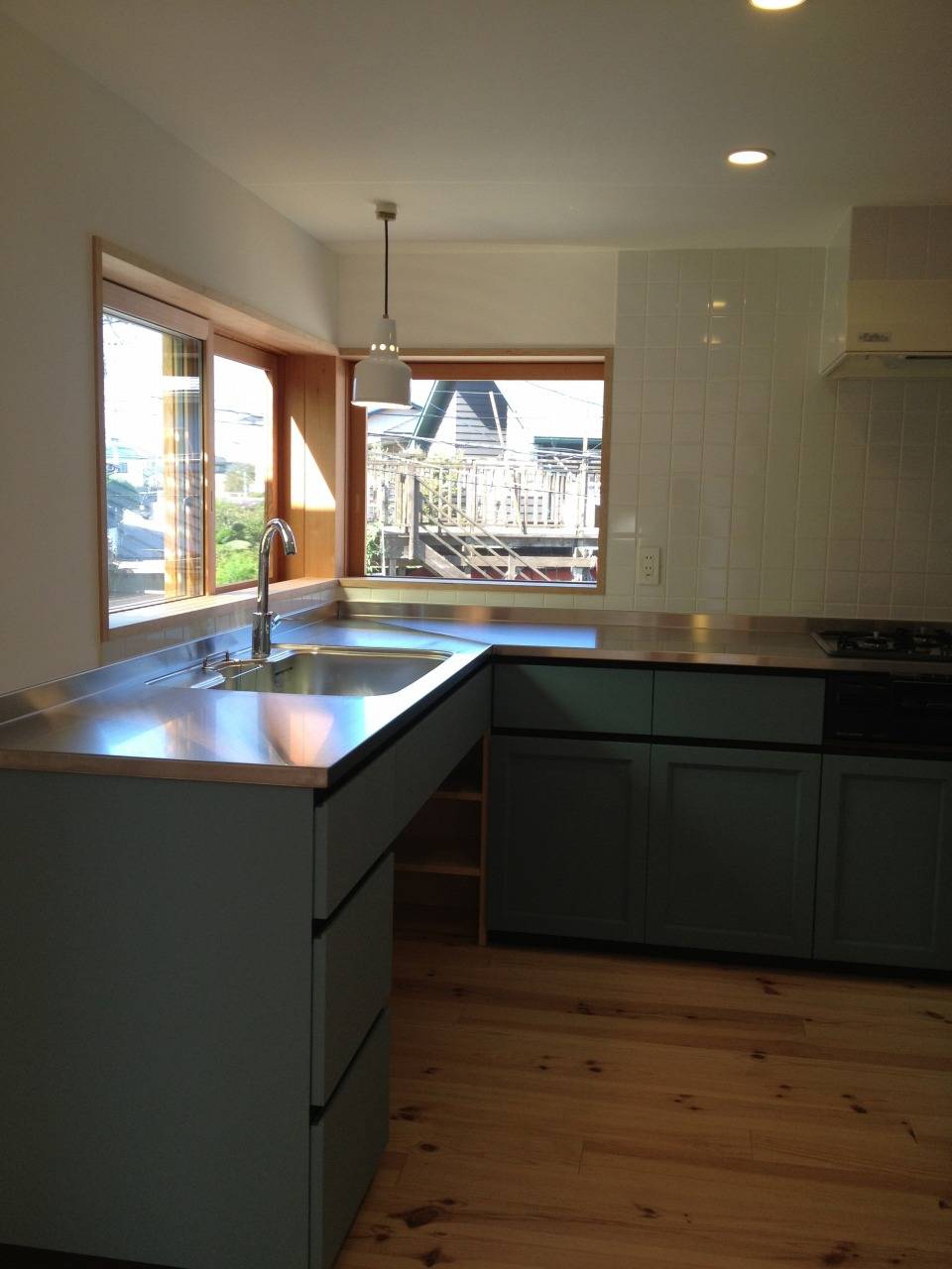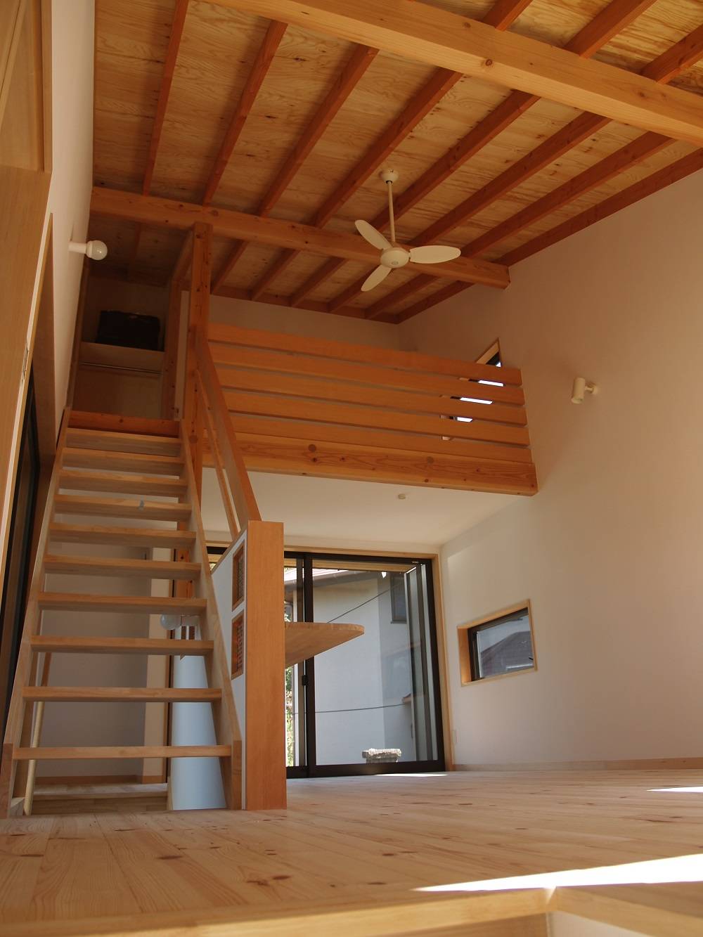 葉山海岸へ10分程の山あいの敷地。家族4人のための混構造の住まいです。敷地は道路より1.5m程高くなっているため、道路レベルからアプローチできる半地下の玄関として同レベルに音楽室と客間を設けました。その上は一部2階の木造としています。1階にはパティオ、2階には展望テラスがあり、十分な採光と通風を確保しました。1階は、天井の高いリビングを中心にダイニングキッチン、寝室、水回り、2階には子供部屋を配置しました。コンクリートで囲まれた防音性のある音楽室は、ご主人がギターを弾きながら作曲する趣味の部屋で、ご近所を気にすることなく思う存分楽しんでいます。