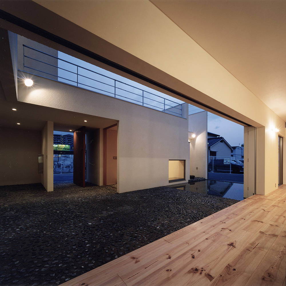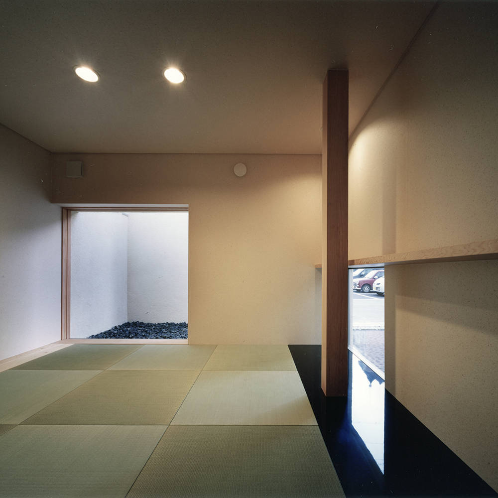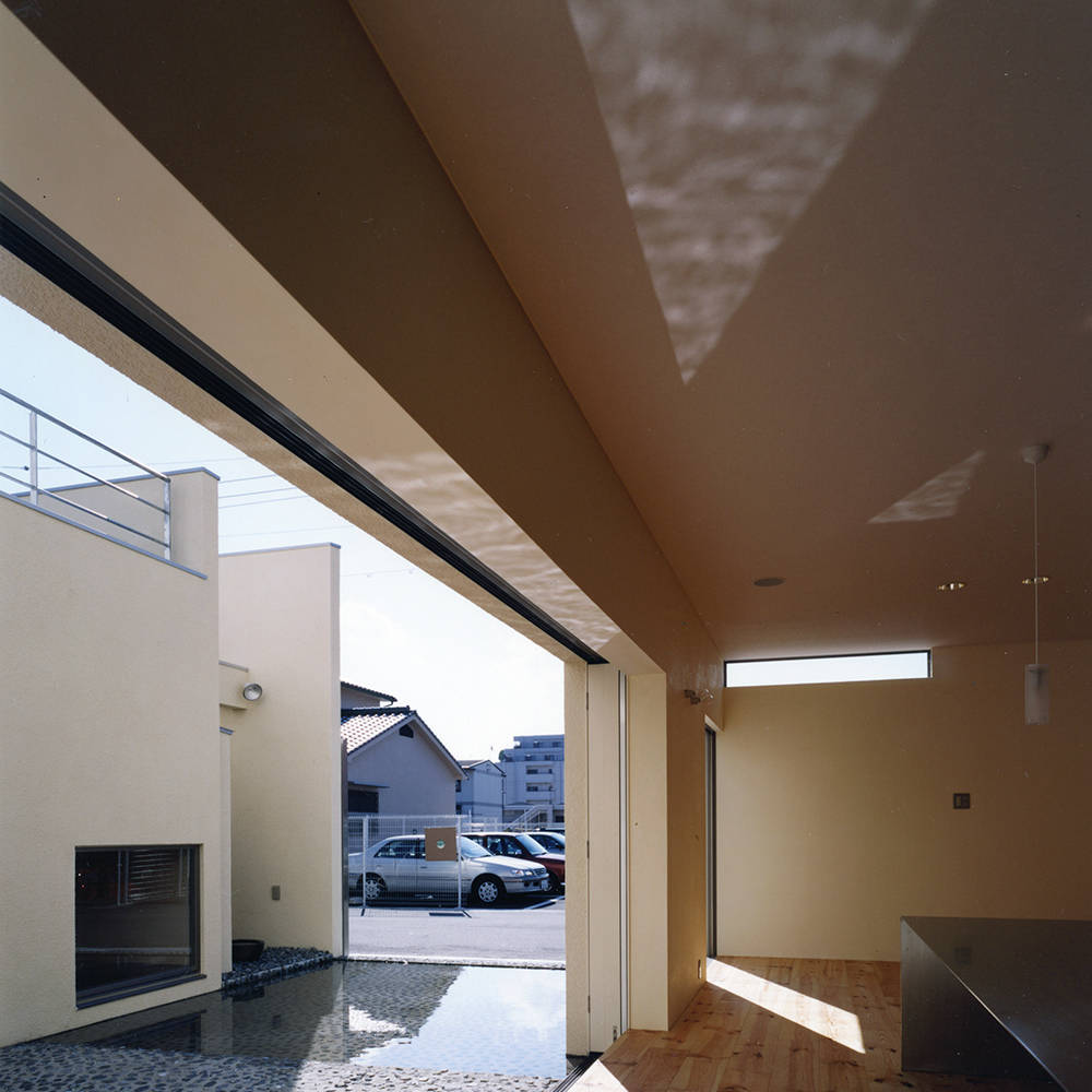 空庭に降り注いだ雨水は樋をつたって、和室前の光庭の石臼に落ち、あふれ出た水が中庭にある水盤へ。床続きで作られた水盤は、3m 四方でわずか5cm の深さと浅いもので、雨が降れば水はいつも綺麗に循環します。中庭の水盤は大きな演出効果を持つと同時に、雨水利用のエコロジー的な潤いがあり、この家のプライバシーも守ってくれています。