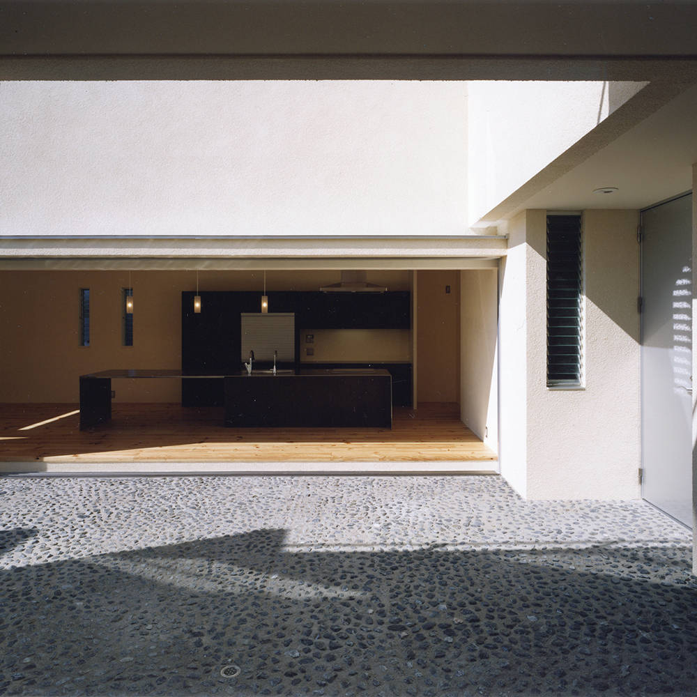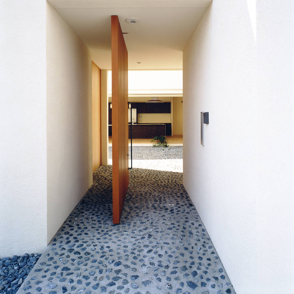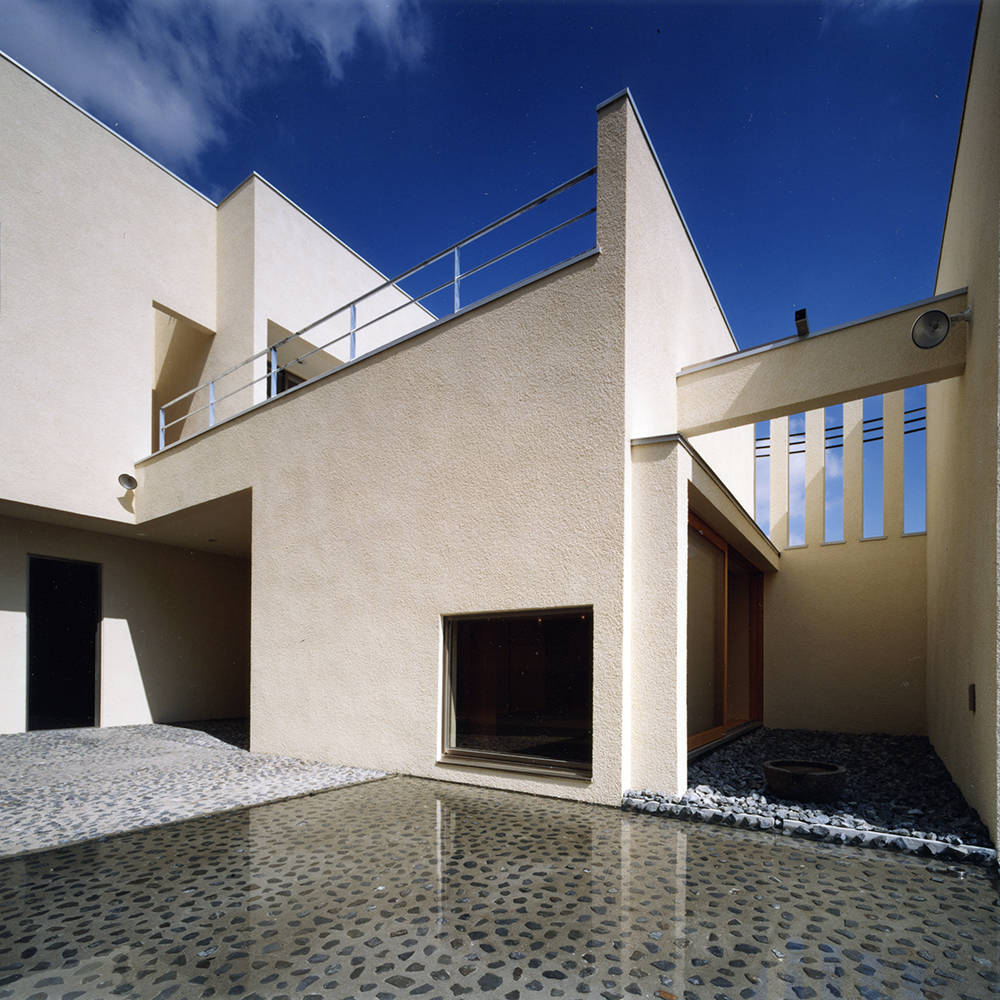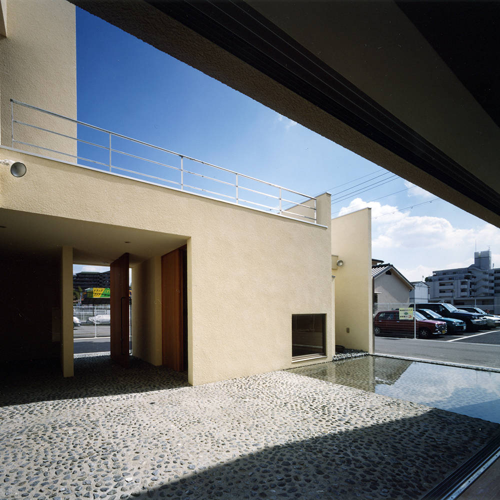 空庭に降り注いだ雨水は樋をつたって、和室前の光庭の石臼に落ち、あふれ出た水が中庭にある水盤へ。床続きで作られた水盤は、3m 四方でわずか5cm の深さと浅いもので、雨が降れば水はいつも綺麗に循環します。中庭の水盤は大きな演出効果を持つと同時に、雨水利用のエコロジー的な潤いがあり、この家のプライバシーも守ってくれています。