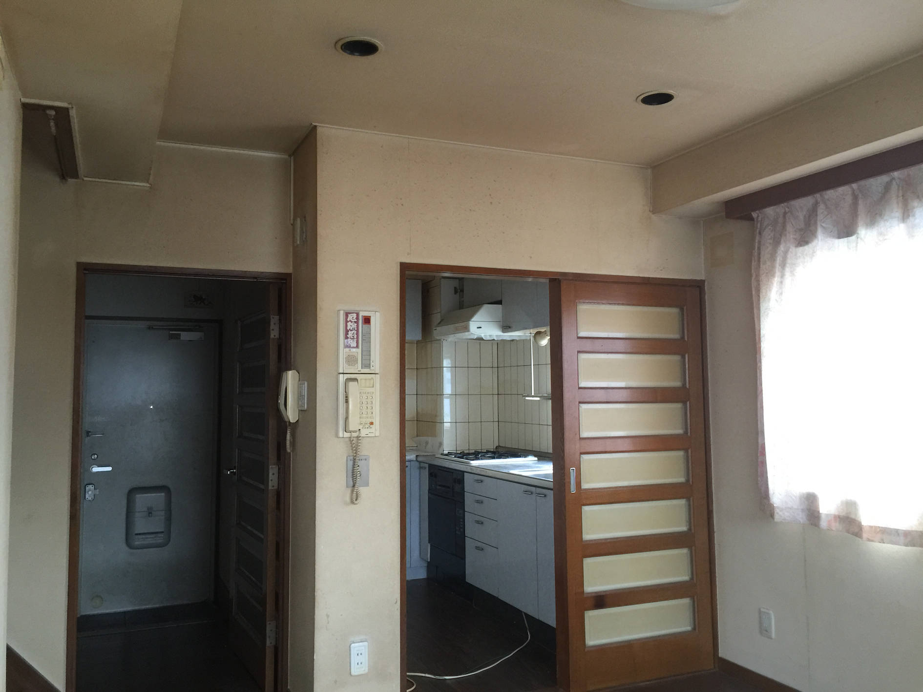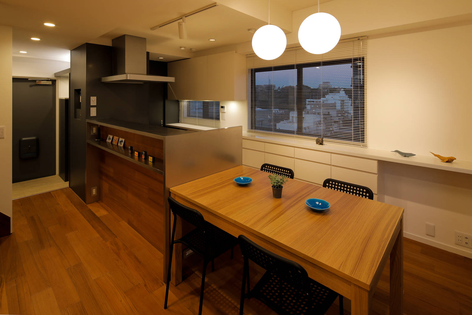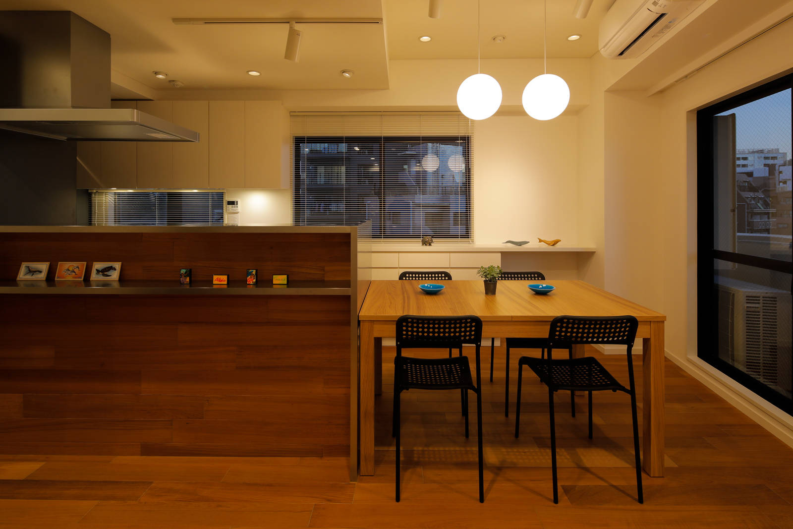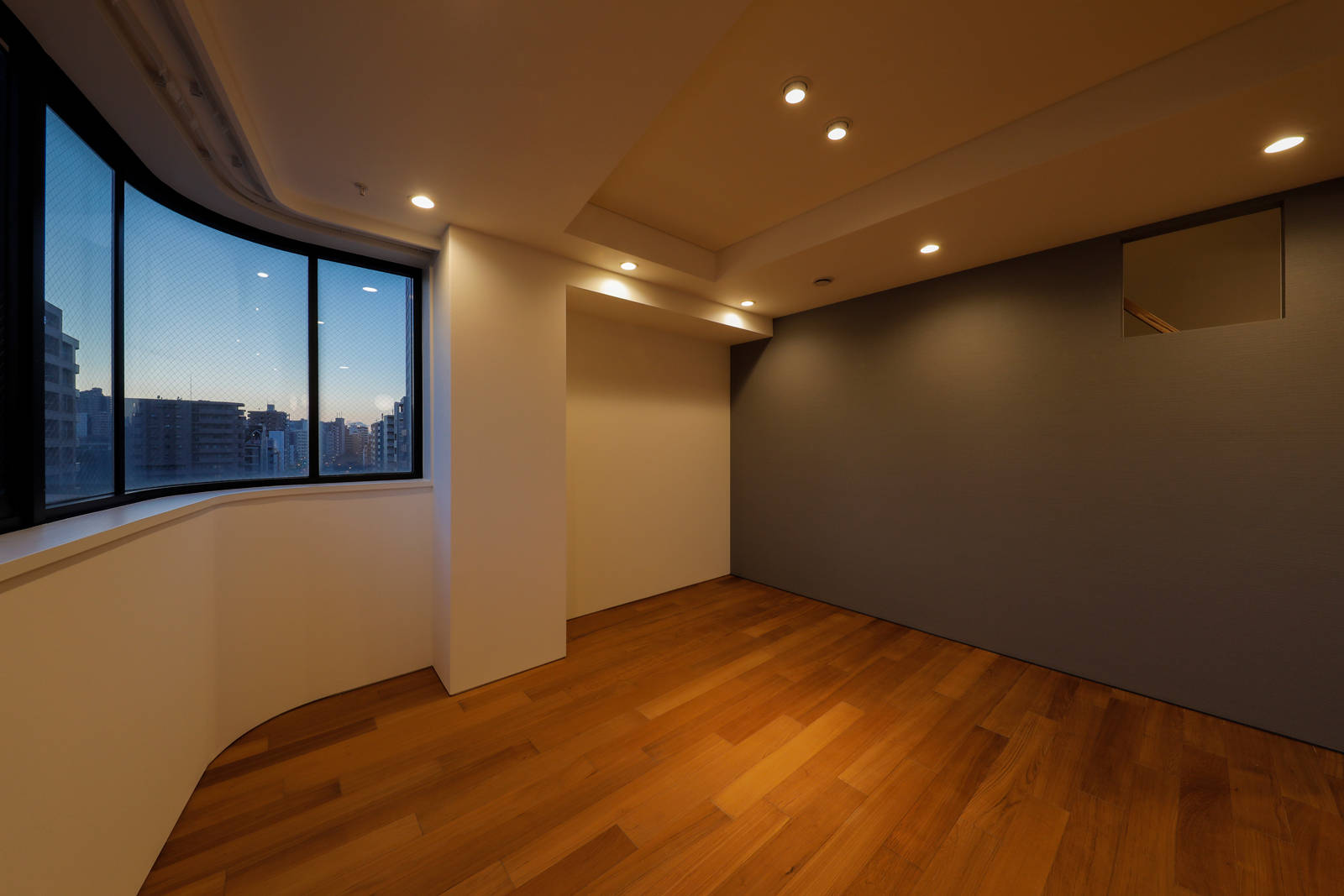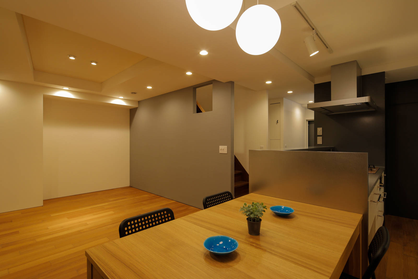 幹線道路沿いの8階建てペンシルビル最上部メゾネットの改修計画。 改修前は上下層ともに細かな部屋に間仕切られて窮屈感があった為、新たなオーナーの家族構成や将来を見通したライフスタイルから、下層をキッチンを中心とする見通しの良い家族のパブリックな空間、上層をプライベートな個室として再構成した。