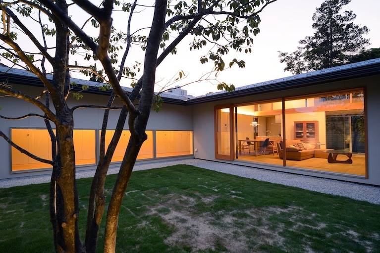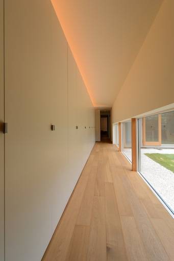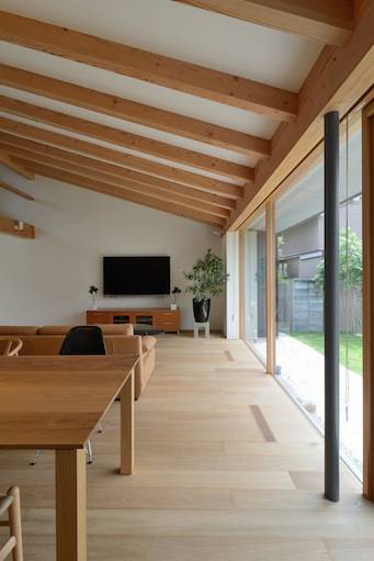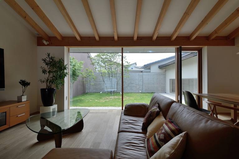 プランはザックリと敷地を三分割し道路から一番手前はガレージと玄関に、真ん中のゾーンは道路面から塀で囲った中庭にして一番奥のところにロフトのあるLDKを配置するという簡潔(シンプル)な構成です。 ロフトと繋がった吹抜のあるLDKは上下方向に適度な開放感があり、 さらに北庭と南庭にも面しているので水平方向にも視線が抜けて風も通り抜ける。そんな気持ちの良いLDKはこの家の存在の中心となりました。
