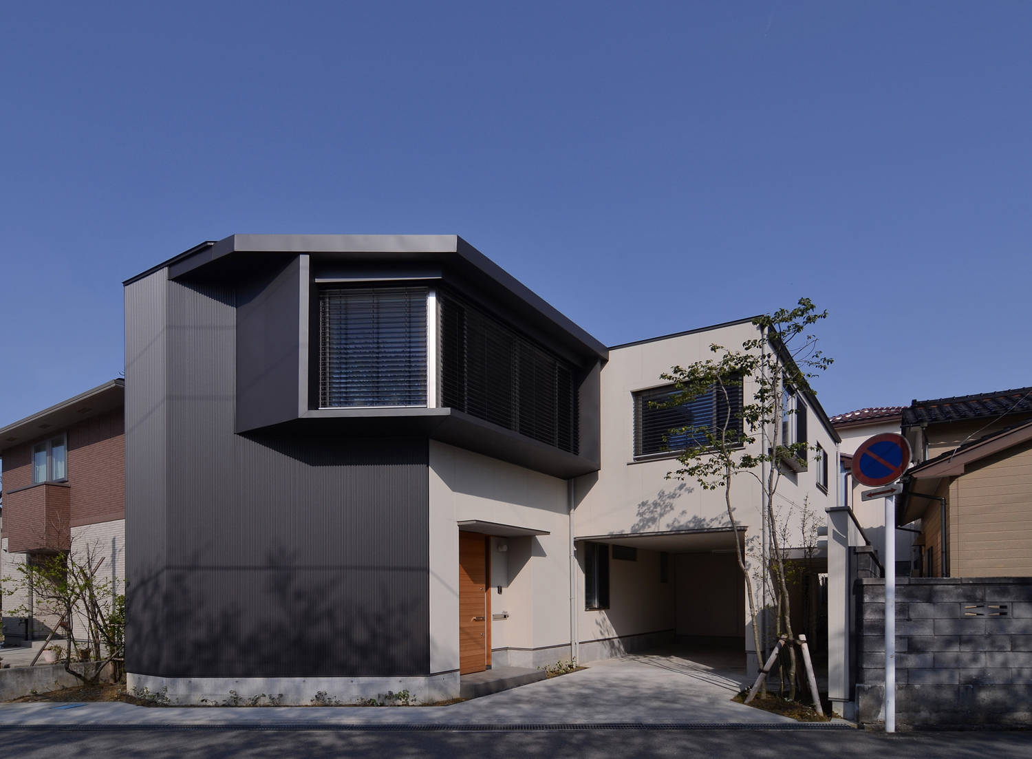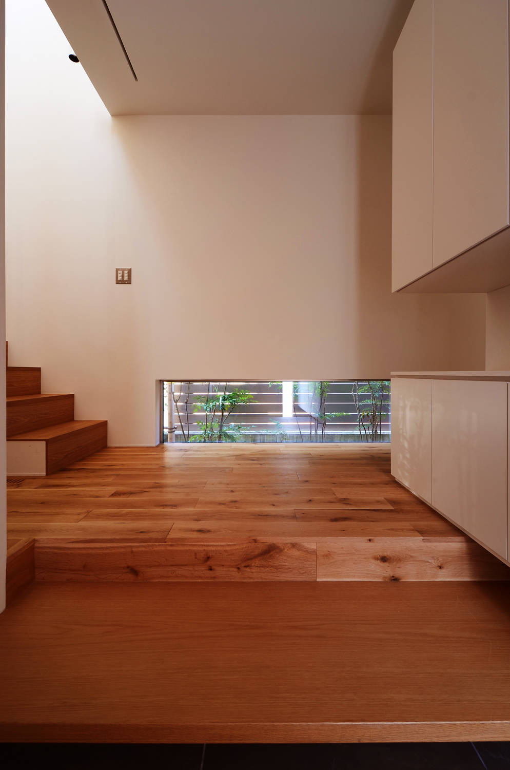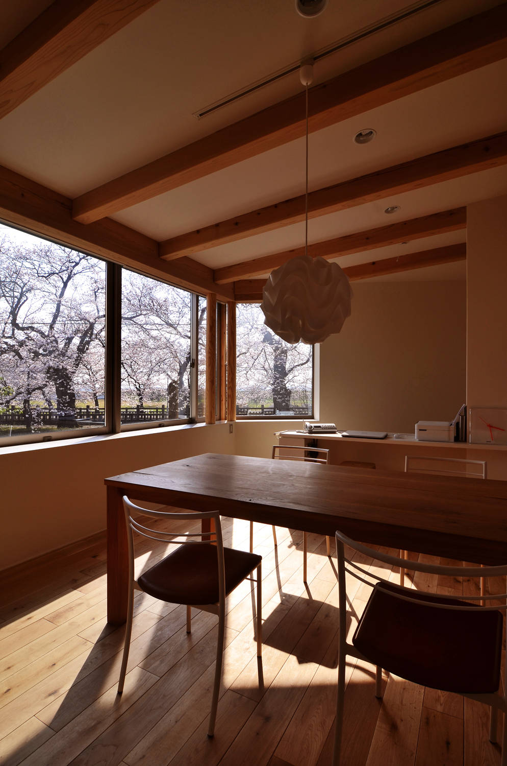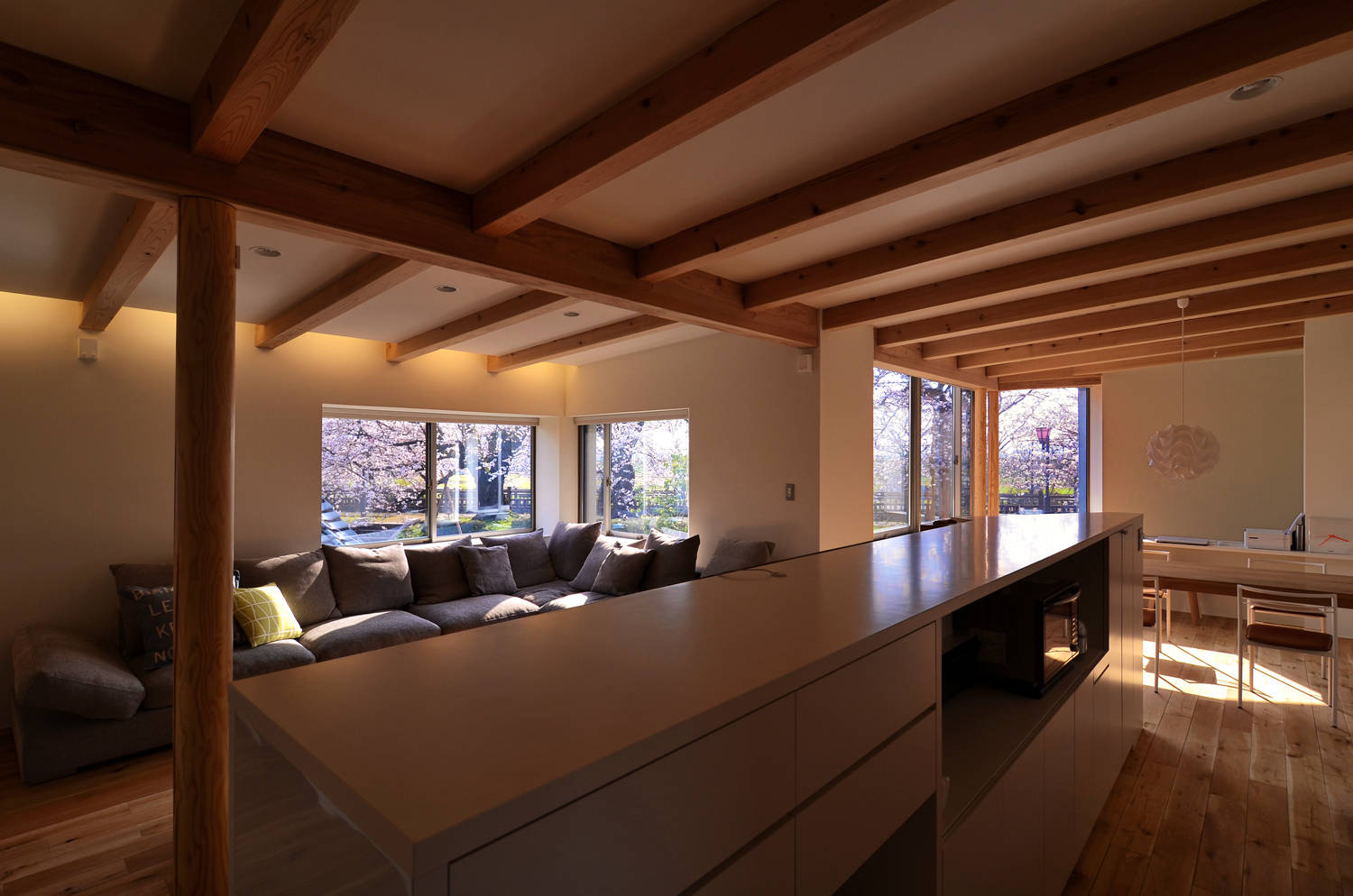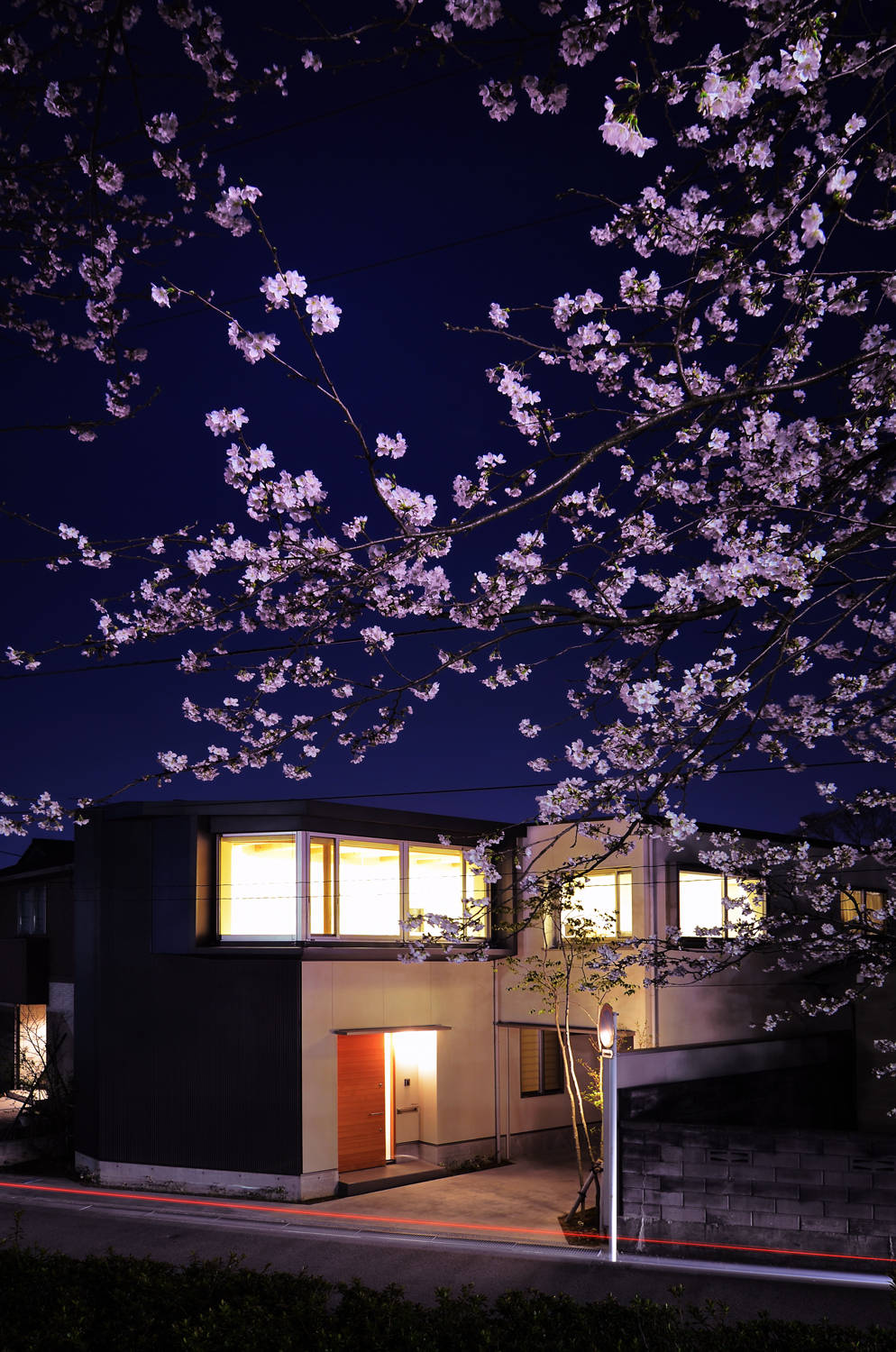 実現した形は前面の敷地の三角形の部分に家が半島のように突き出し、その2階にLDKを配置するというものです。隣家にもある三角形部分には家が建ってはいませんので、ここにLDKを配置することで両隣家からの視線を気にすることがなく、まるまる桜並木の景観を眺めることができます。不動産価値の低いと思われた三角部分が、実は桜並木を取り込むという主題の基では大きな財産であったという、逆説的ですが、実にありがたい形状だった訳です。2階にできた花見台のような桜並木を取り込んだLDK空間は家族の生活の中心として、これからさまざまな思い出のシーンを刻んでくれることでしょう。