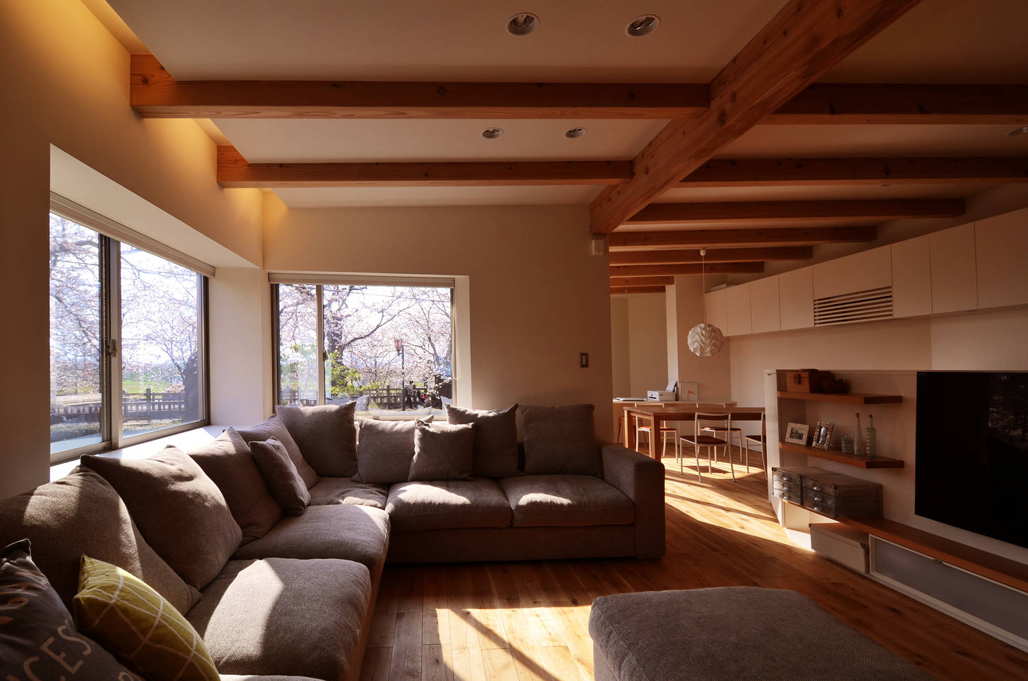 道路をはさんで敷地の向かいには大きく育った桜並木の堤が続いている。そんなステキな環境での住宅プロジェクトが完成しました。