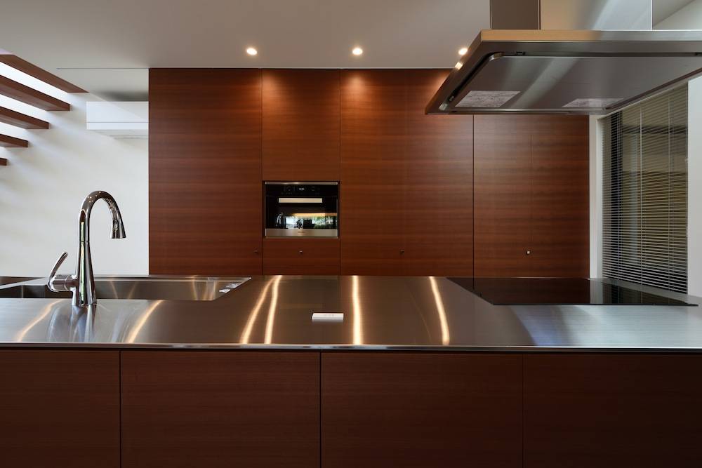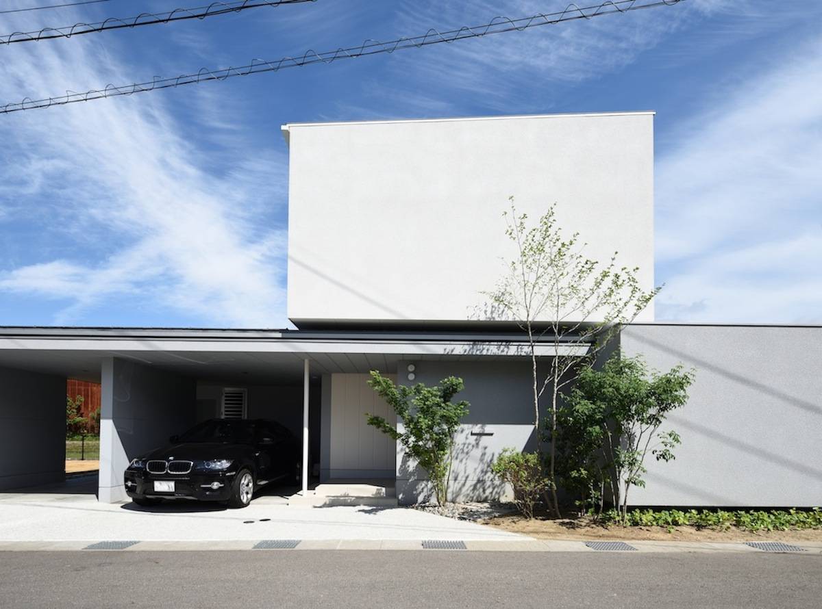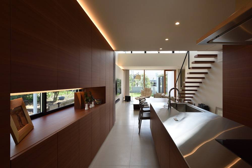 この家はリビングから15mも外に伸びる外部空間(庭)を持っています。さらに全面ガラスとなっている大きな吹抜は光を導き入れるだけでなくここから空へと視線が伸びていきます。大きな開放感のあるリビングがこの家の生活の中心となるようにプランニングされています。これだけ開放感のあるリビングはしかし手のひらに包み込まれるように諸室が周りにレイアウトされているので道路や隣家に対して開けっぴろげということはなくプライバシーは穏やかに守られているのです。