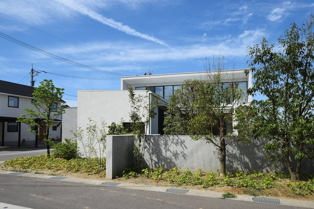 細長く広い敷地から発想して、水平を強調したデザインと各部がつくり出すコンポジション。新たに植樹した木々が成長してこの新しい住宅団地の環境の中で穏やかな景観となっていくことを願っています。