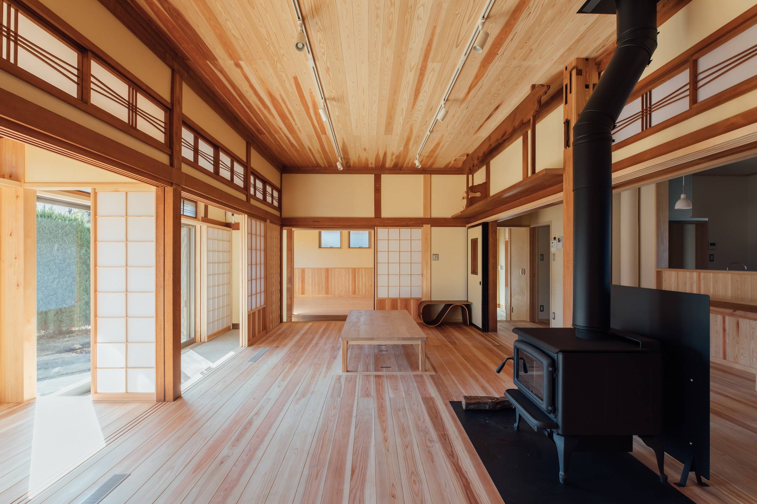 先祖代々続く農家さんの築50年の家の改修。外観は屋根を低く削り、現代的にすっきりとしたフォルムに変更しました。また土壁を残しつつ外側に断熱を施すことで土の蓄熱性を引き出す断熱改修や、屋根面での太陽熱集熱装置「そよ風」の採用、薪ストーブの設置などで温熱環境は格段に向上しました。屋根の瓦はそのまま丁寧におろし、再利用。昔ながらの色むらのあるいぶし瓦は、今や欲しくても作っているところがない貴重な産物です。昔の良き風情を残しながら現代の技術とデザインを付加する、空間と資源の有効活用という意味からも、改修は今後ますます重要になると思います。