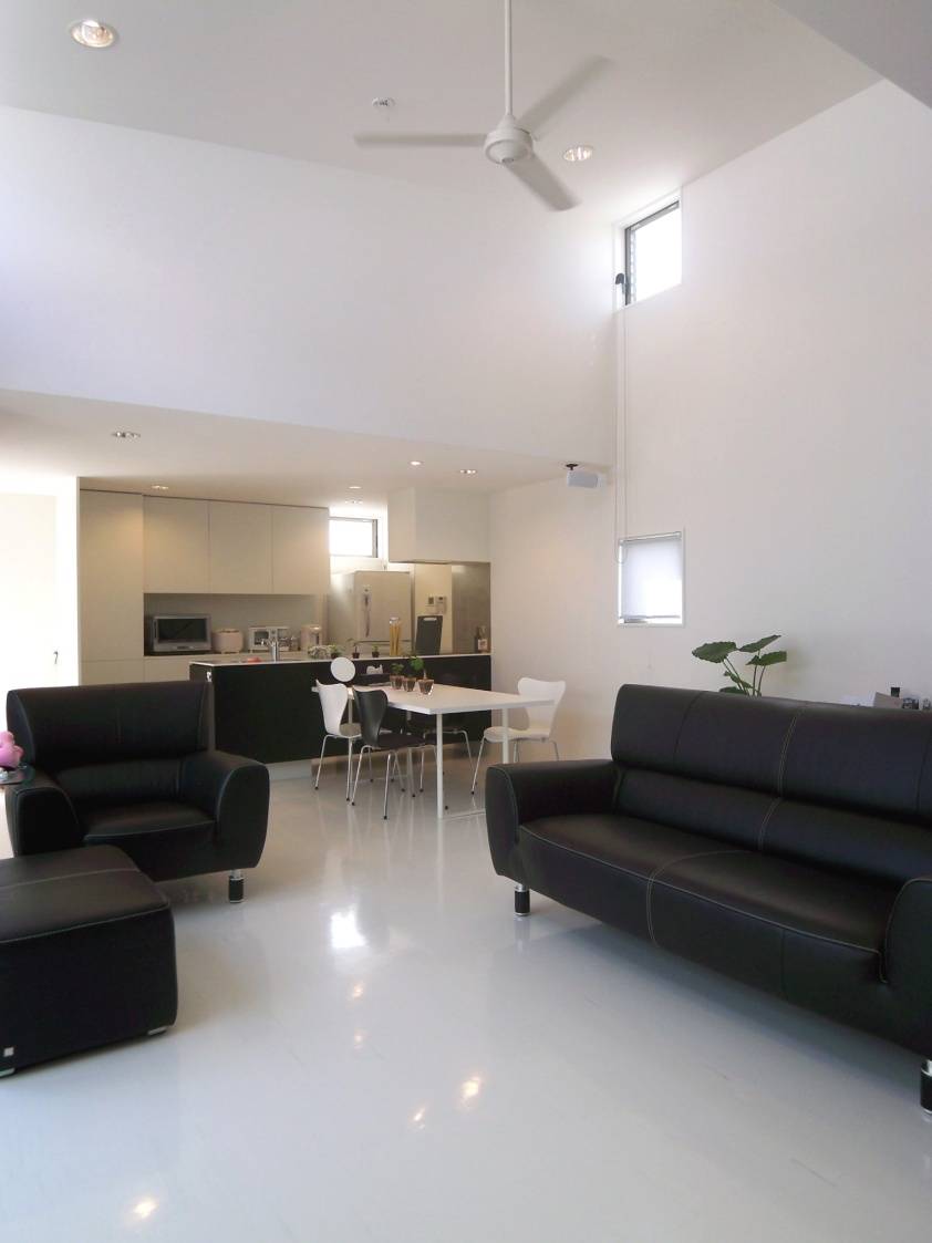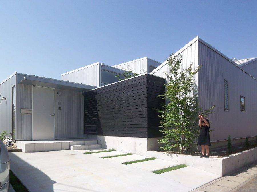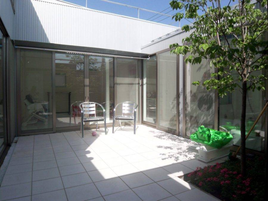 開発が進むニュータウン内のやや茫漠とした住宅地にある、56坪の敷地です。 リビングルーム、子供部屋、浴室で中庭を囲む、コの字形のプランになっています。周囲からの視線を気にすることなく暮らせる中庭型の家は、季節風や砂埃からもガードしてくれる効果があります。