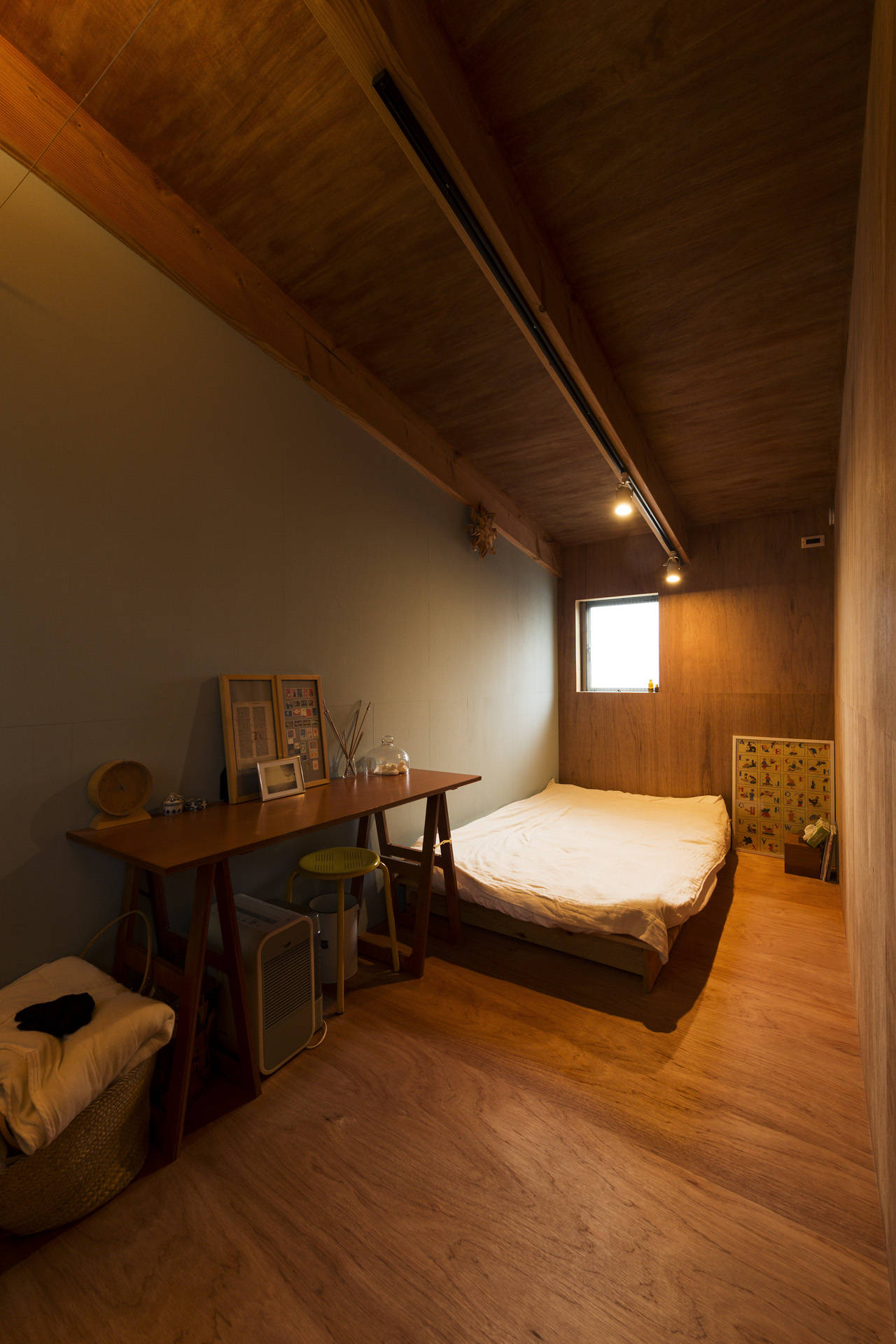 ケヤキは樹高20mを超えるため、通常の窓の位置では枝振りを望むことはできない。そのため1階リビングの天井高さを3.5mとし、そこにハイサイドの大きな窓を開けている。